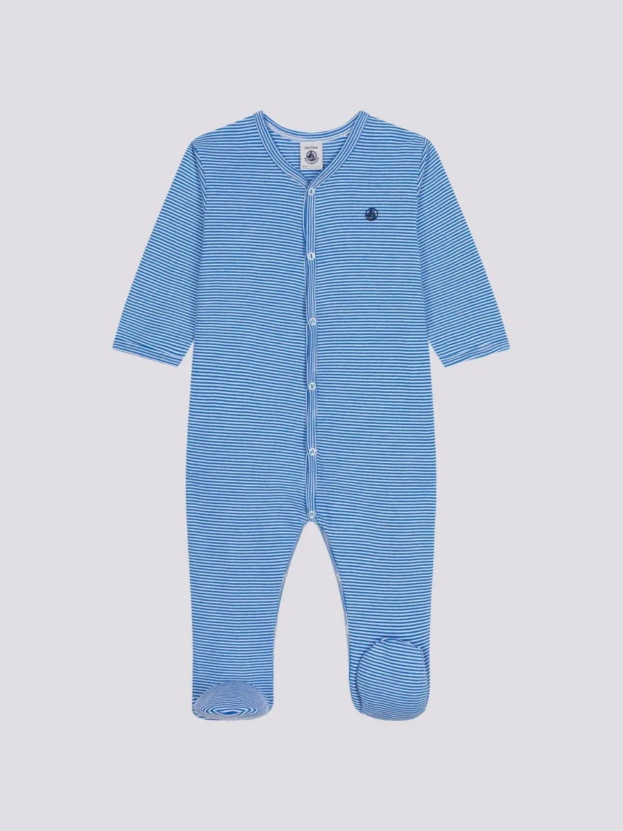 Tutina pigiama unisex a costine, il tessuto emblematico di Petit Bateau. Apertura con bottoni automatici sul davanti e all’interno gamba.
