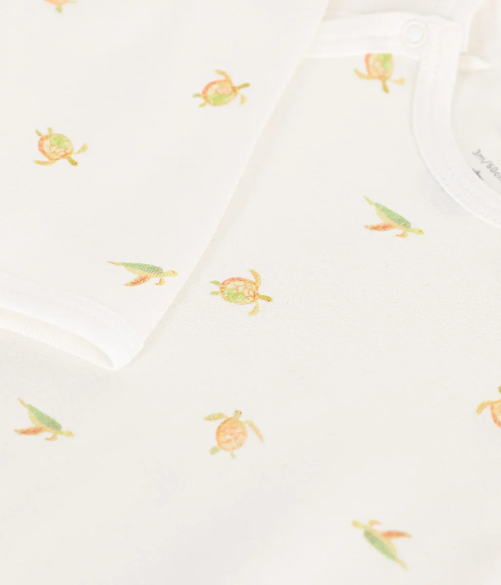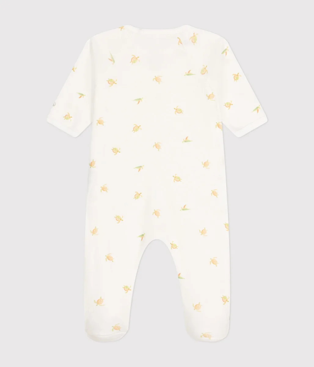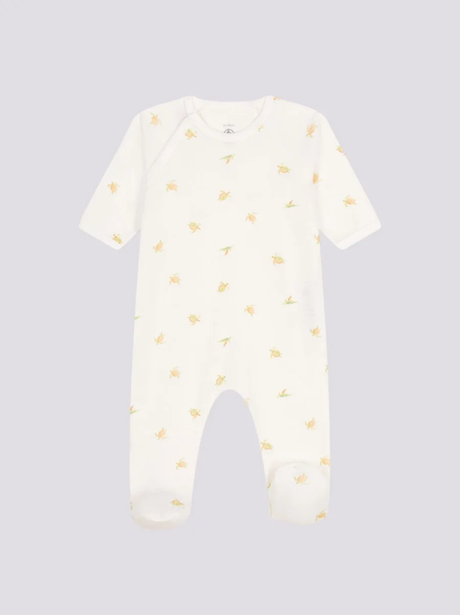 Tutina pigiama unisex a costine, il tessuto emblematico di Petit Bateau. Apertura del pigiama con bottoni automatici sul lato e all’interno gambe.