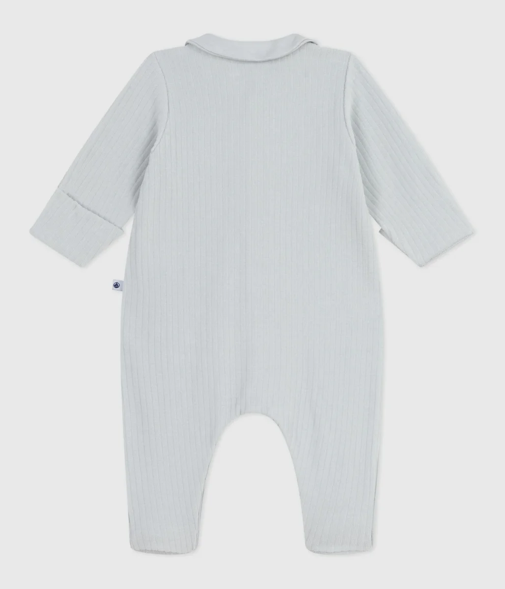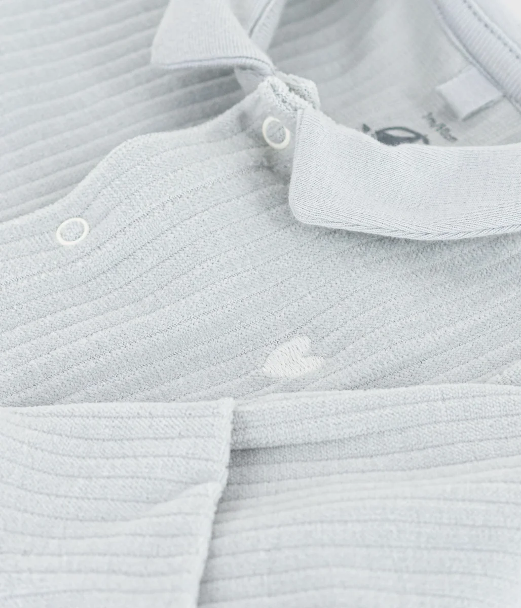 Tutina pigiama unisex in ciniglia bouclé, un materiale caldo e raffinato. Questo pigiama raffinato, con un colletto a polo, un cuore ricamato e muffole integrate, è l’ideale per un regalo nascita.