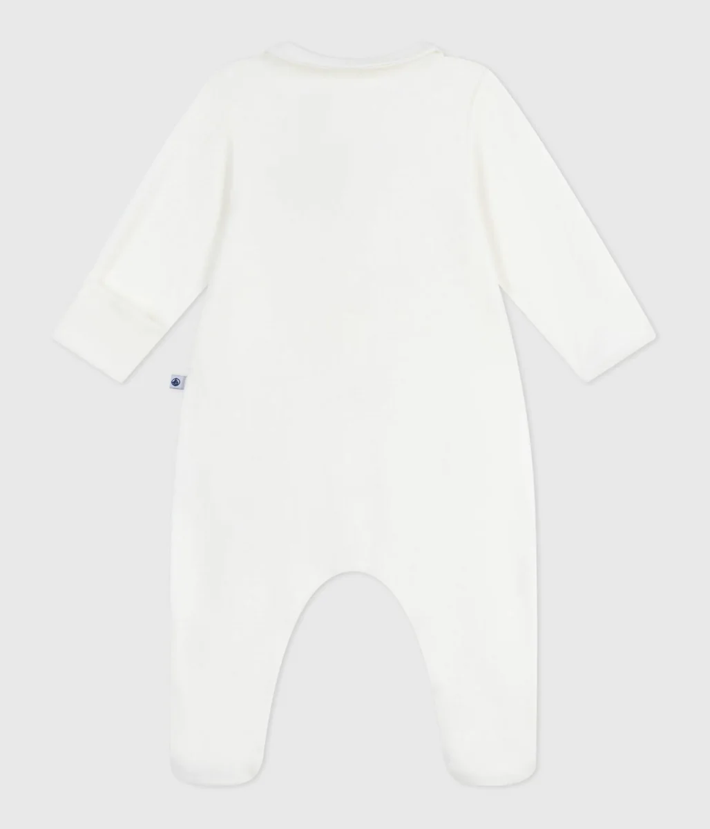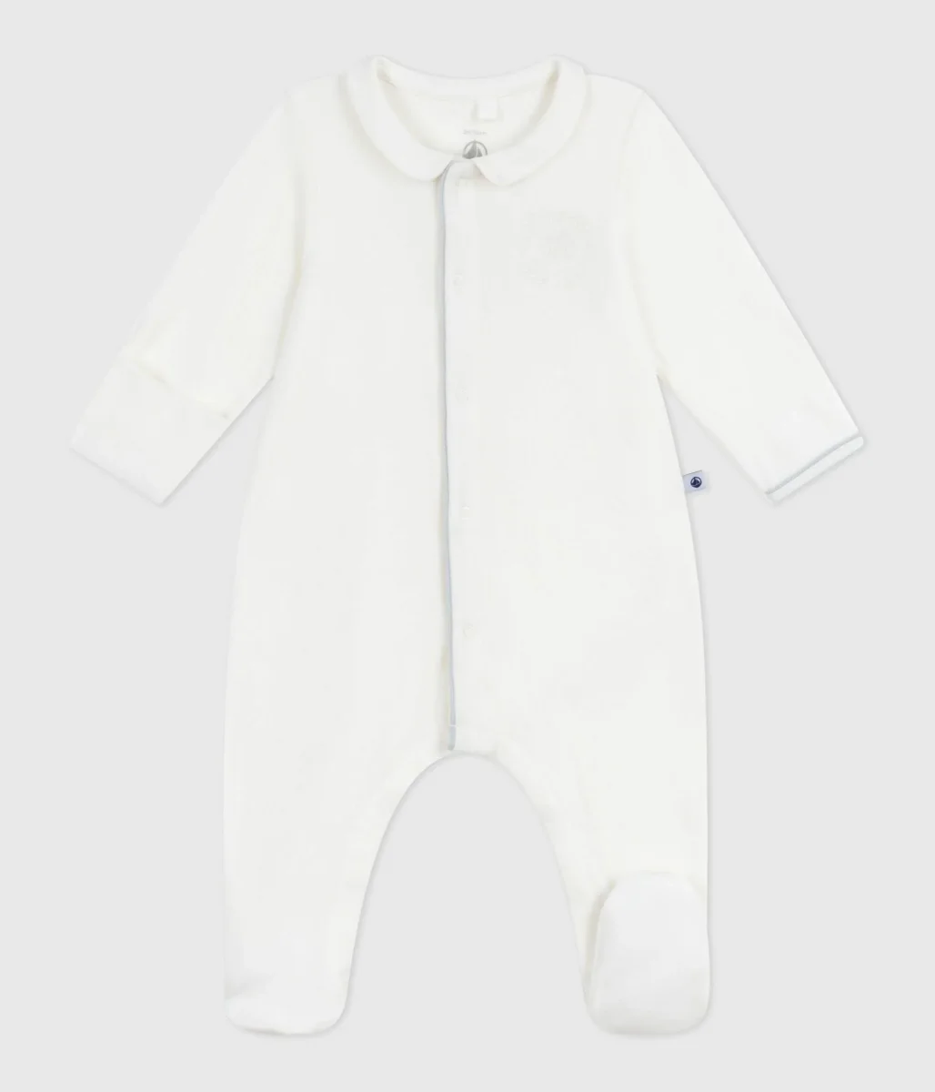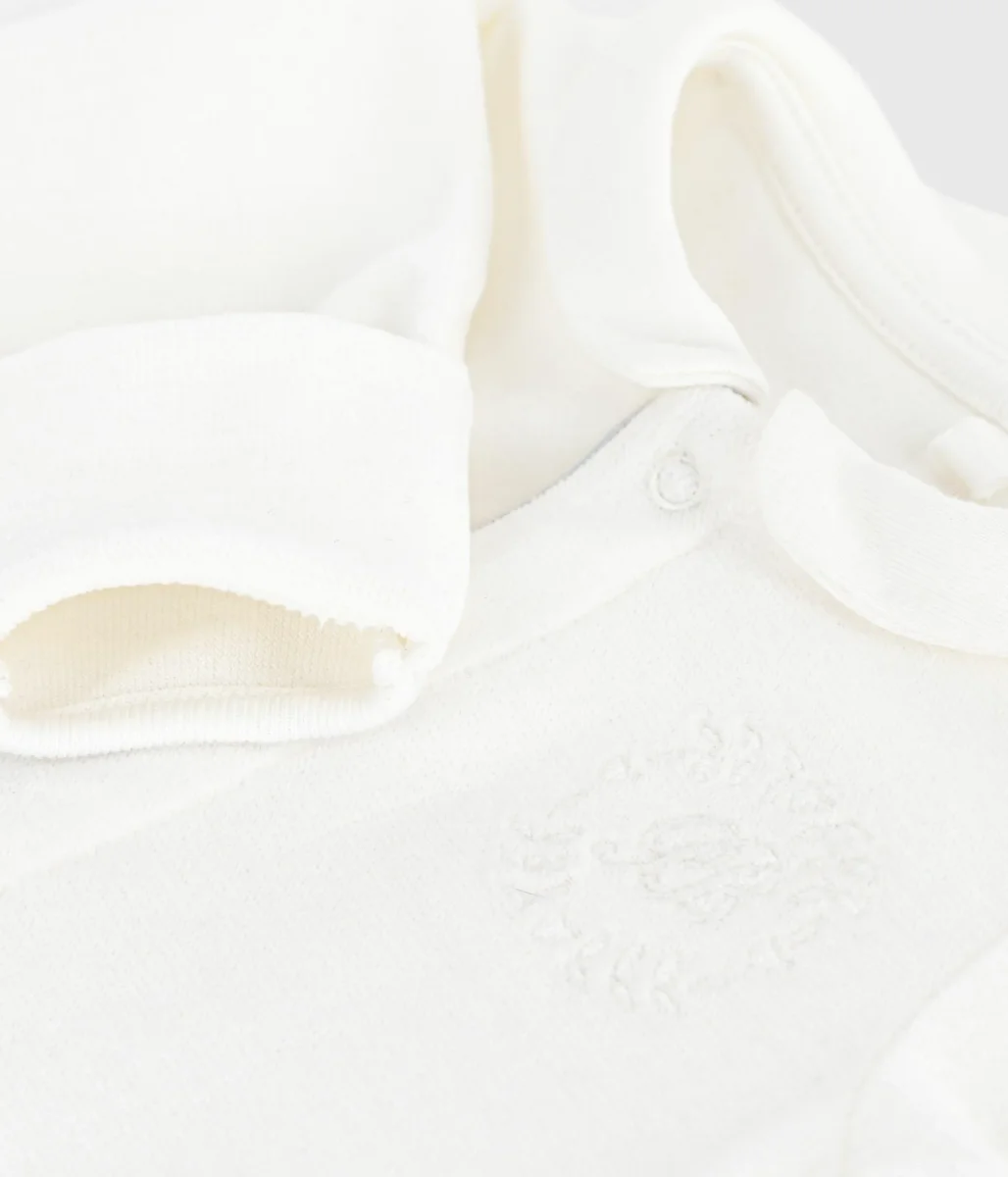Tutina pigiama unisex in ciniglia bouclé, un materiale caldo e raffinato. Questo pigiama raffinato, con un ricamo sul petto, colletto a polo e muffole integrate, è l’ideale per un regalo nascita.