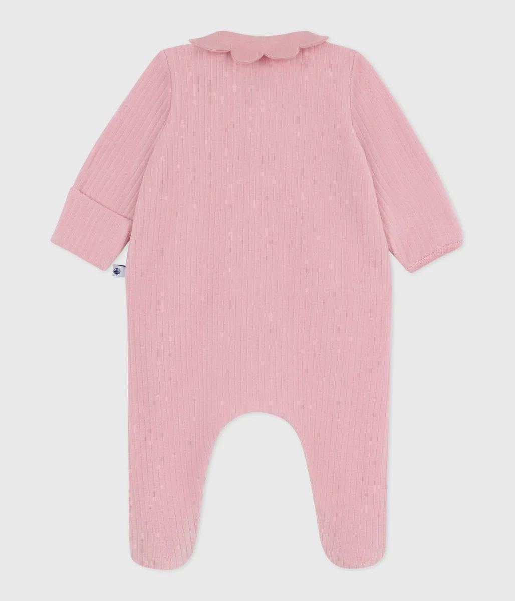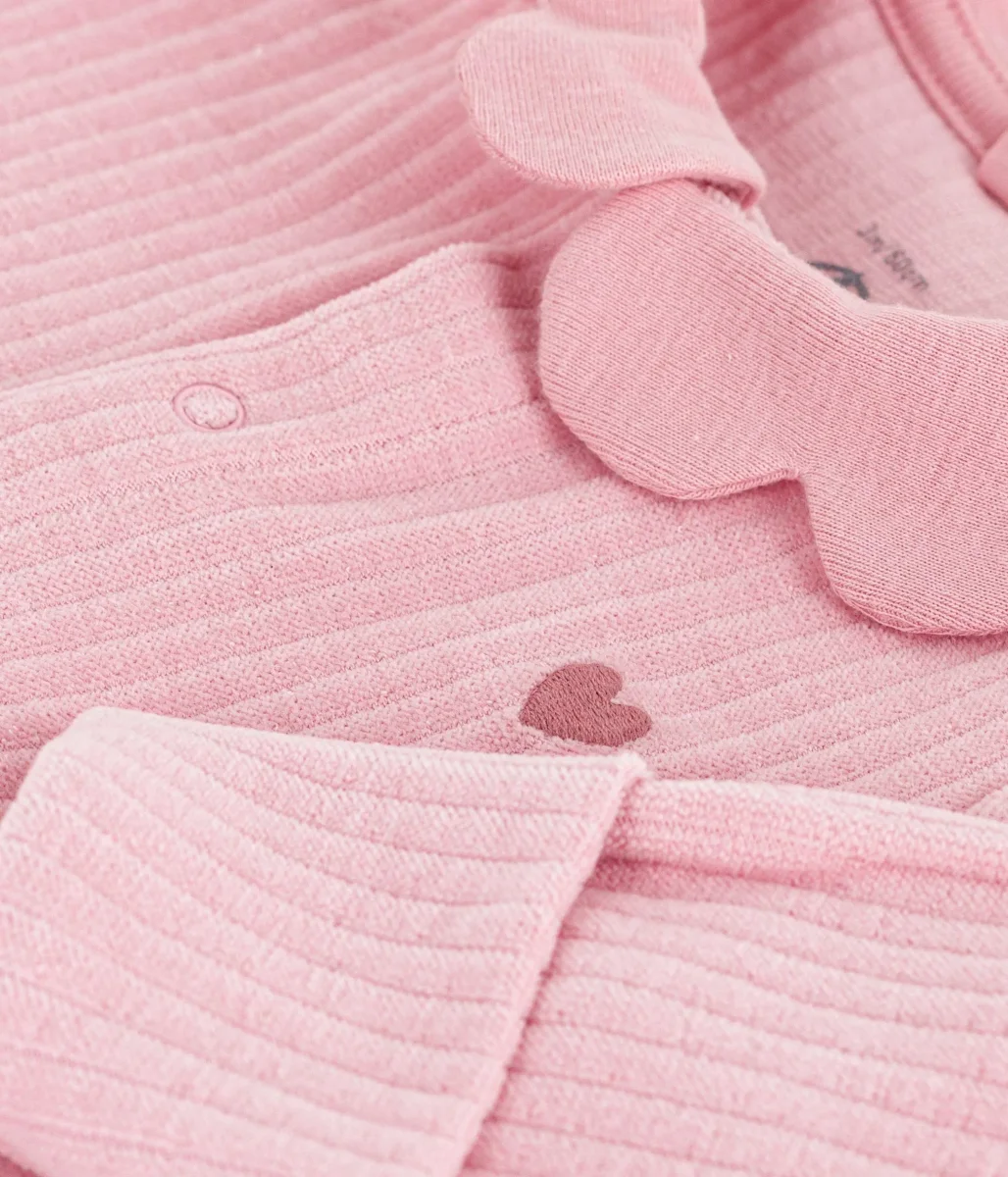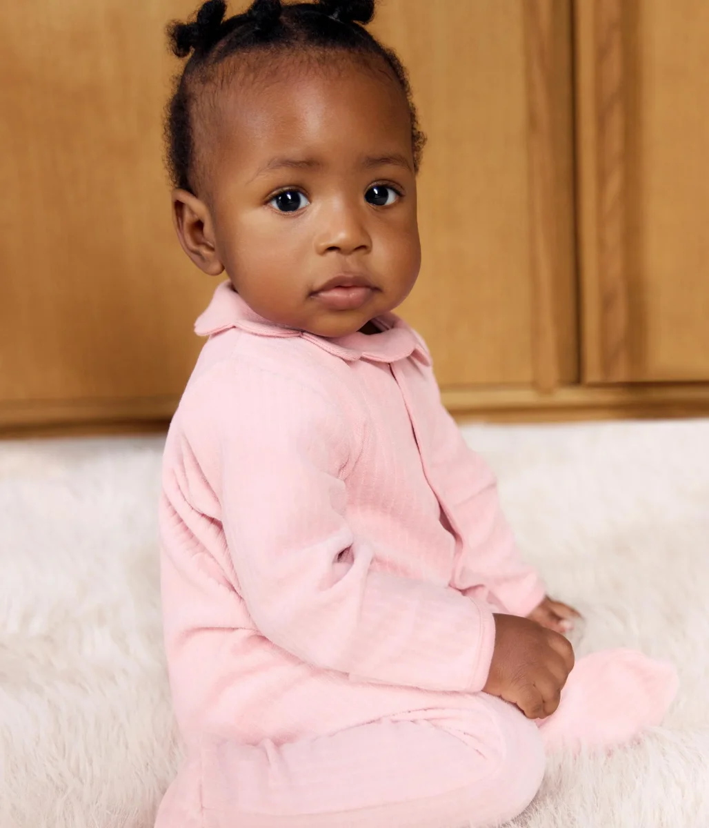 Tutina pigiama bambina in ciniglia bouclé, un materiale caldo e raffinato. Questo pigiama raffinato e femminile, con colletto a petalo e un cuore ricamato, è l’ideale per un regalo nascita.
