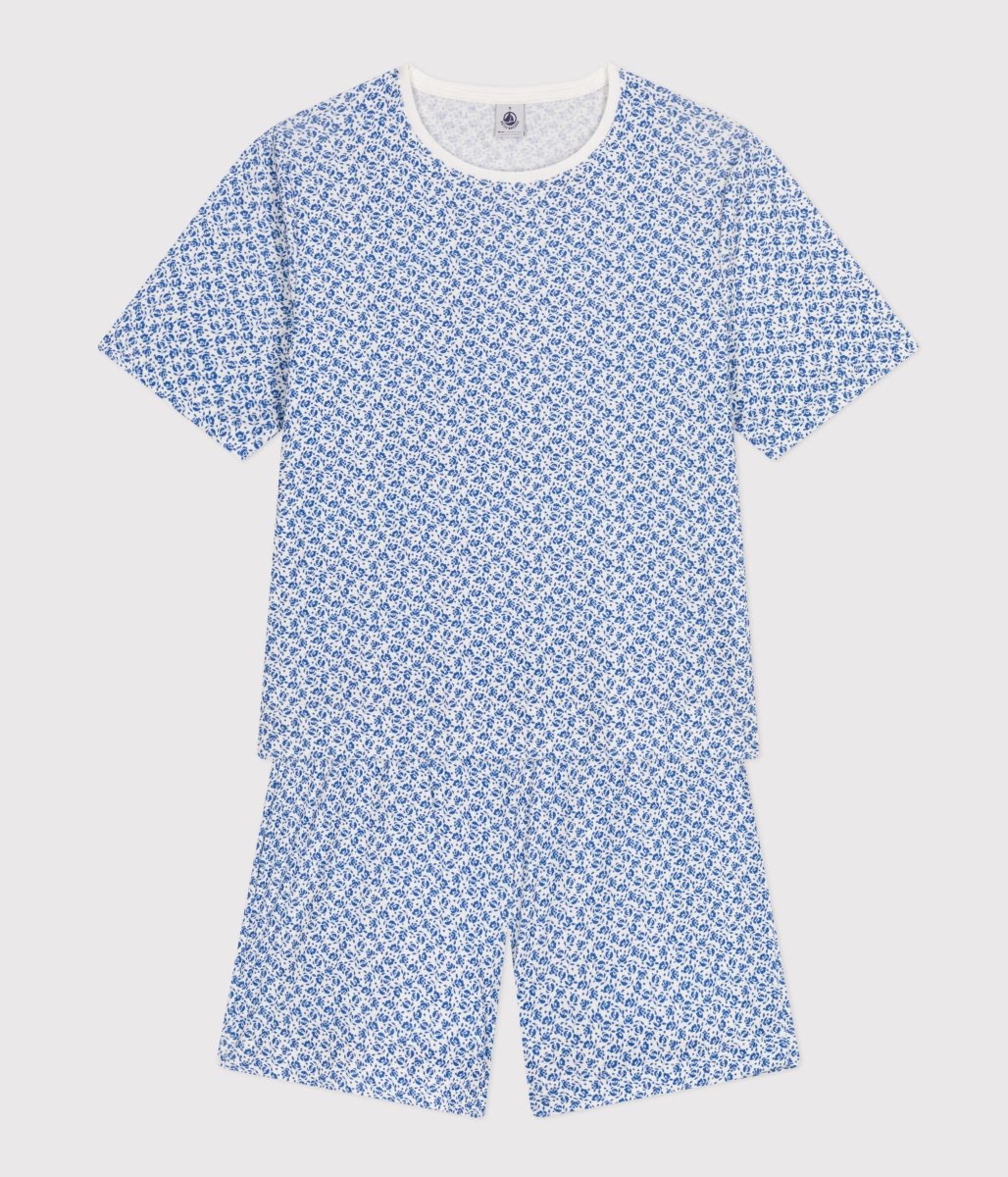 Pigiama corto in costa, il tessuto emblematico di Petit Bateau, con motivi floreali.