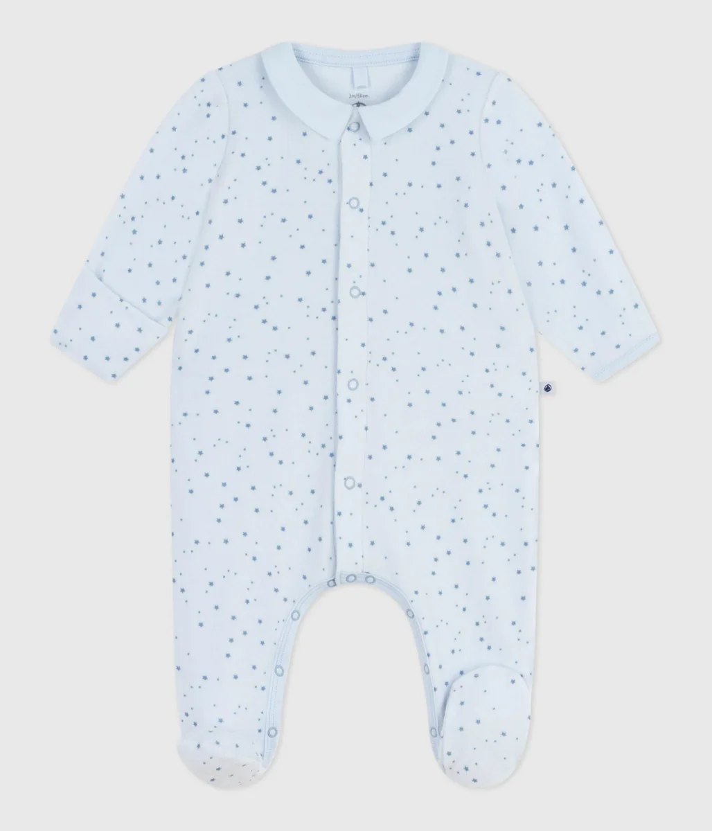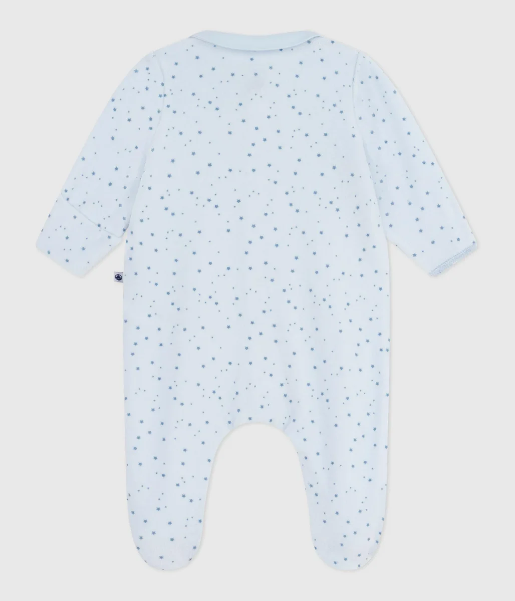 Tutina pigiama unisex in ciniglia bouclé, un materiale caldo e raffinato. Questo pigiama raffinato, con un grazioso colletto e muffole integrate, è l’ideale per un regalo nascita.
