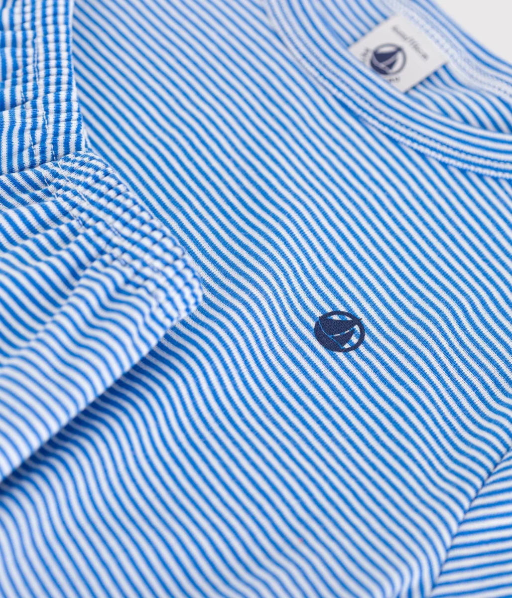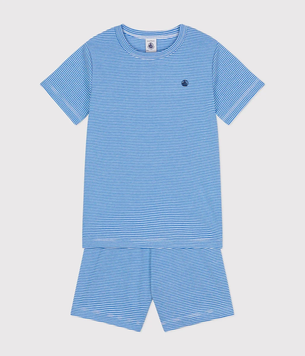 Pigiama corto in costina 1×1 rigata, il tessuto emblematico di Petit Bateau, a garanzia di una perfetta libertà di movimento.