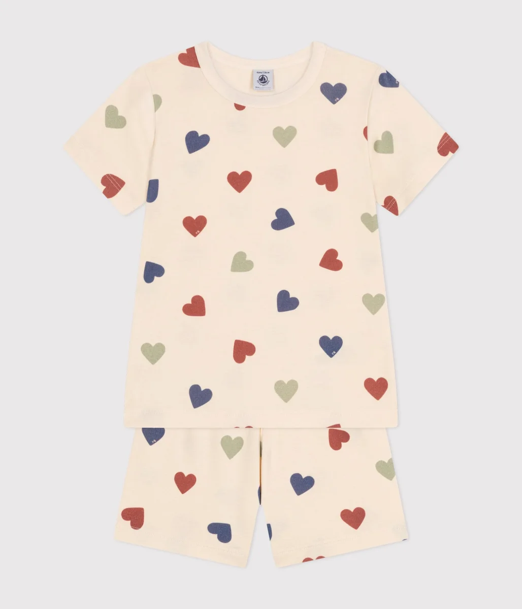 Pigiama corto in costina 1×1 stampata, il tessuto emblematico di Petit Bateau, a garanzia di una perfetta libertà di movimento.