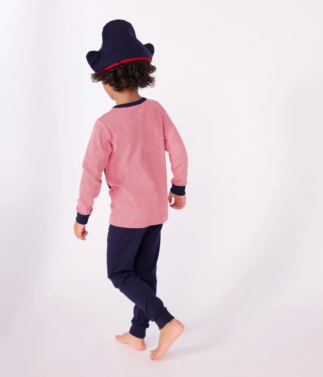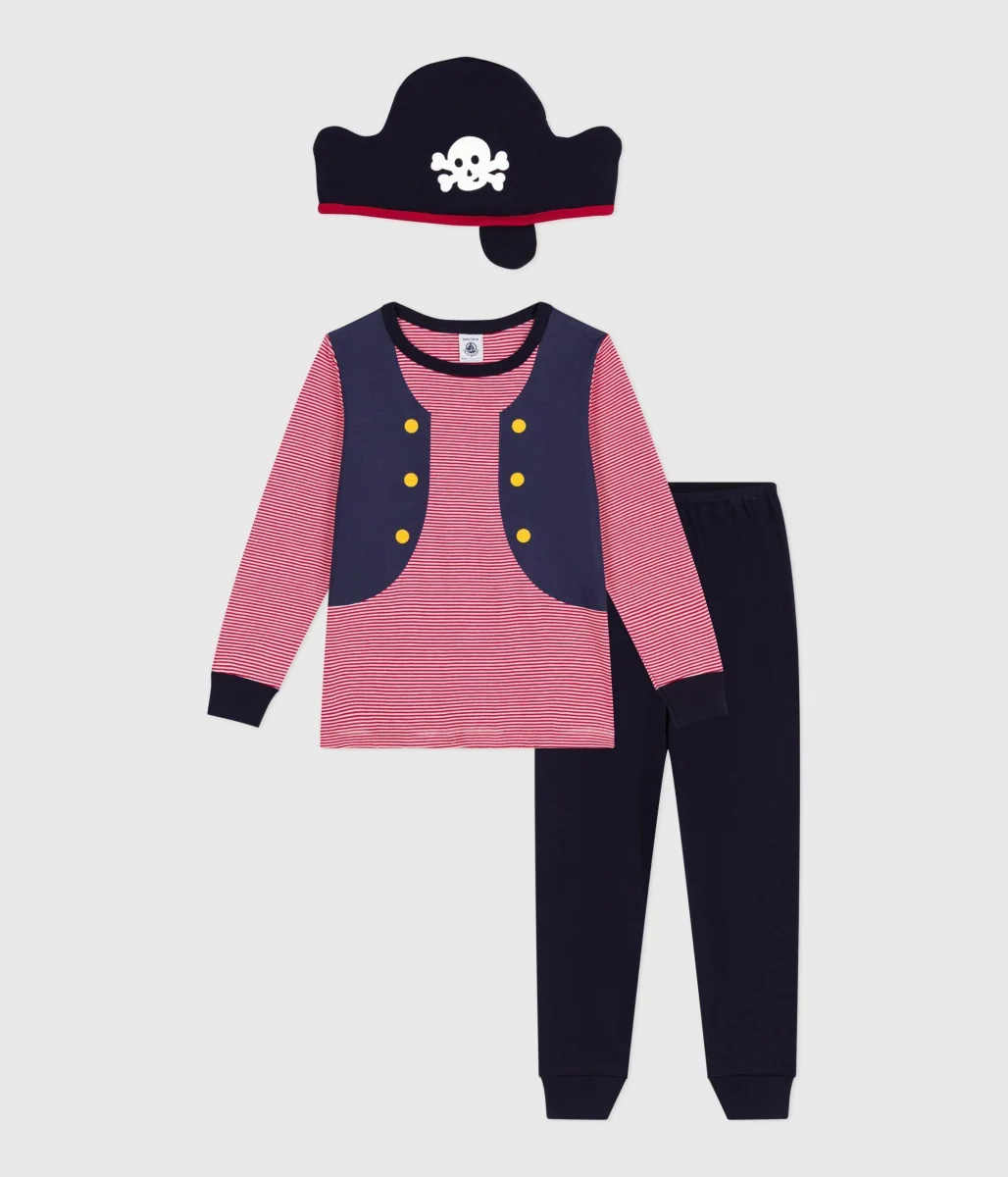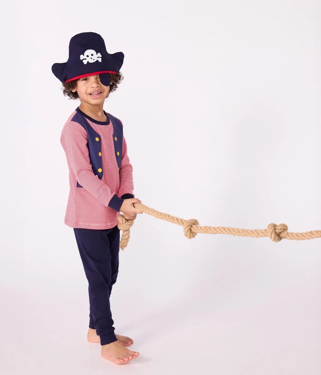 Pigiama e cappello da pirata unisex in cotone a costine 1×1, un materiale elasticizzato e comodo. Pigiama travestimento con cappello da pirata abbinato per rendere pià divertente l’ora della nanna!