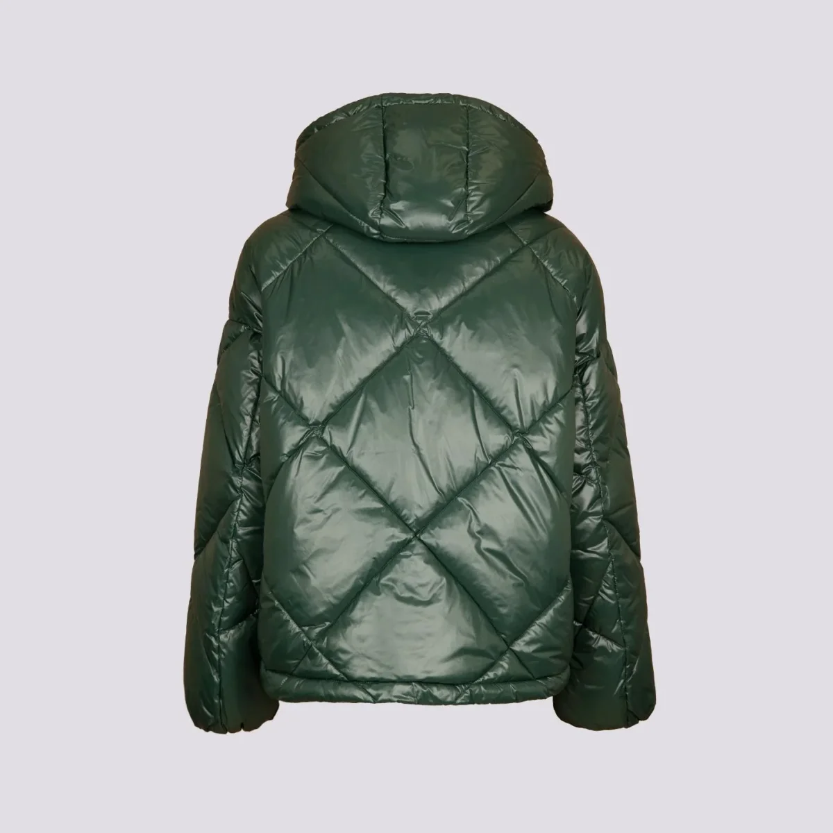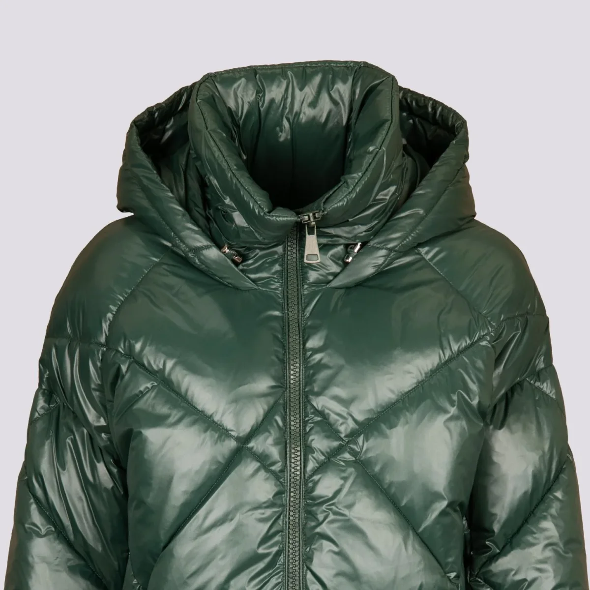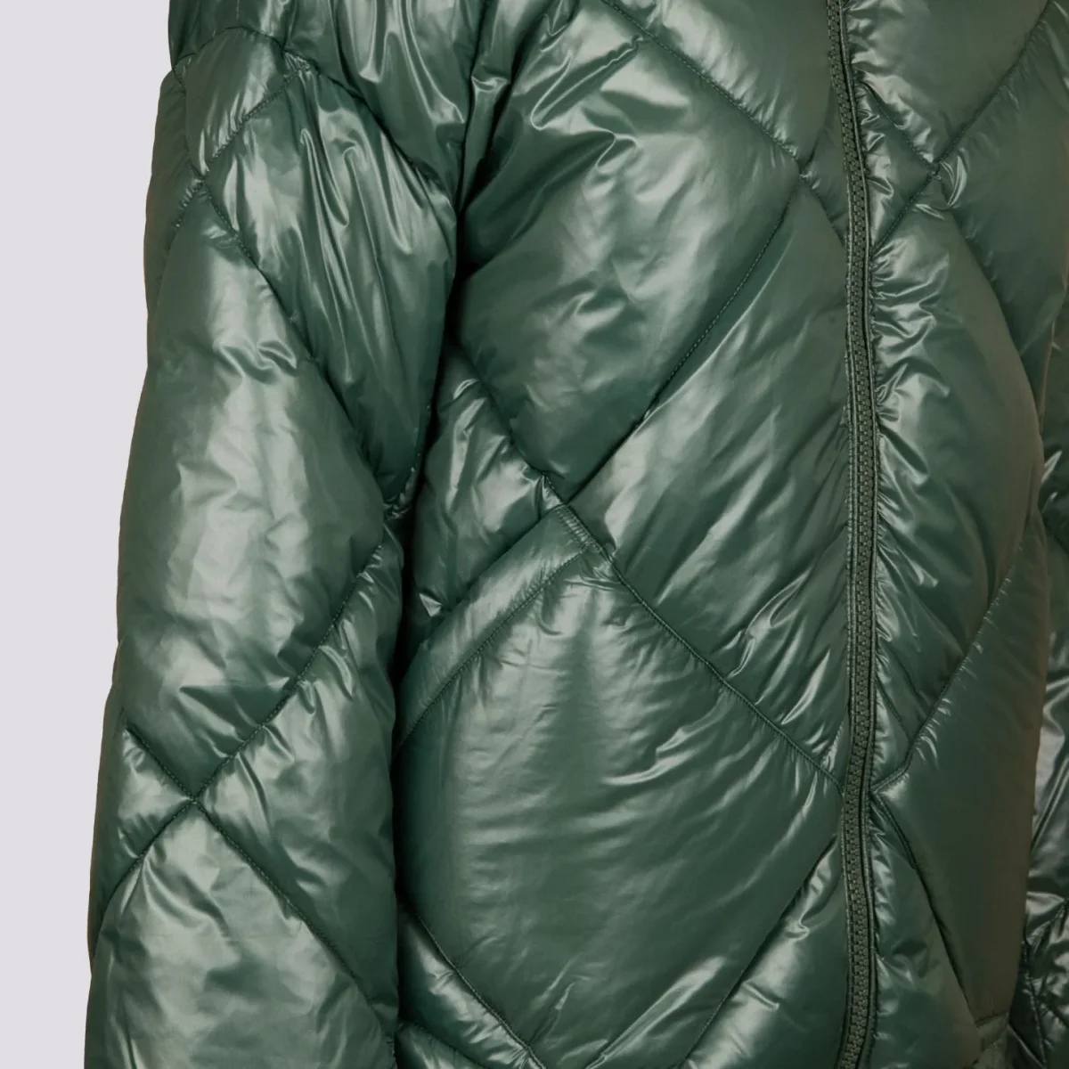 Piumino corto con cappuccio regular fit realizzato in nylon verde shiny ultra light. Imbottitura realizzata con ovatta riciclata e certificata REPREVE. Medium weight consigliato per temperature da 0 a 15 gradi °C. Chiusura anteriore con zip e bottoni automatici. Cappuccio a scialle ed elastico in sovratono su polsi e fondo retro. Tasche a filetto.