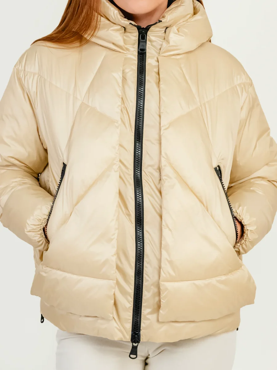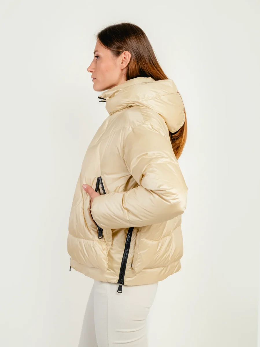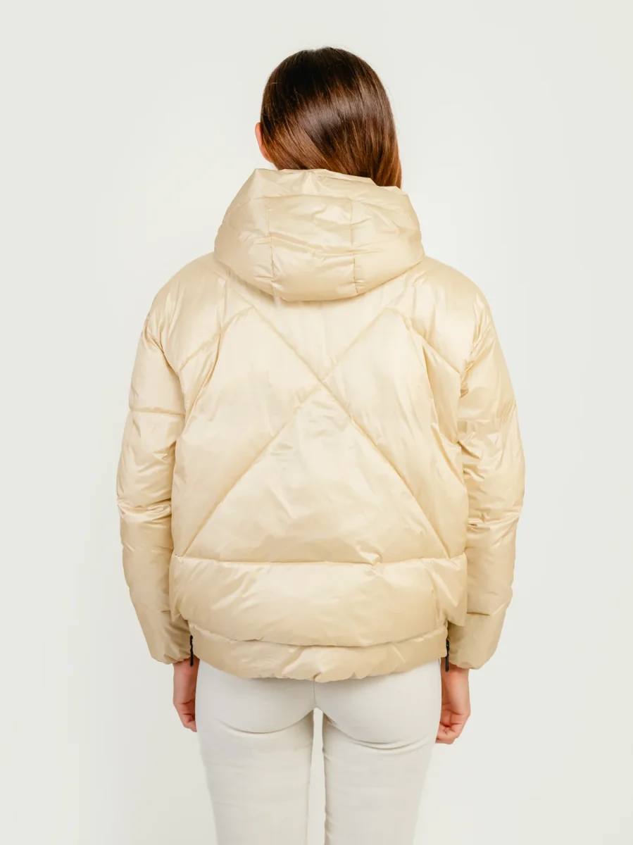 Piumino trapuntato lunghezza al fianco con cappuccio integrato beige.