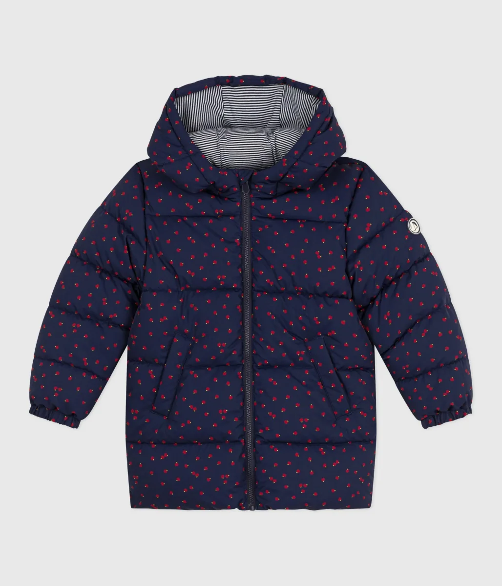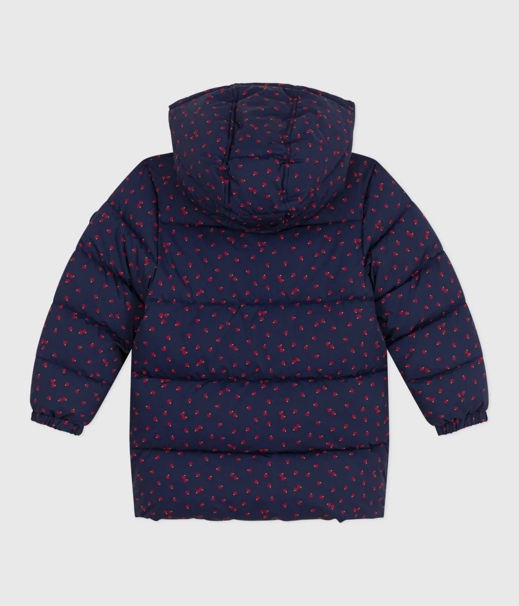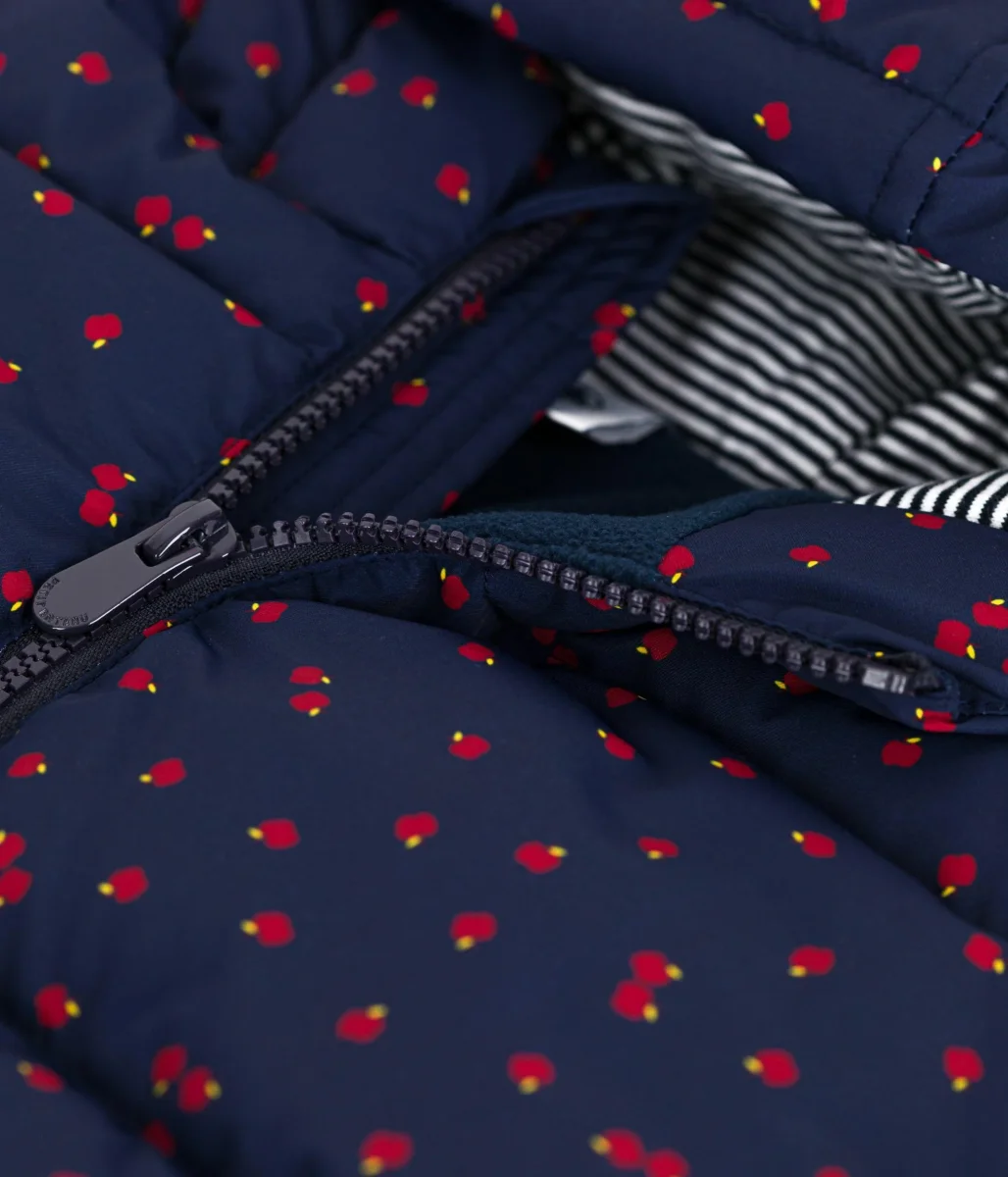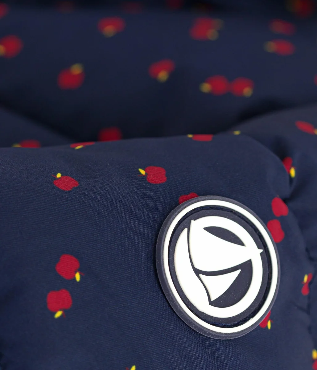 Piumino bambina con mele stampate, ideale per l’inverno.