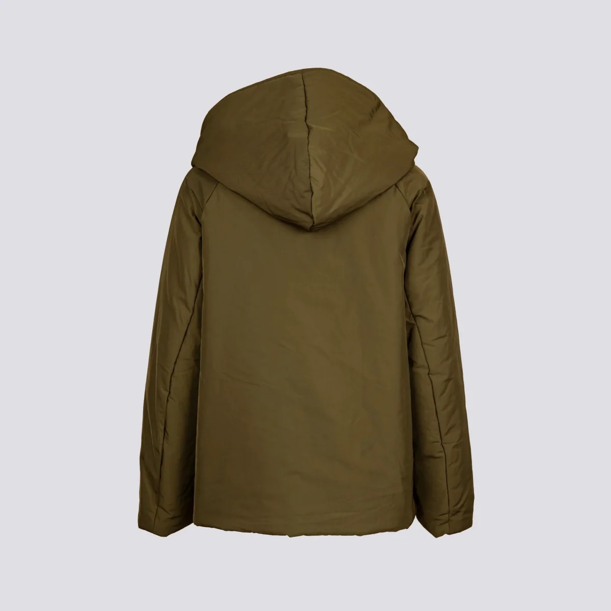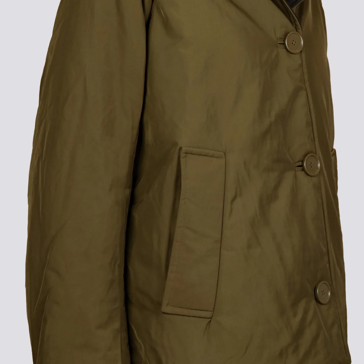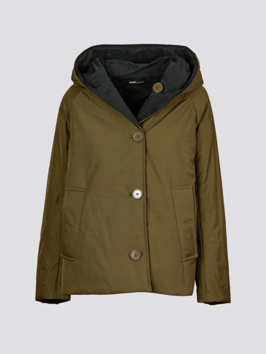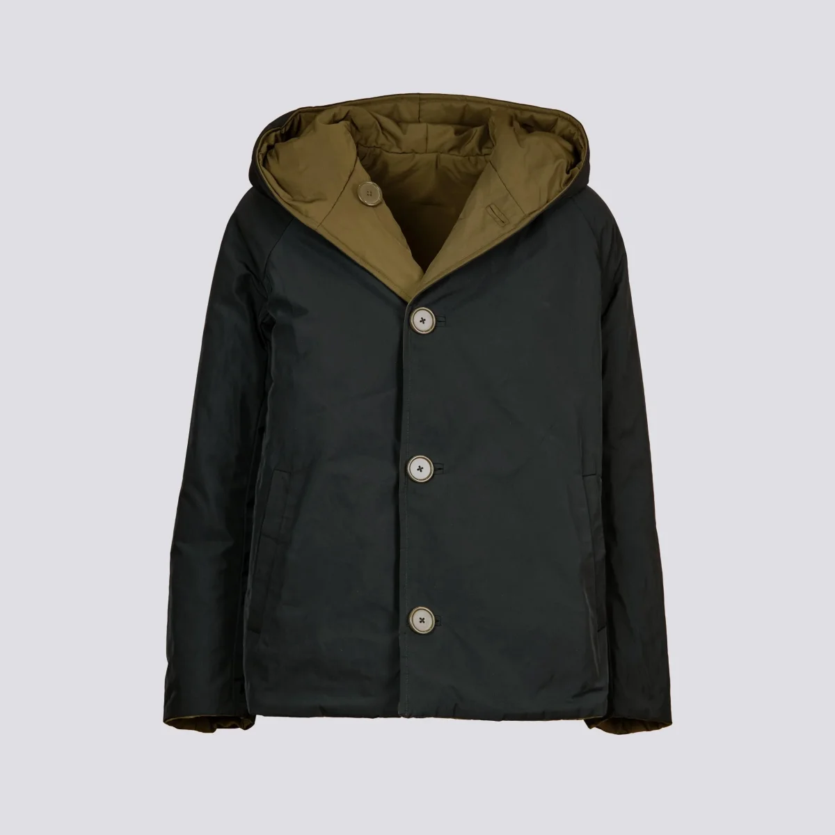 Piumino corto reversibile verde e nero con cappuccio regular fit realizzata in nylon memory water repellent. Imbottitura realizzata con ovatta riciclata e certificata REPREVE. High weight consigliato per temperature da -5 a 10 gradi °C. Chiusura anteriore con bottoni 4 fori in tono. Scollo a scialle con cappuccio e manica raglan. Tasche esterne ed interne a filetto. Etichetta a bandierina loggata inserita sul fianco. Composizione: 100% nylon.