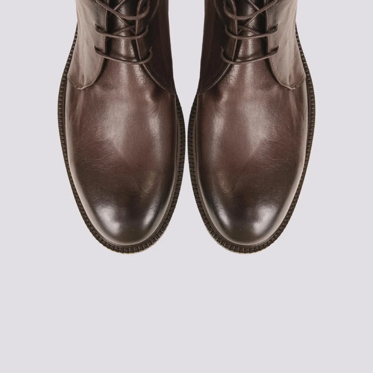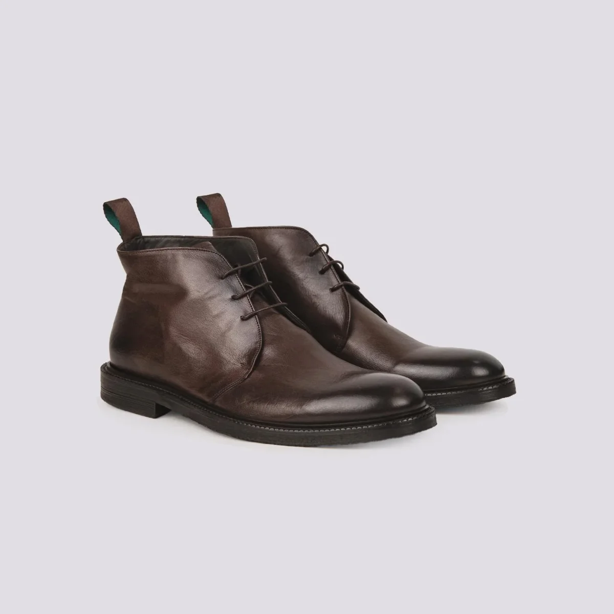 Polacchino derby in pelle spalmata marrone. Lacci in tonalità. Tiretto in tessuto in tonalità per facilitare la calzata della scarpa. Punta stondata. Peso leggero, ideale per essere indossato per intere giornate. Tomaia e fodera in vera pelle. Para in gomma. Calzata abbondante, si consiglia l’acquisto di un numero in più.