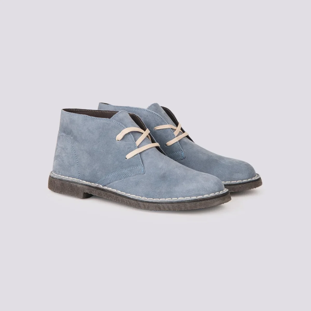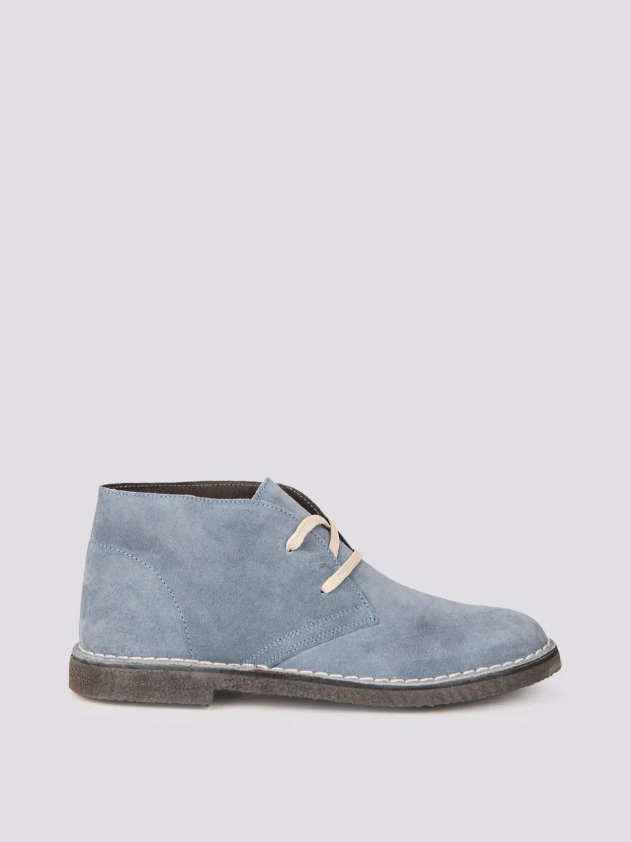 Polacchino in pelle scamosciata azzurra, realizzato unendo una suola in gomma con para, caratterizzato da una punta rotonda e una fodera in pelle.