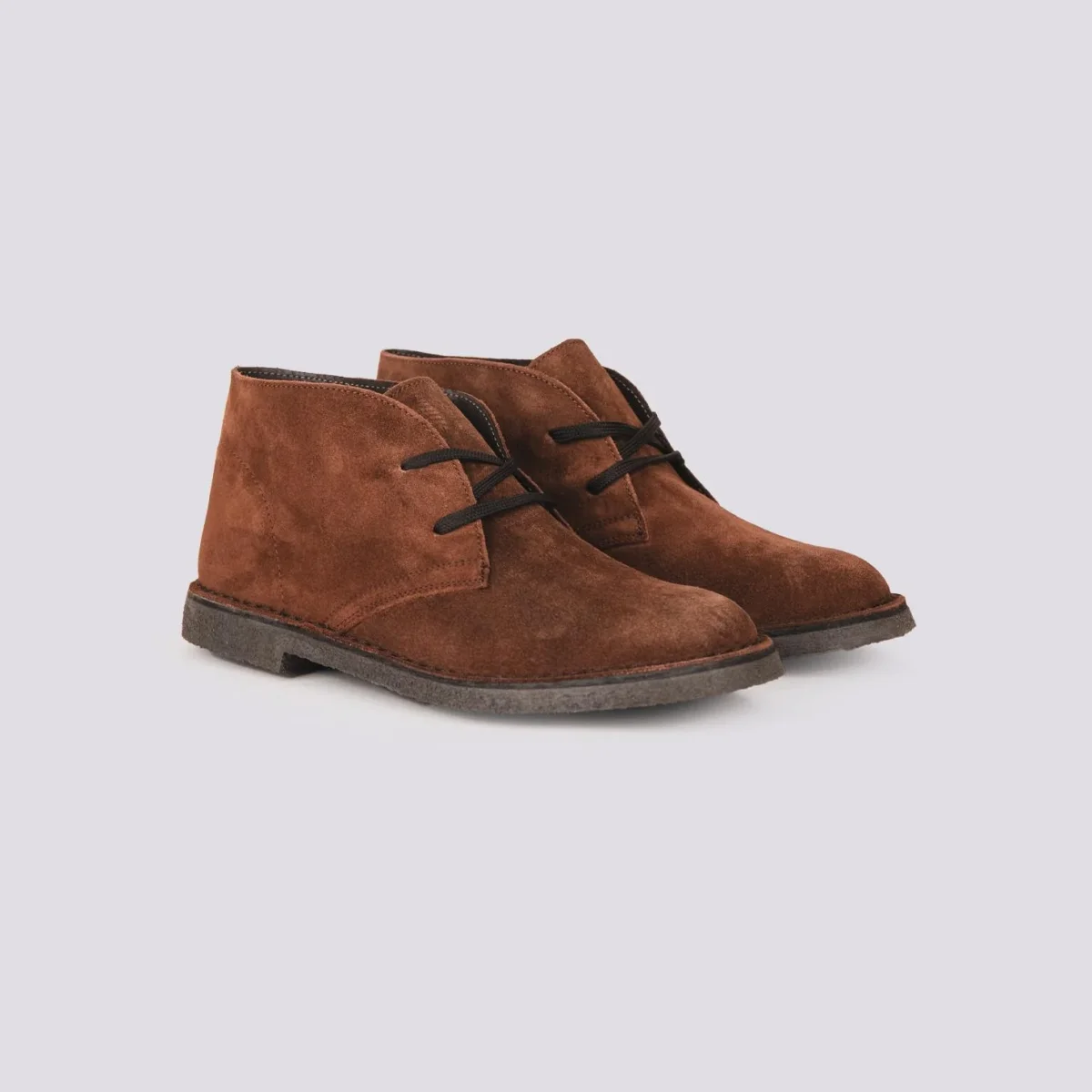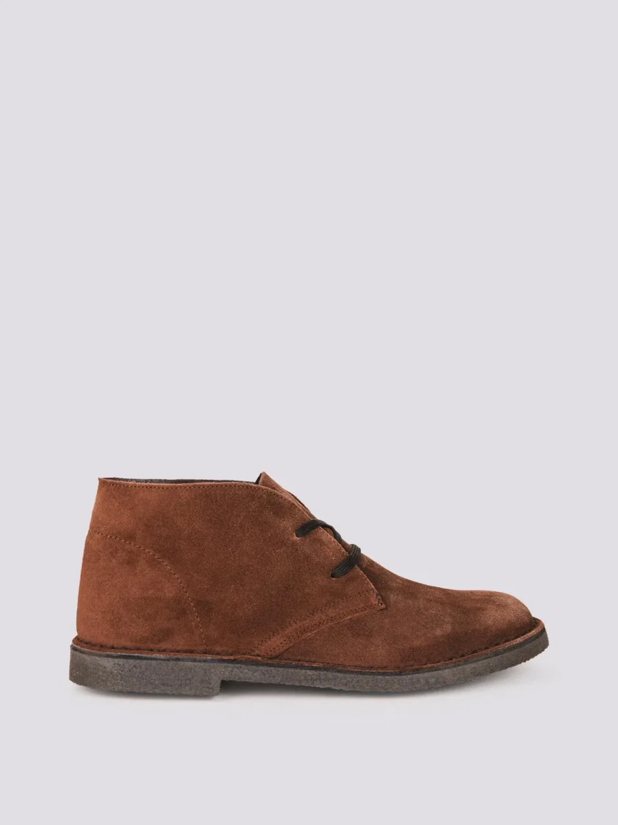 Polacchino in pelle scamosciata marrone, realizzato unendo una suola in gomma con para, caratterizzato da una punta rotonda e una fodera in pelle.