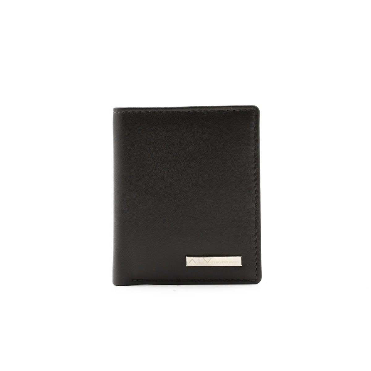 Versione verticale del portafoglio ALV, realizzata in pelle liscia con inserto metallico logato.