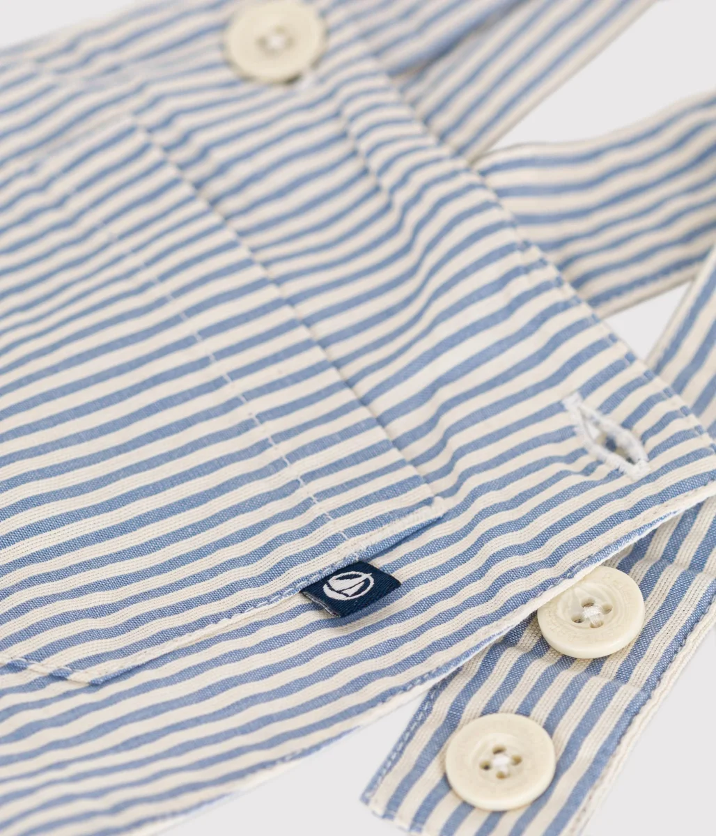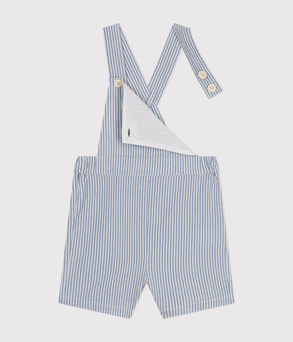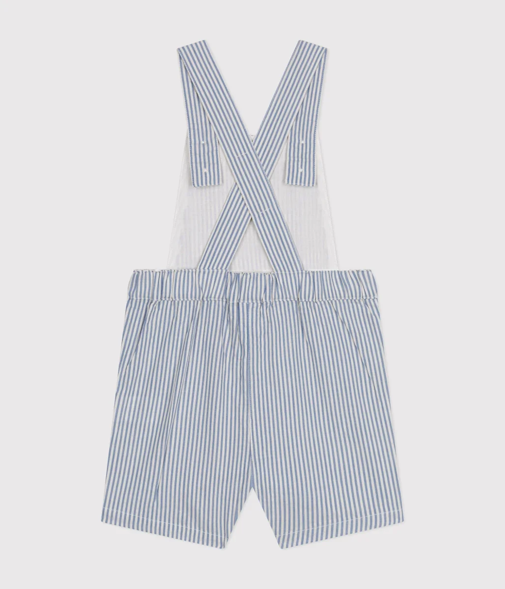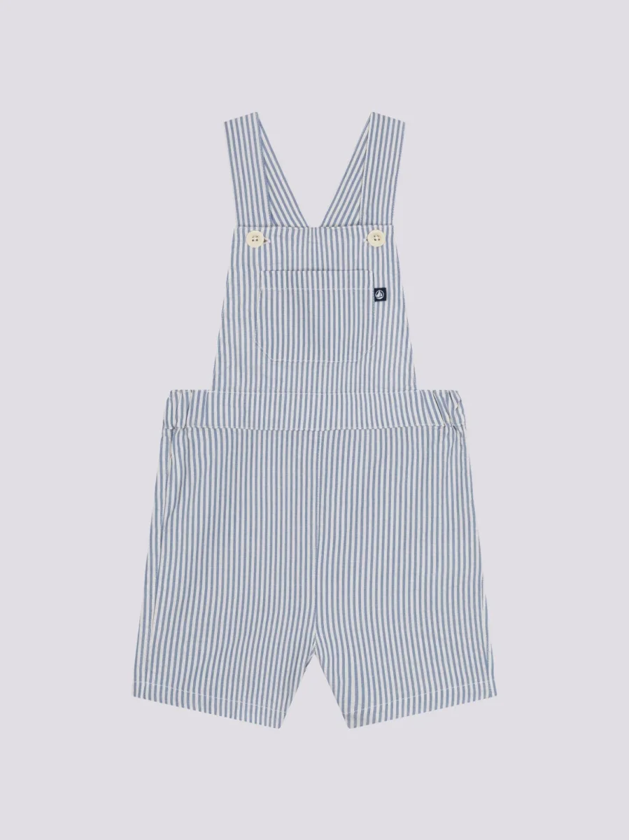 Salopette unisex corta in seersucker, un tessuto leggero e testurizzato.Tasca applicata sulla pettorina, bretelle regolabili davanti.