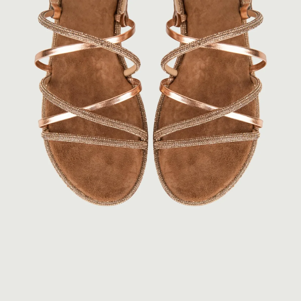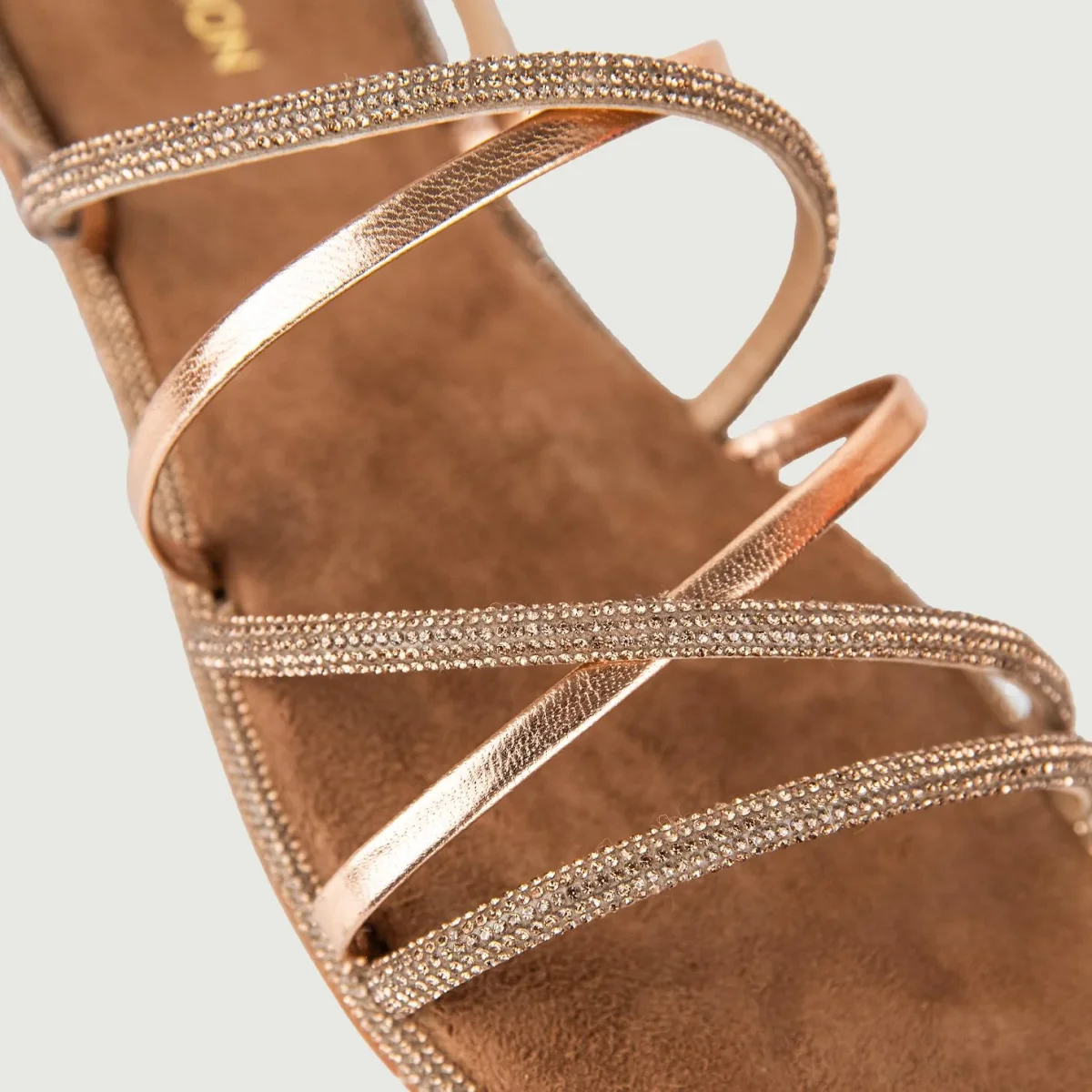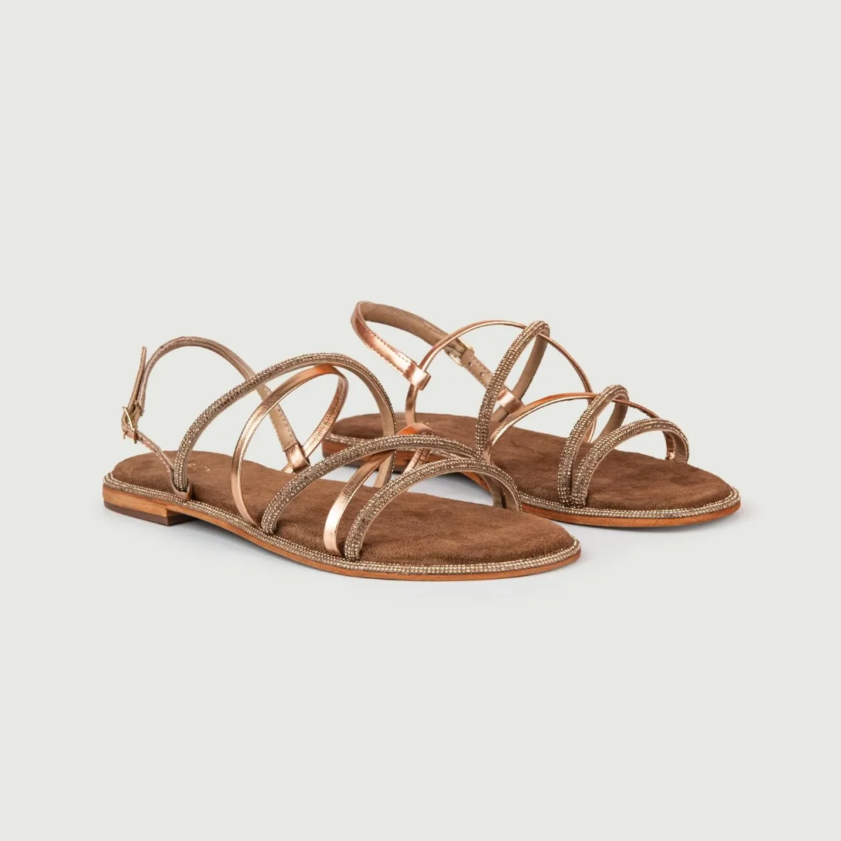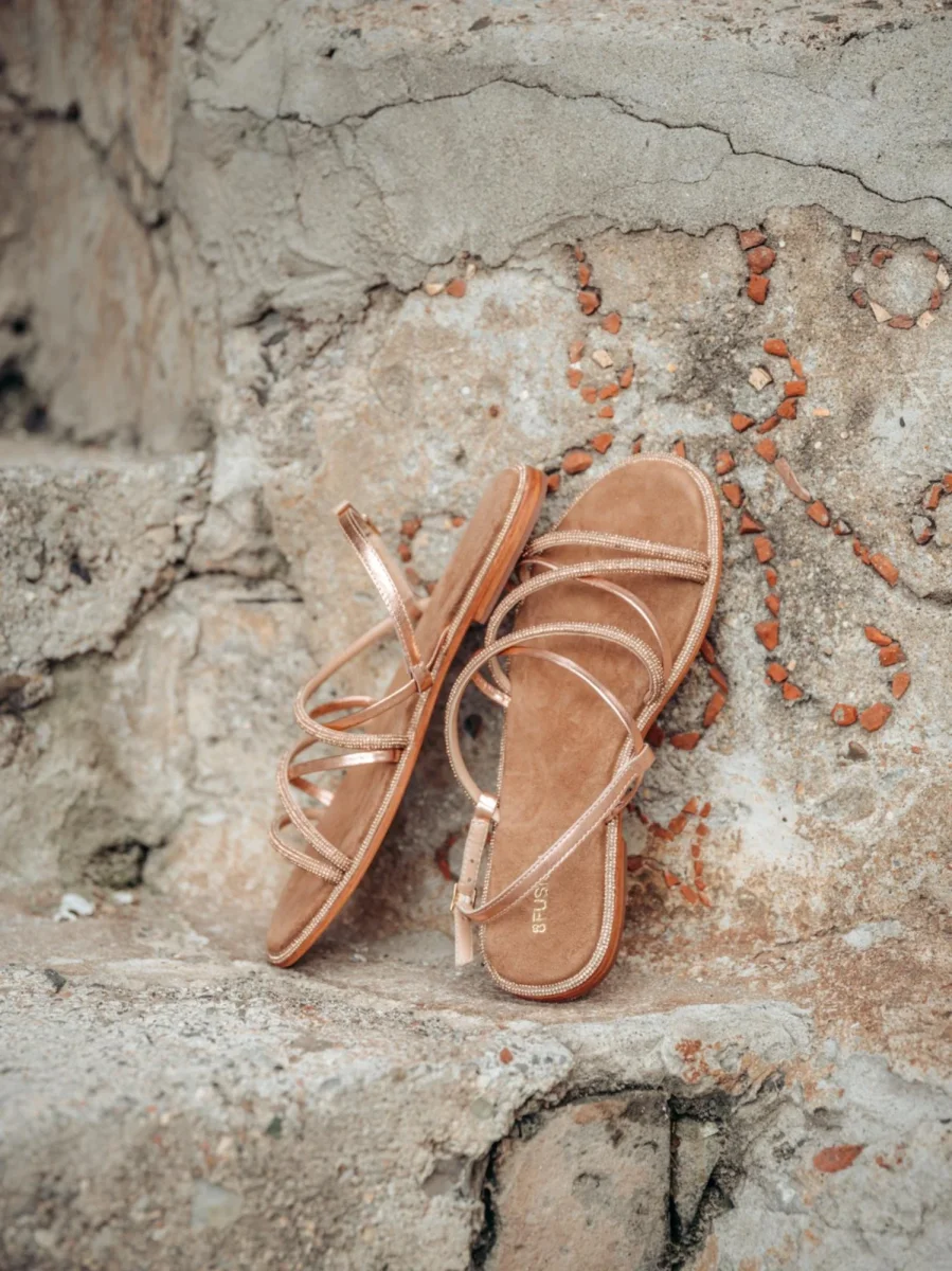 Sandalo basso intrecciato oro rosa con glitter e fibbia posteriore.