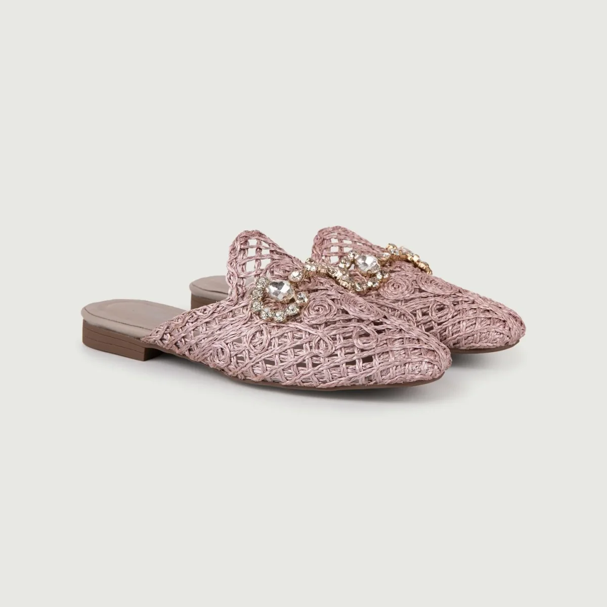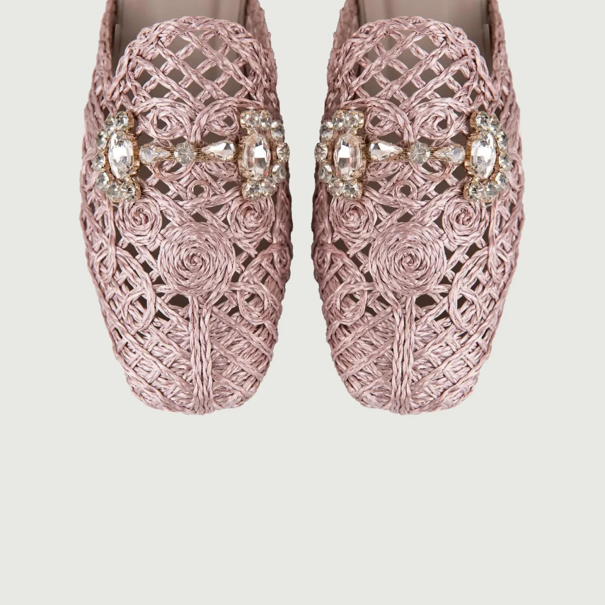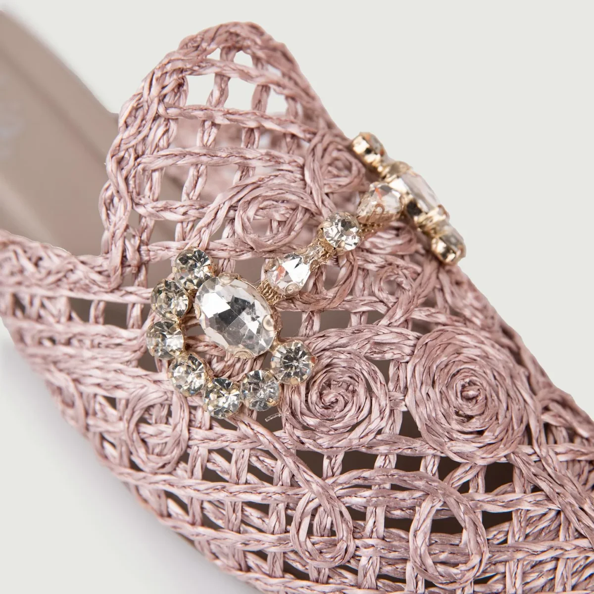 Sandalo sabot in rafia lilla. Fibbia frontale in strass. Composizione: Tomaia in materie tessili, fodera in cuoio e rafia, suola in gomma.