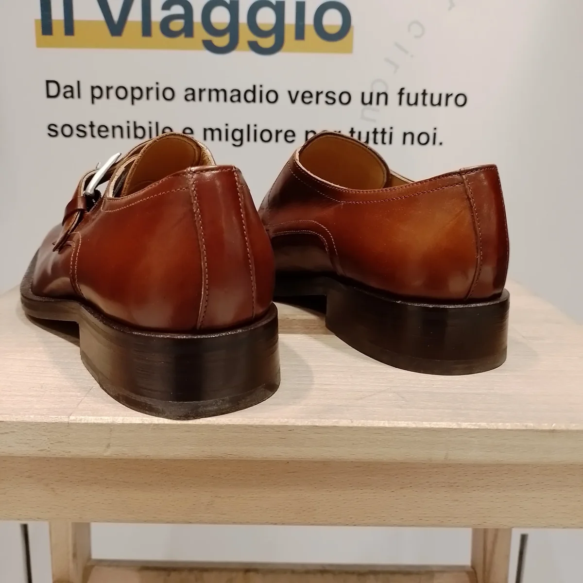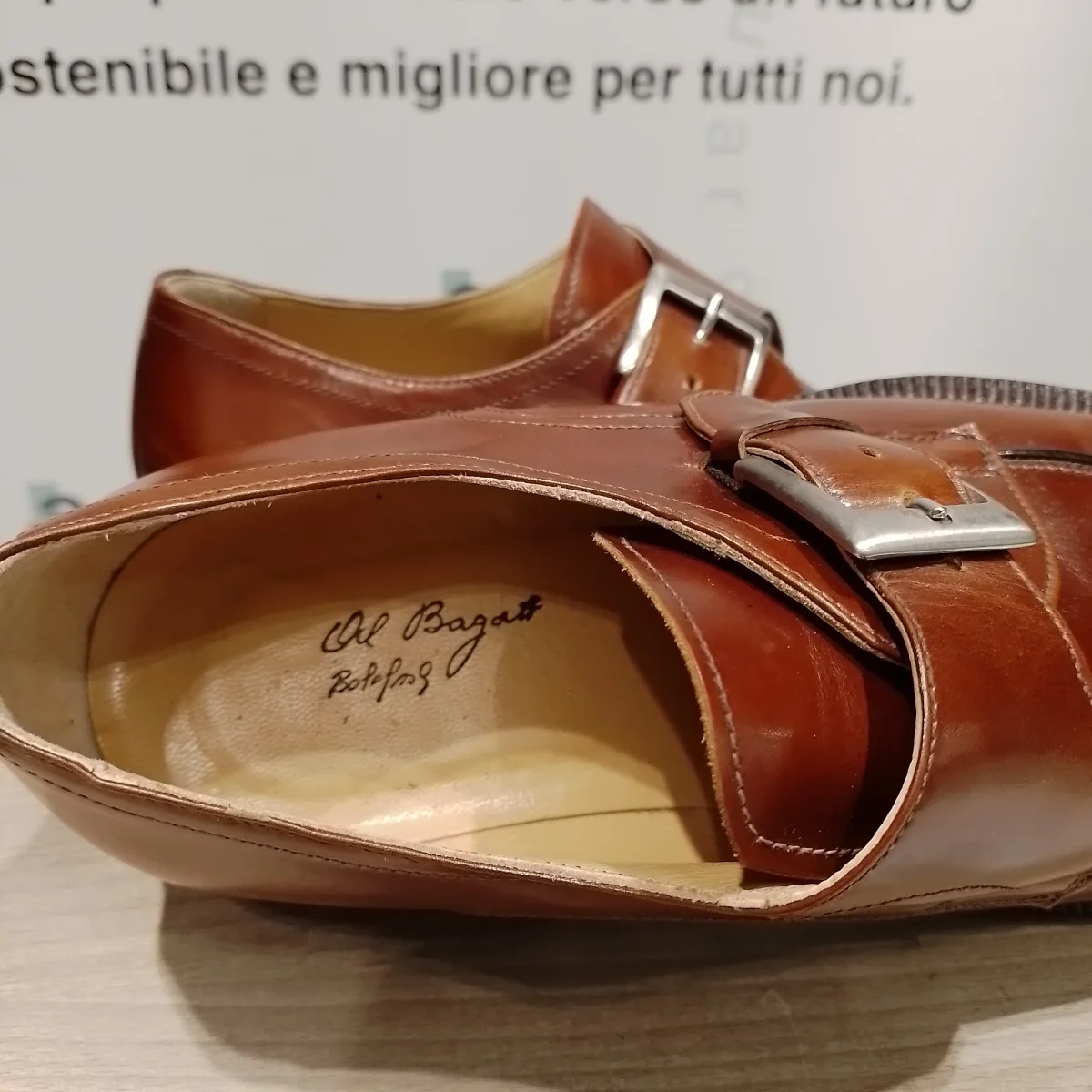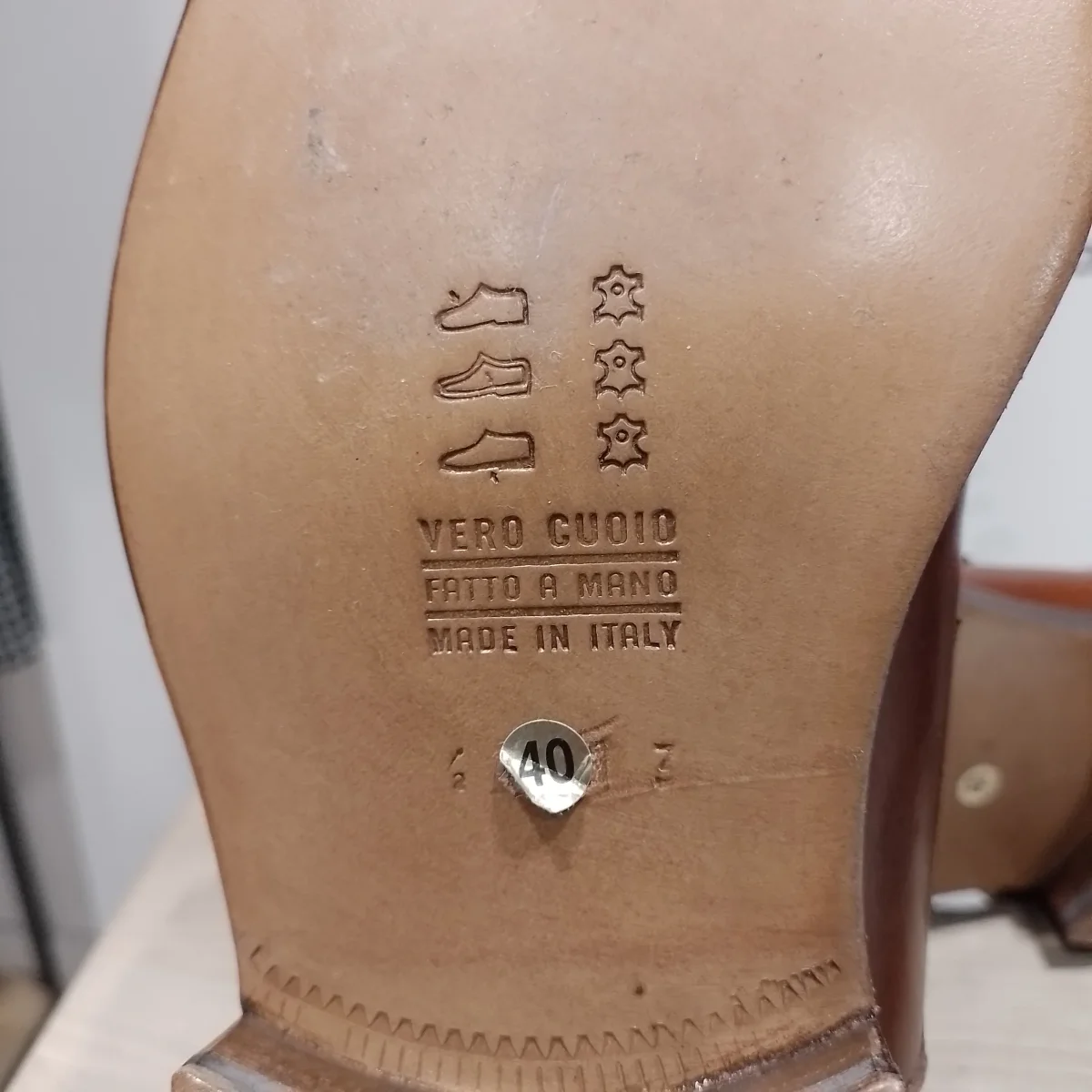 In vero cuoio, fatta a mano made in Italy. Marchio Al Bagatt Bologna. Numero 40. Altezza tacco 3,5 cm.