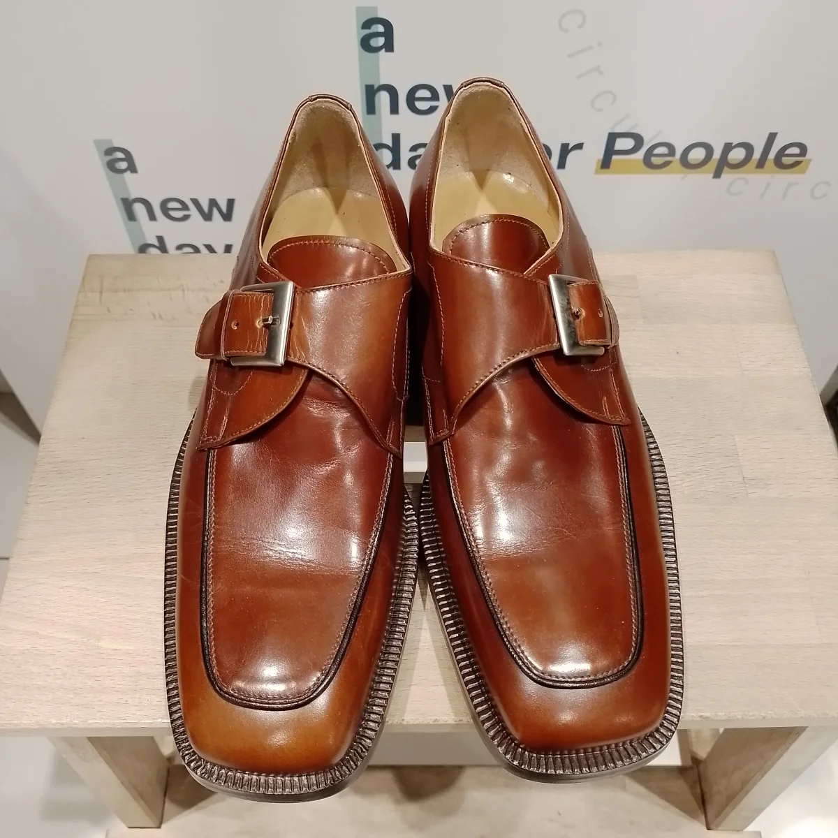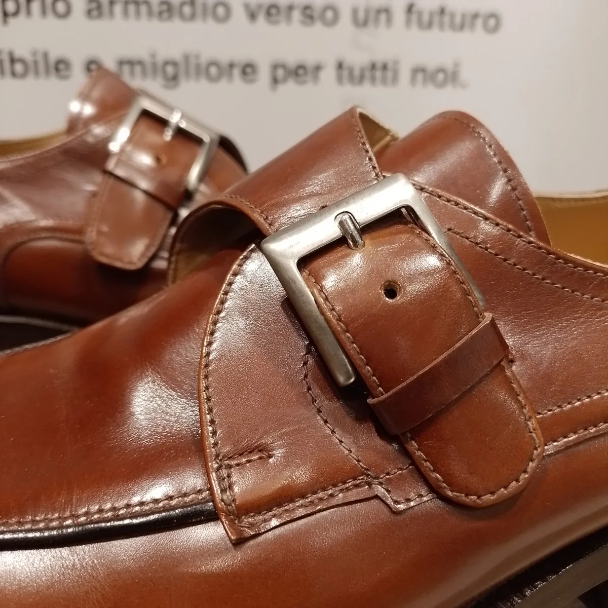 Scarpa vintage ed elegante da uomo, in stile Oxford. Di colore marrone con fibbia argentata e regolabile con 3 buchi a disposizione e a punta quadrata.