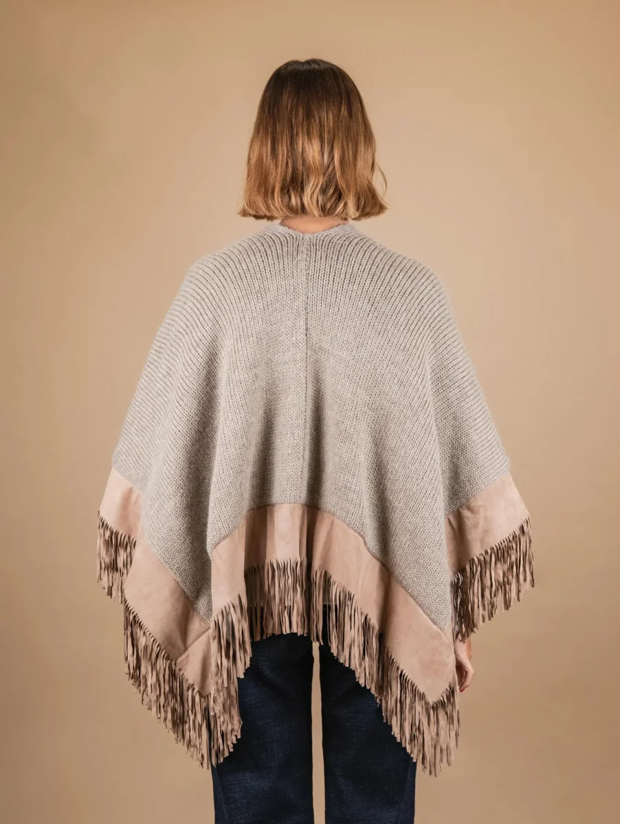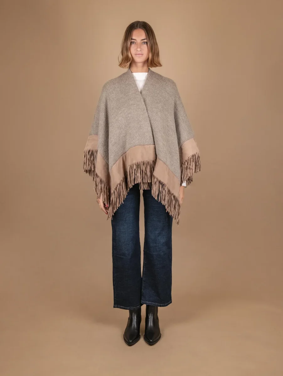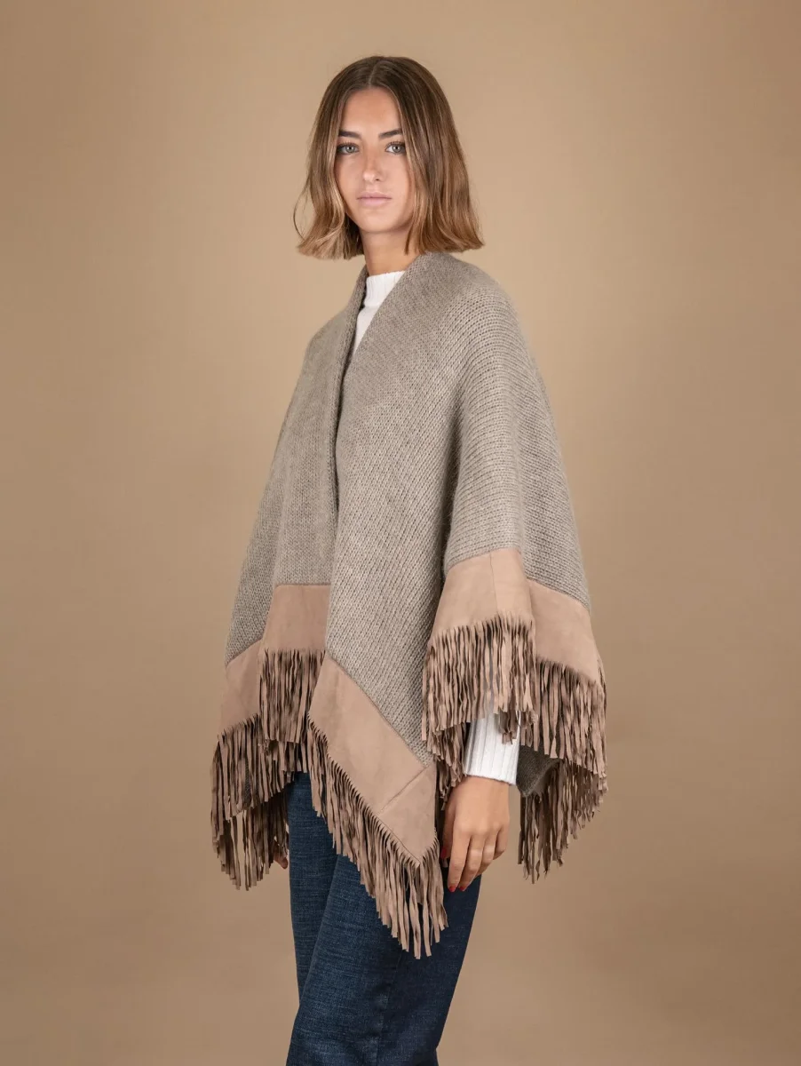 Scialle in lana cammello con profili e frange in camoscio beige. Il capo perfetto per tutte le persone che soffrono particolarmente il freddo. La struttura di questo scialle infatti permette di portarlo comodamente sulle spalle e sopra le maniche senza che questo cada. Le frange applicate lungo tutto il profilo aggiungono un tocco di grinta a questo capo elegante. Taglia unica. Peso abbondante. Composizione: 50% Mohair 40% pura lana vergine 10% acrilico e vera pelle.