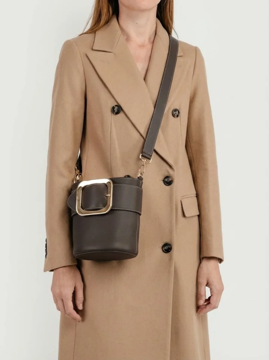 Maxi fibbia frontale in metallo dorato.