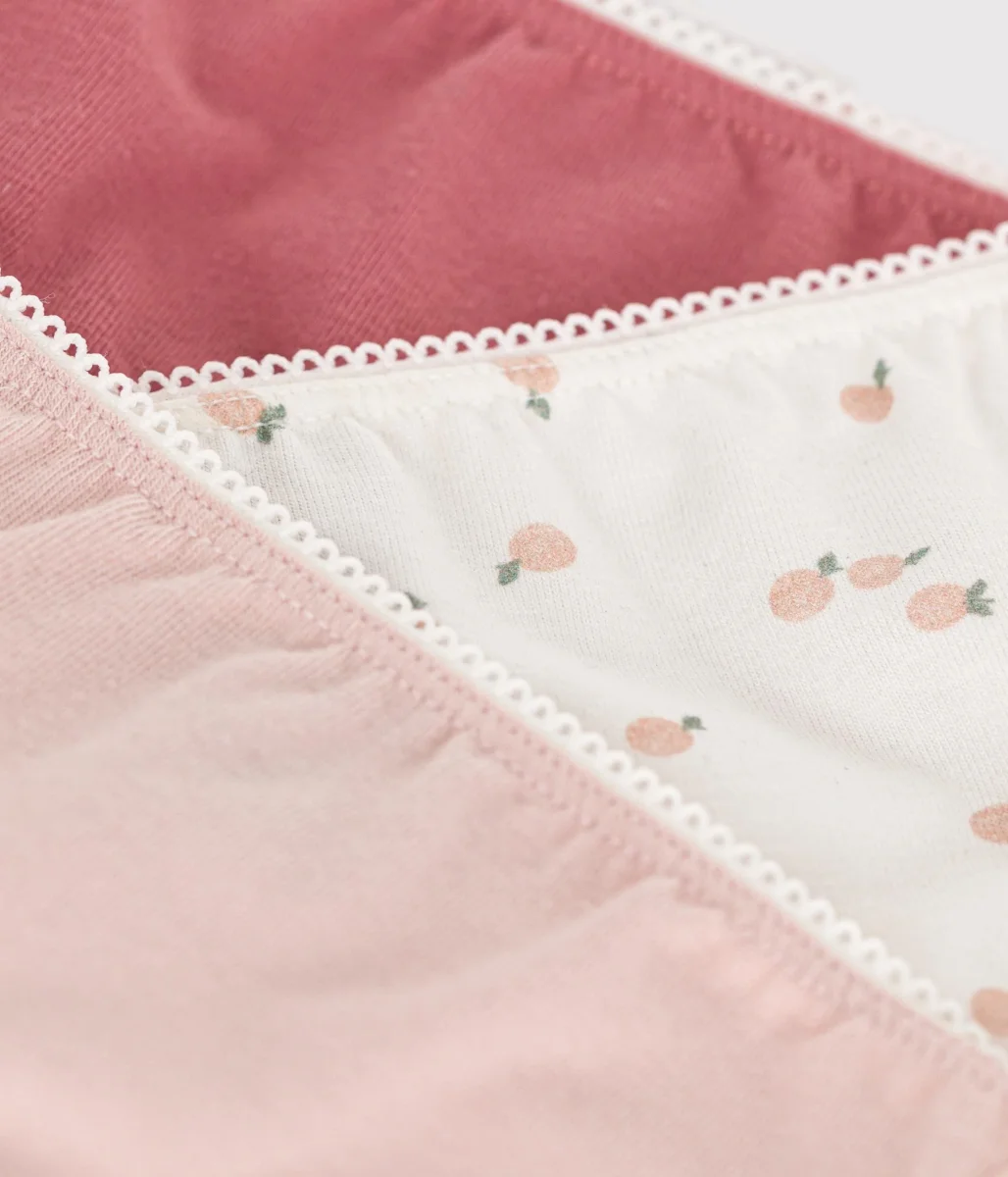 Questo set comprende due slip tinta unita, uno con un motivo frutti stampato.