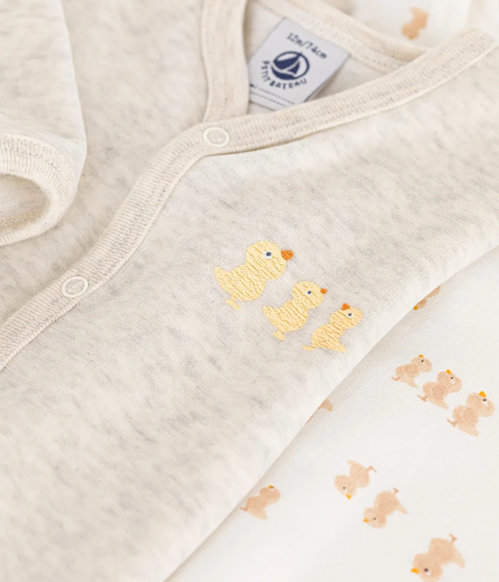 Seconda tutina pigiama unisex in velluto tinta unita con una graziosa serigrafia pulcini sul petto.