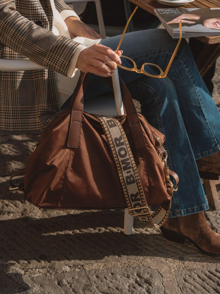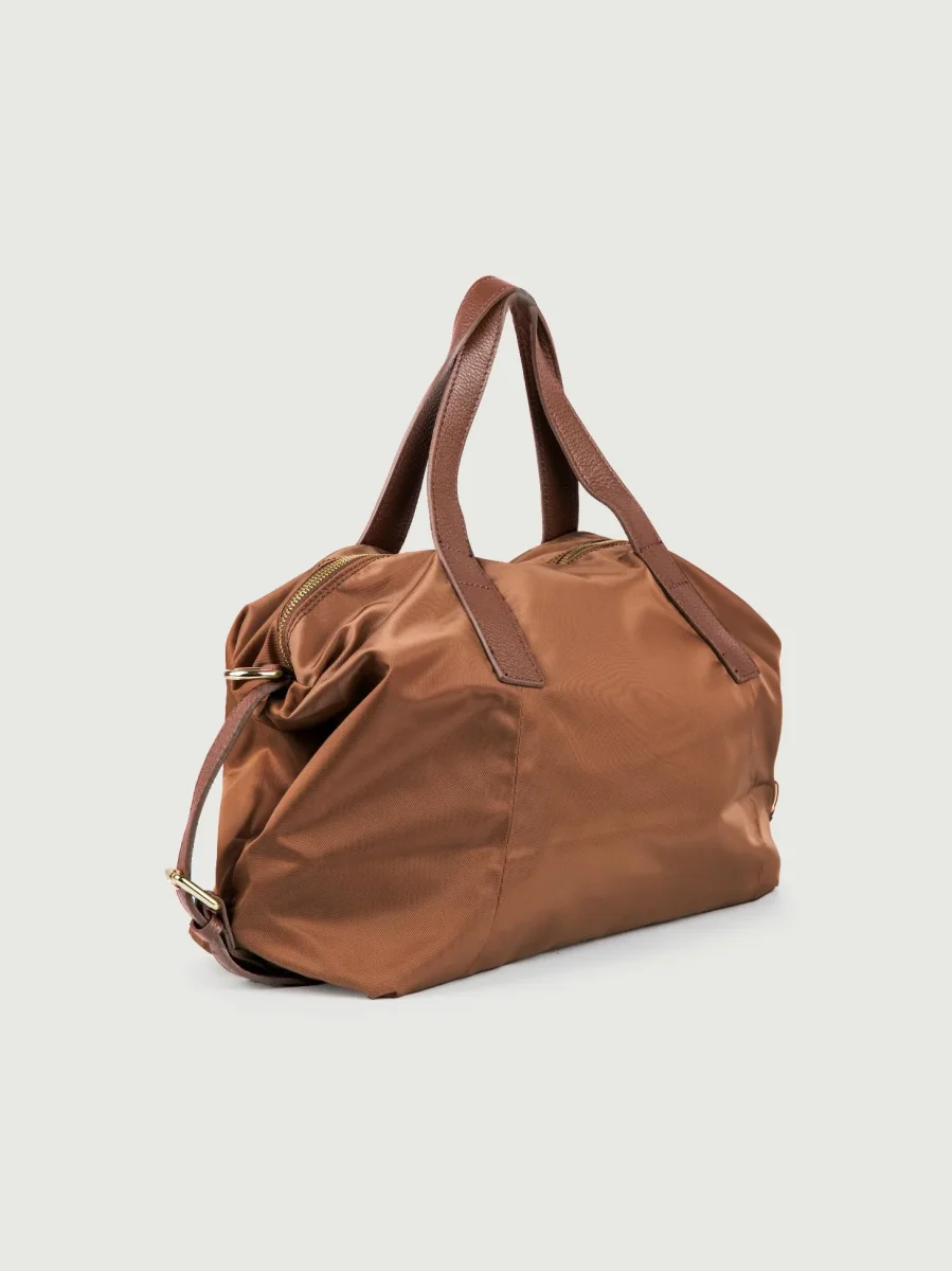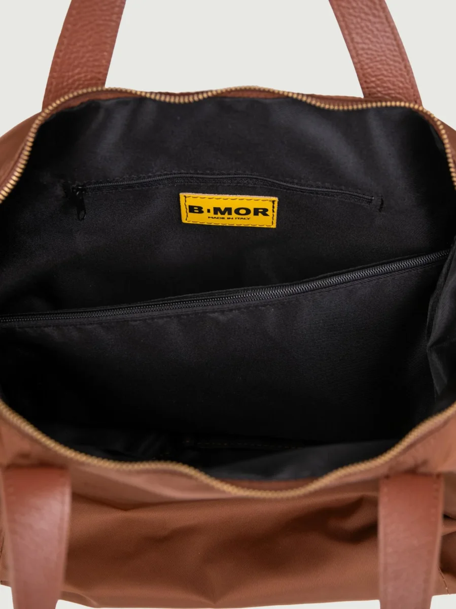 Shopper in nylon marrone con inserti in pelle in tonalità “Carry”.