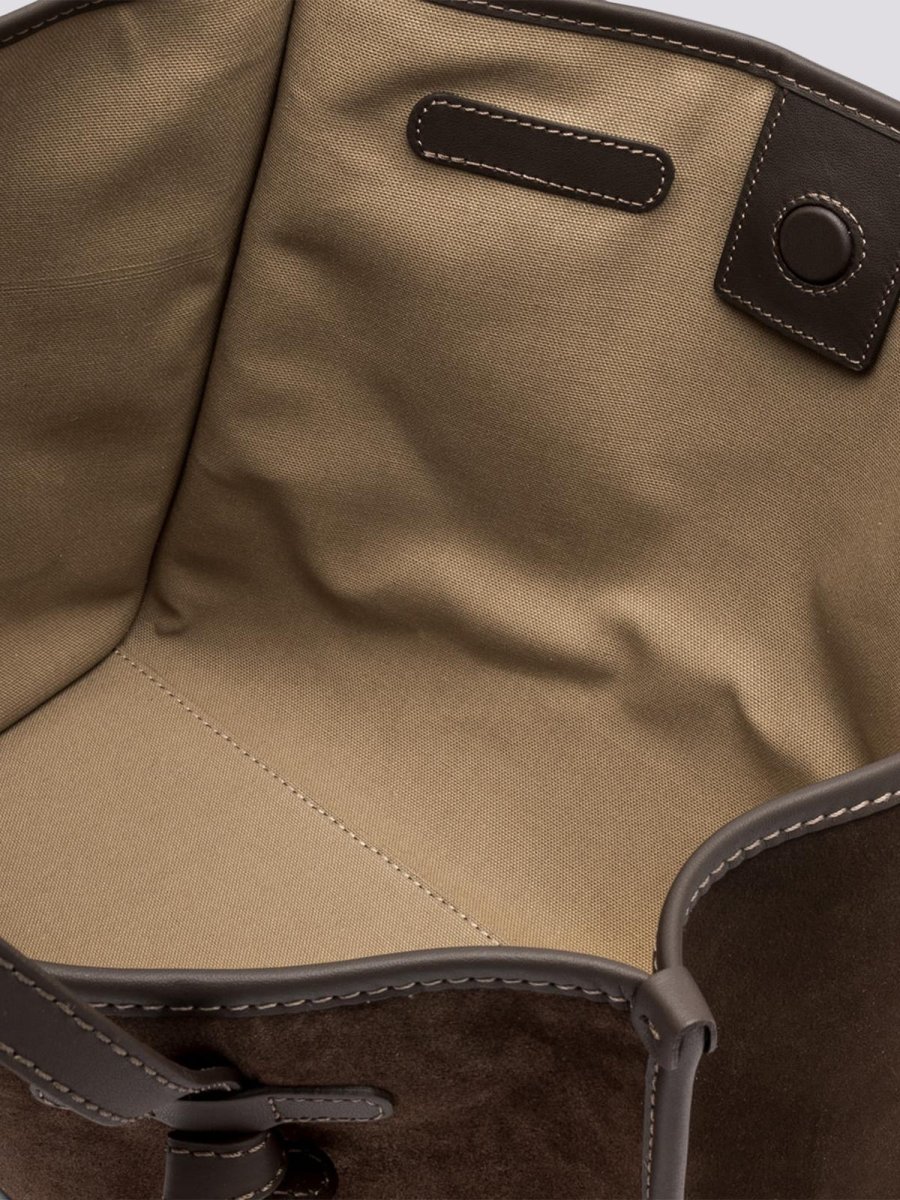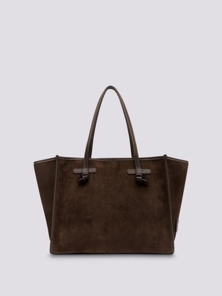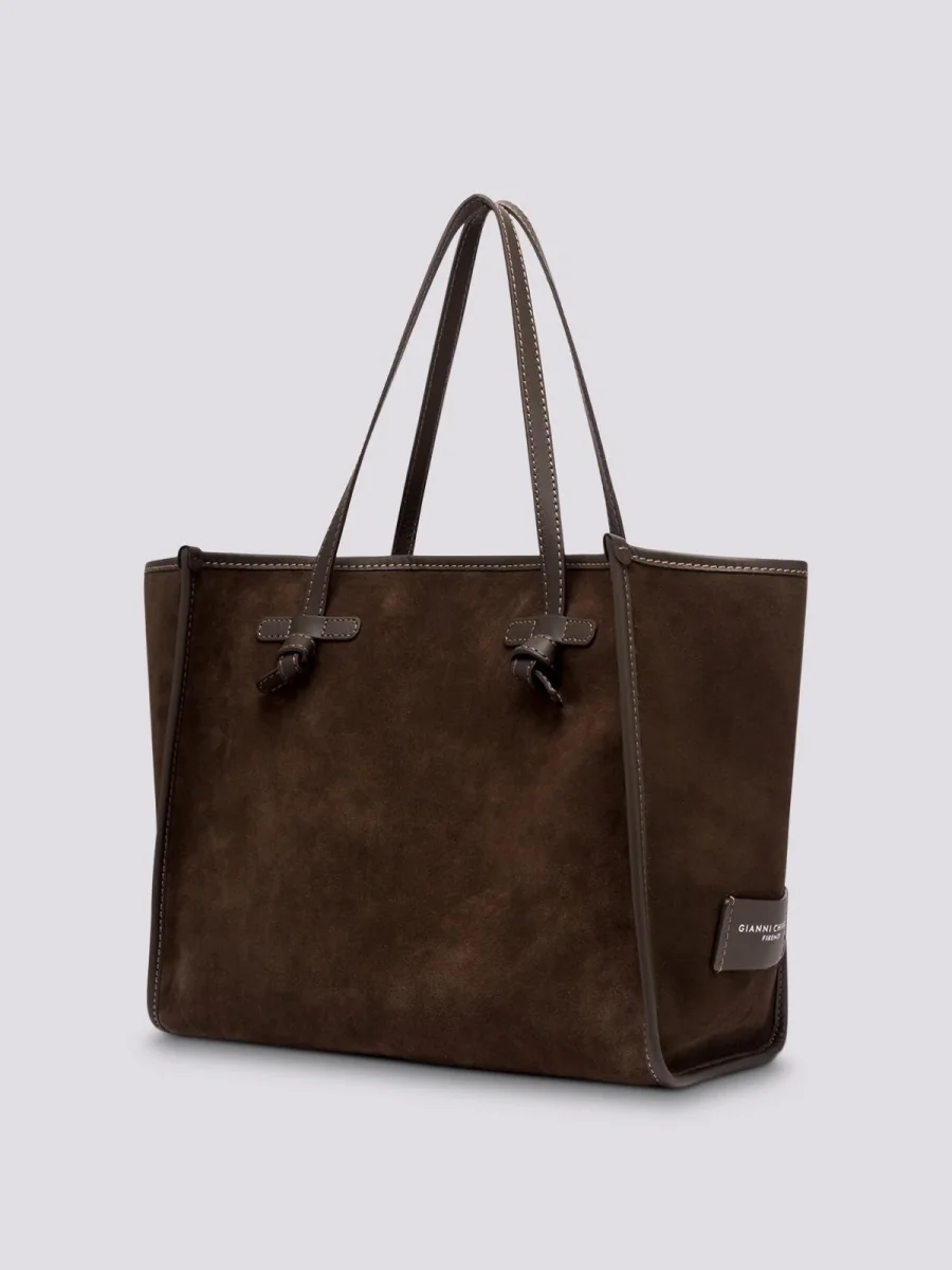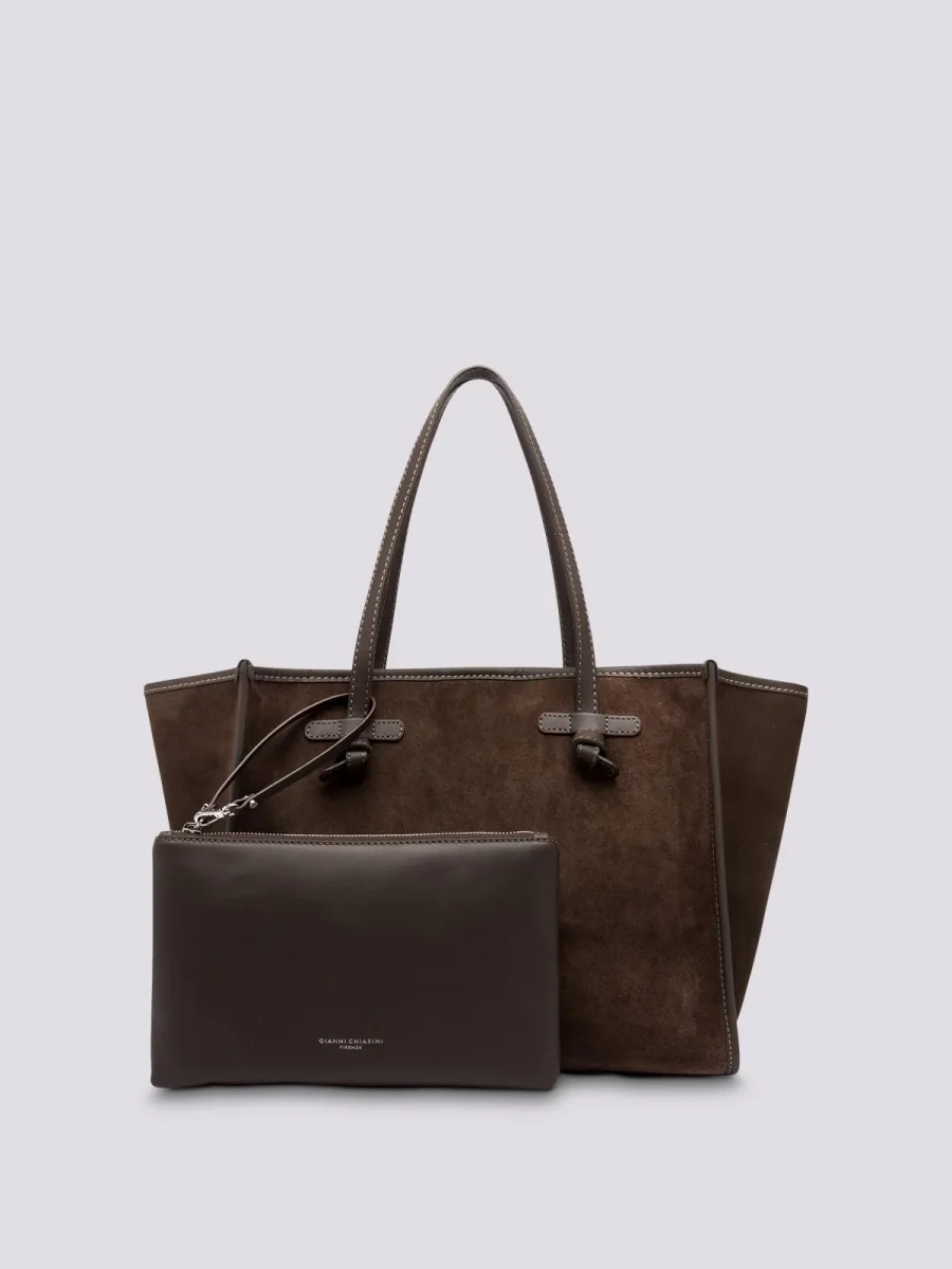 Marcella tote, in suede, profili e manici tono su tono. Chiusura con magnete, è corredata di pouch con zip in testa rimovibile. Dimensioni: 38x31x16 cm.