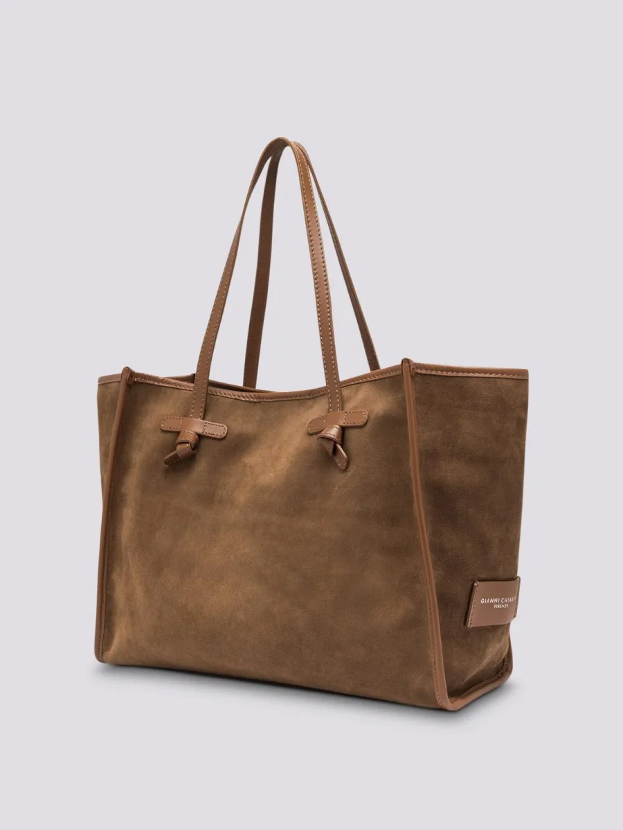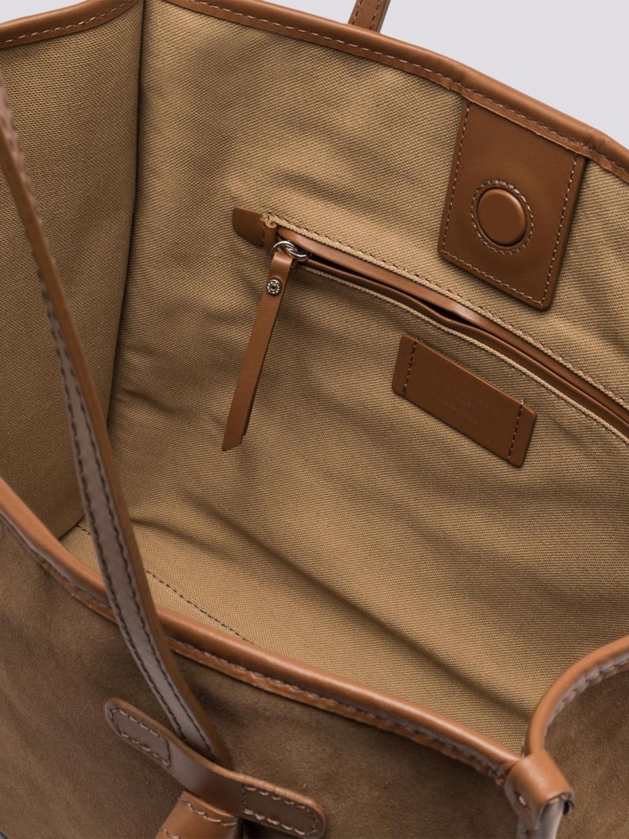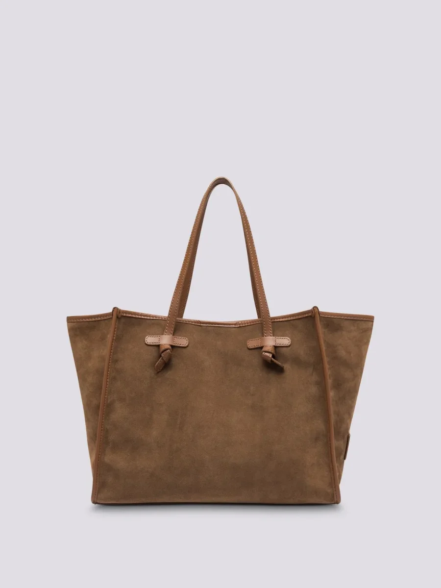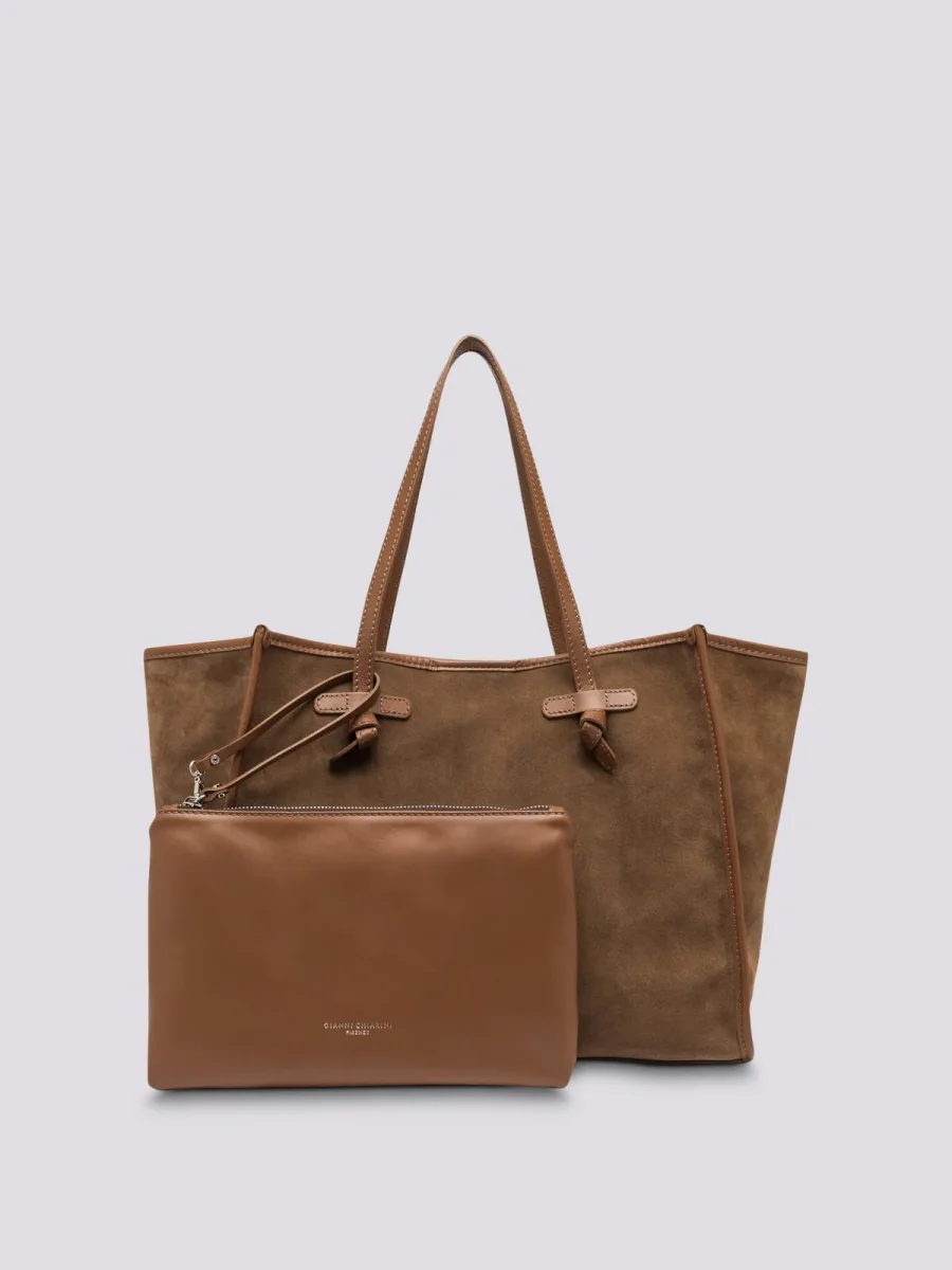 Marcella tote, in suede, profili e manici tono su tono. Chiusura con magnete, è corredata di pouch con zip in testa rimovibile. Dimensioni: 38x31x16 cm.