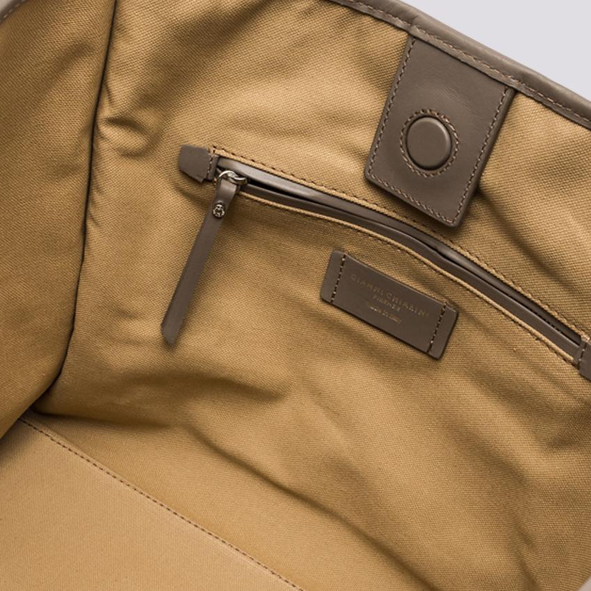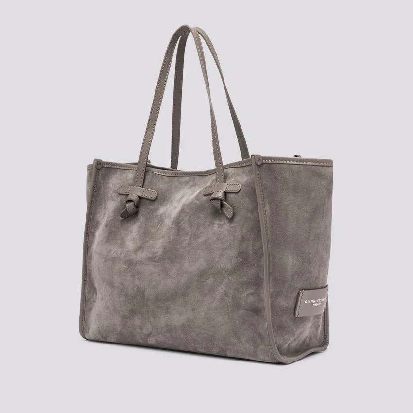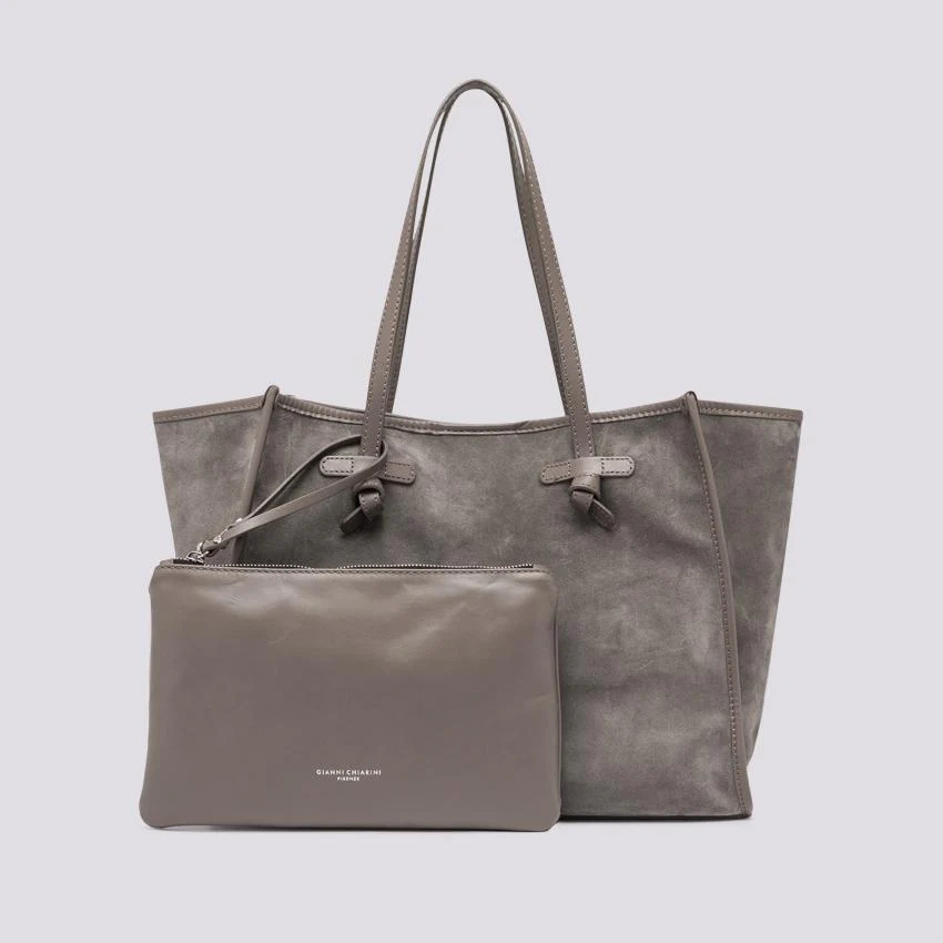 Marcella tote, in suede color light grey, profili e manici tono su tono. Chiusura con magnete, è corredata di pouch con zip in testa rimovibile.