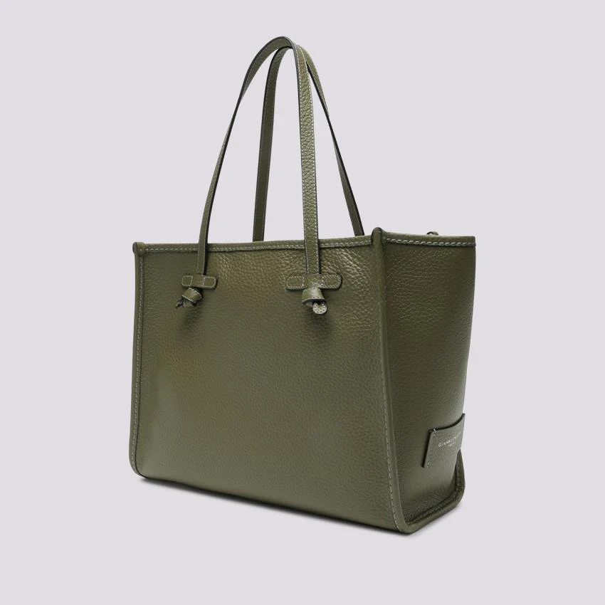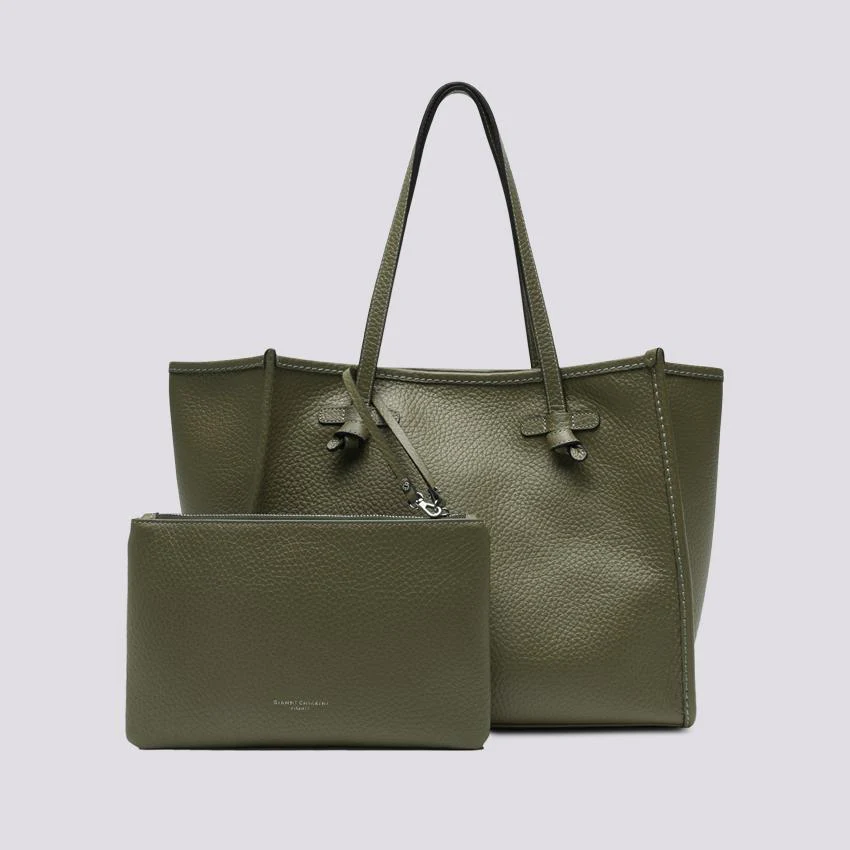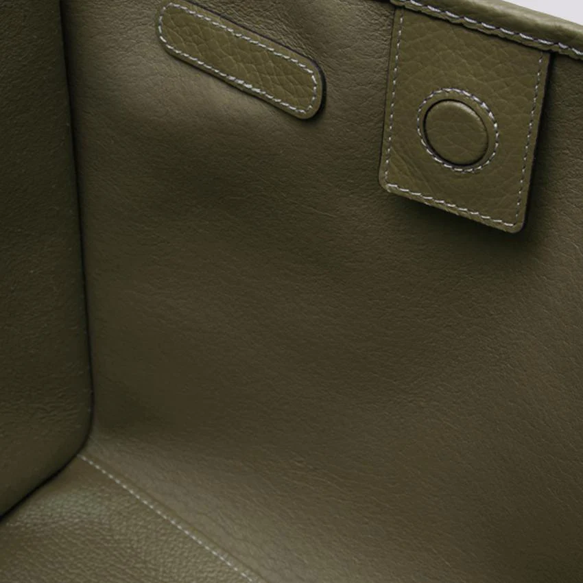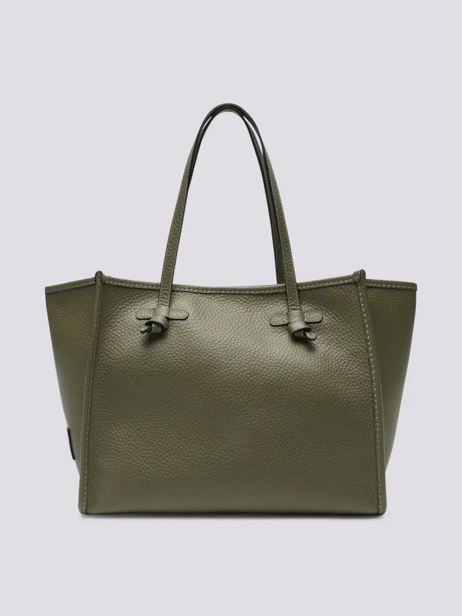 Marcella tote, in bubble double verde guam con cuciture in contrasto. Chiusura con magnete, è corredata di pouch con zip in testa rimovibile.