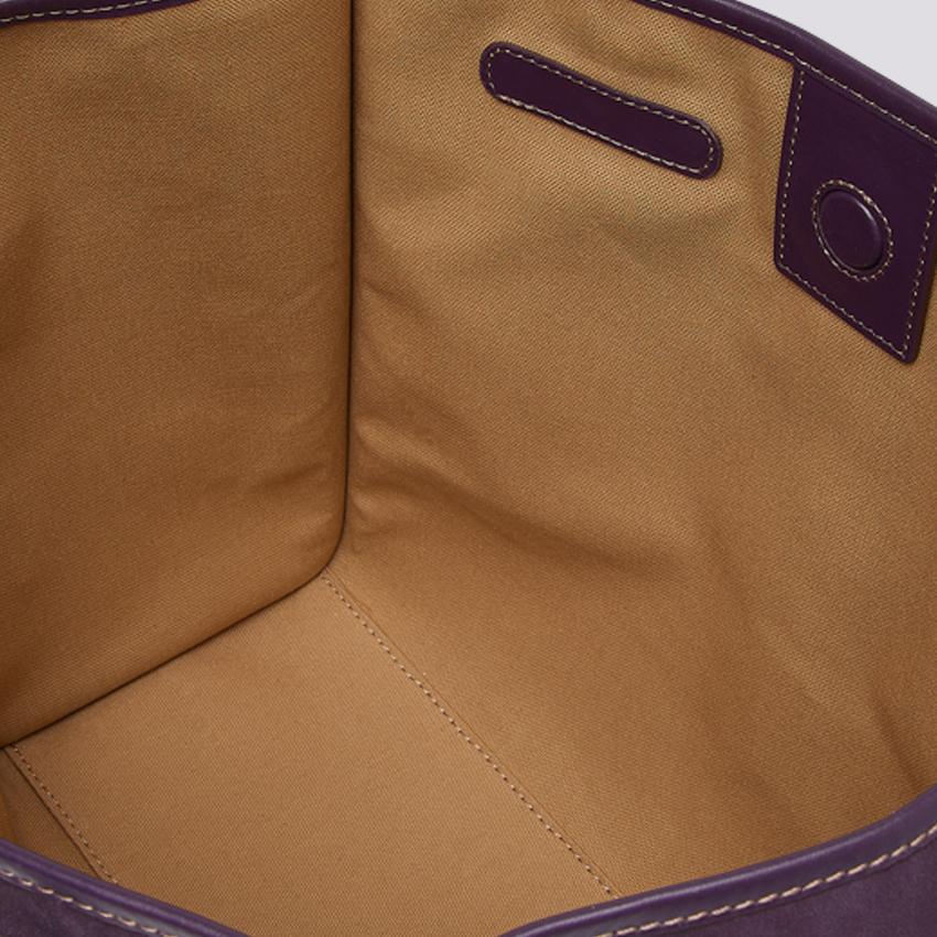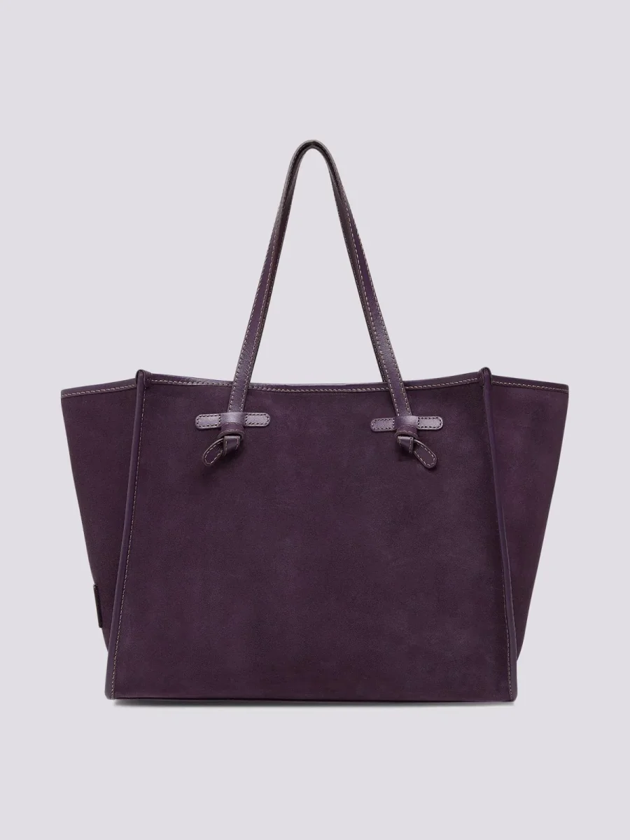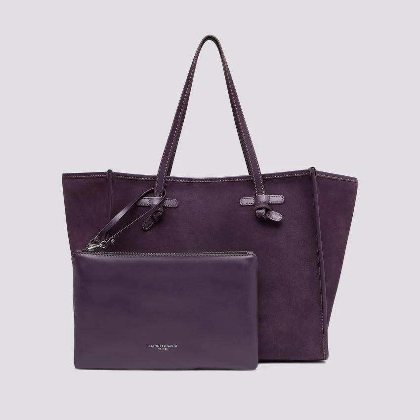 Marcella tote, in suede color prugna, profili e manici tono su tono. Chiusura con magnete, è corredata di pouch con zip in testa rimovibile.