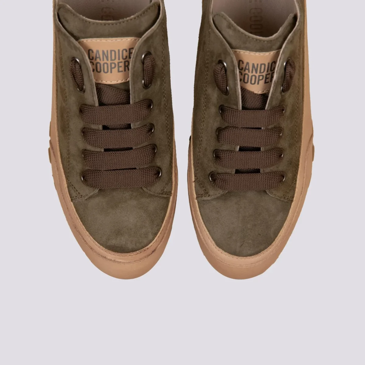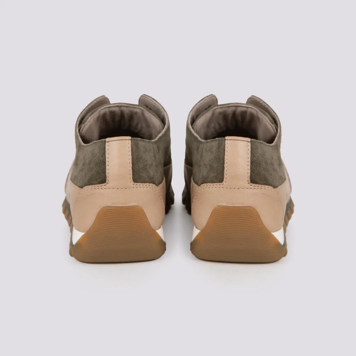 Sneakers in pelle e camoscio verde militare, tomaia in suede e rinforzi sul fondo in pelle imbottita. Bordo in pelle con cuciture, plantare estraibile e sottile, suola con rialzo in gomma.
