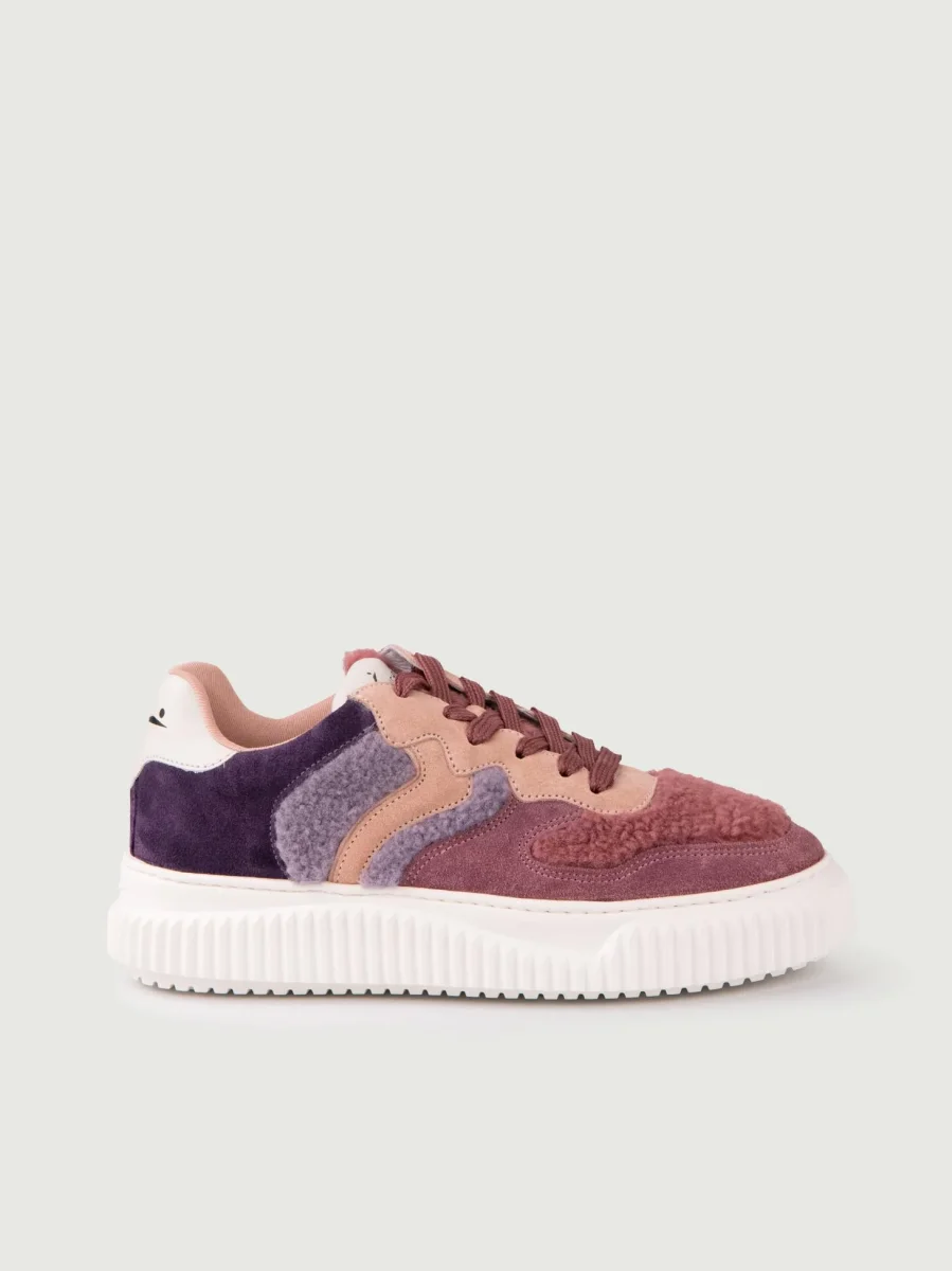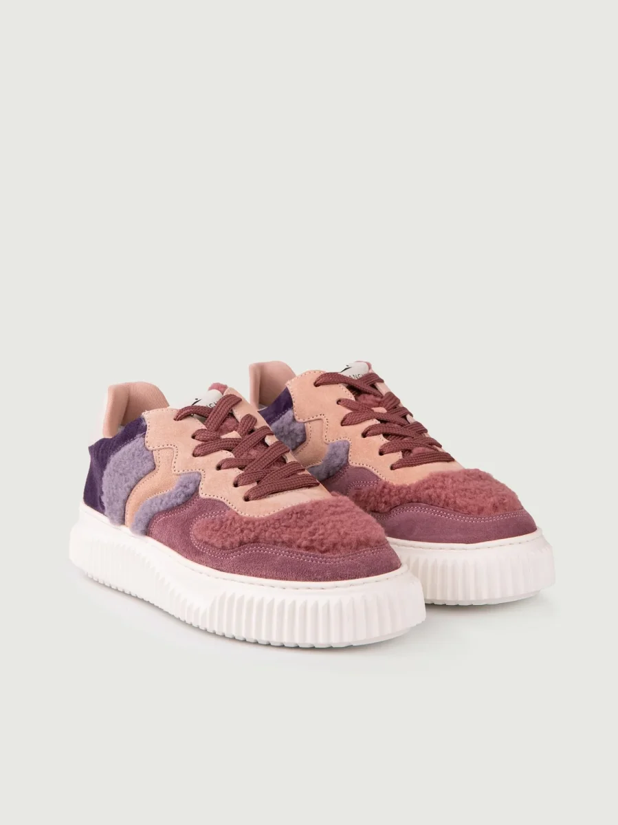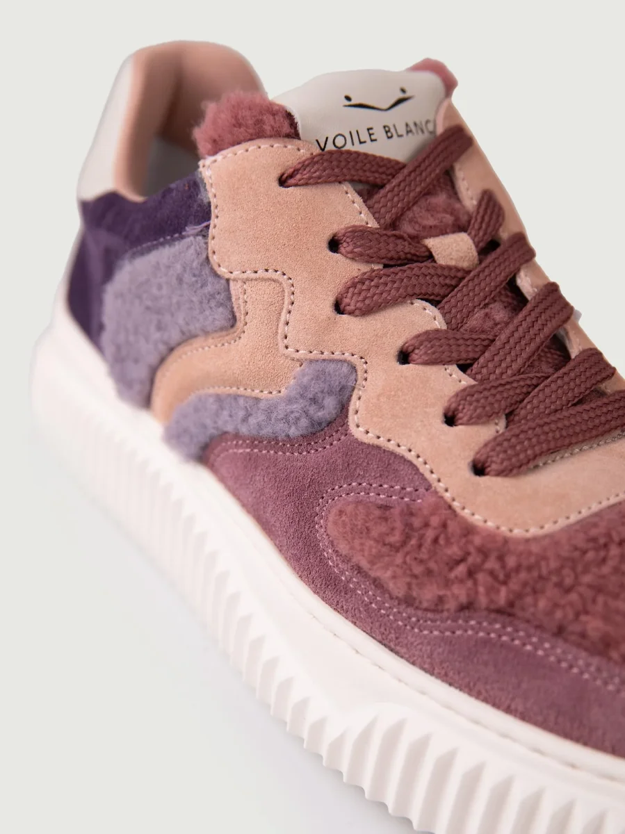 Sneaker in pelle scamosciata rosa antico e cipria, con inserti in montone viola, lilla e rosa