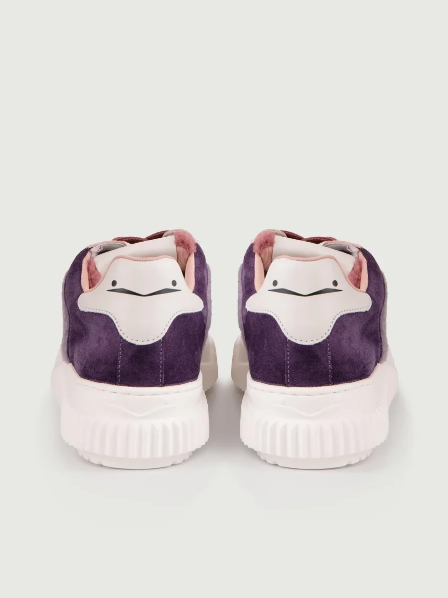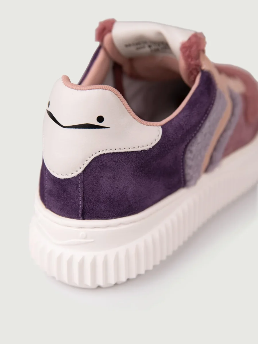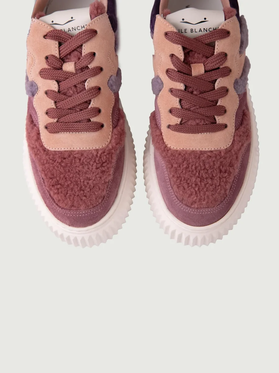 Sneaker in pelle scamosciata rosa antico e cipria, con inserti in montone viola, lilla e rosa