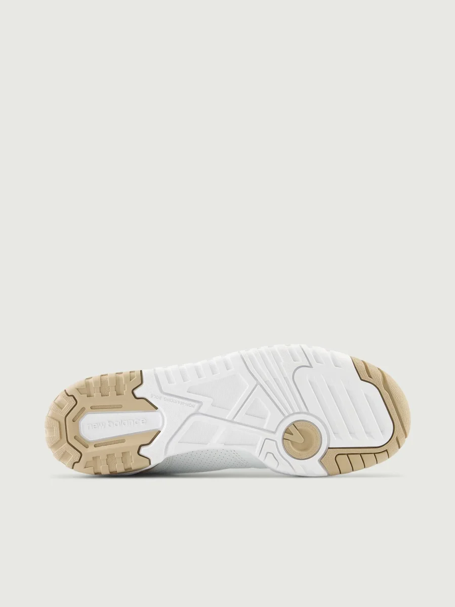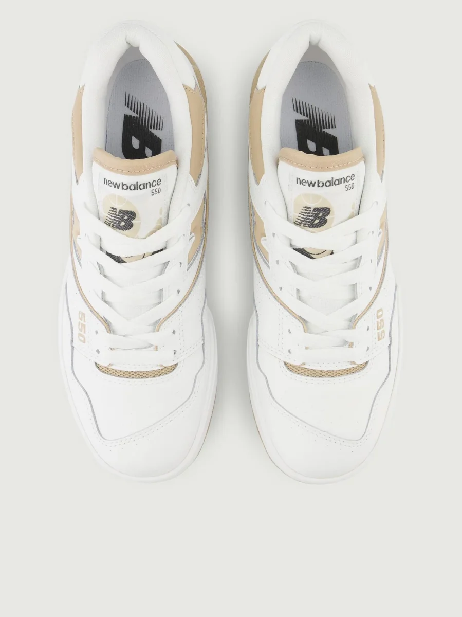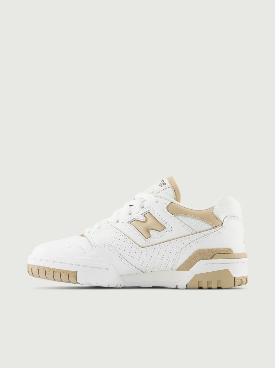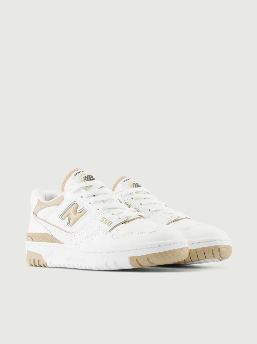 Sneaker 550 in pelle bianca con logo e dettagli beige.