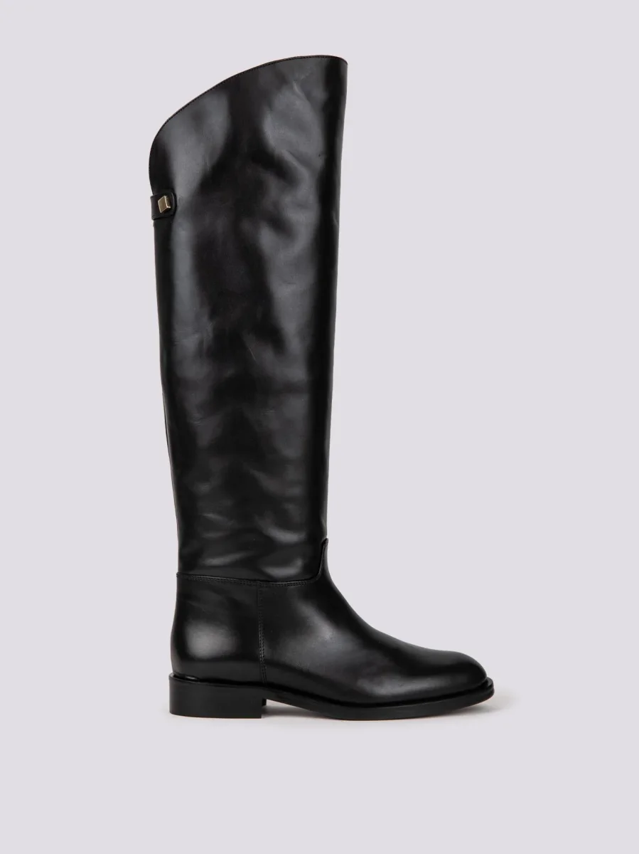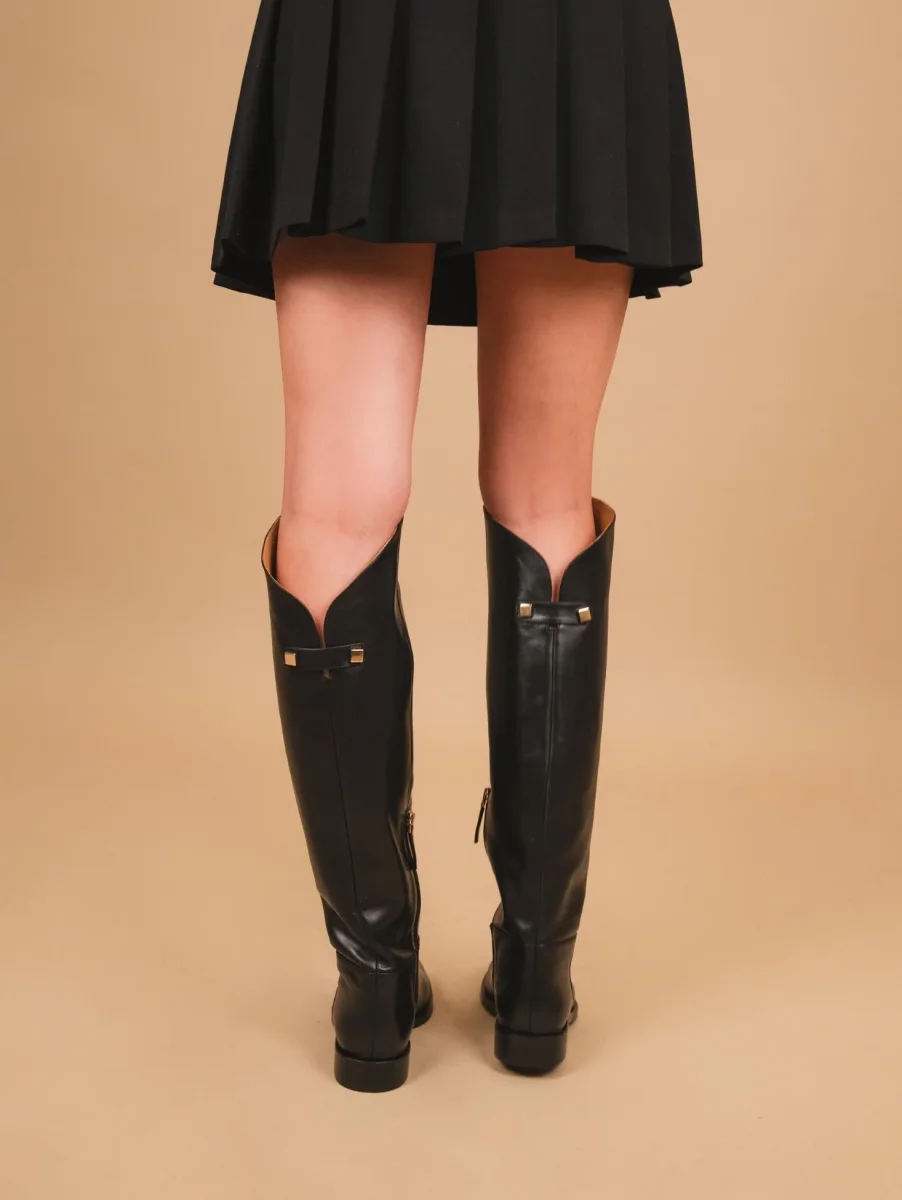 Stivale alto in pelle nera con gambale asimmetrico: più alto davanti e più corto dietro. Una scarpa essenziale da sfruttare nelle occasioni più disparate. Chiusura zip in metallo laterale che arriva fino a metà polpaccio per facilitare la calzata della scarpa. Punta stondata. Cuciture in rilievo in tonalità. Gambale largo che non si ripiega sulla caviglia e si erge fin al ginocchio. Calzata regolare super confortevole già dal primo utilizzo. Altezza rialzo: 3 cm. Tomaia e fodera in vera pelle. Suola in cuoio.