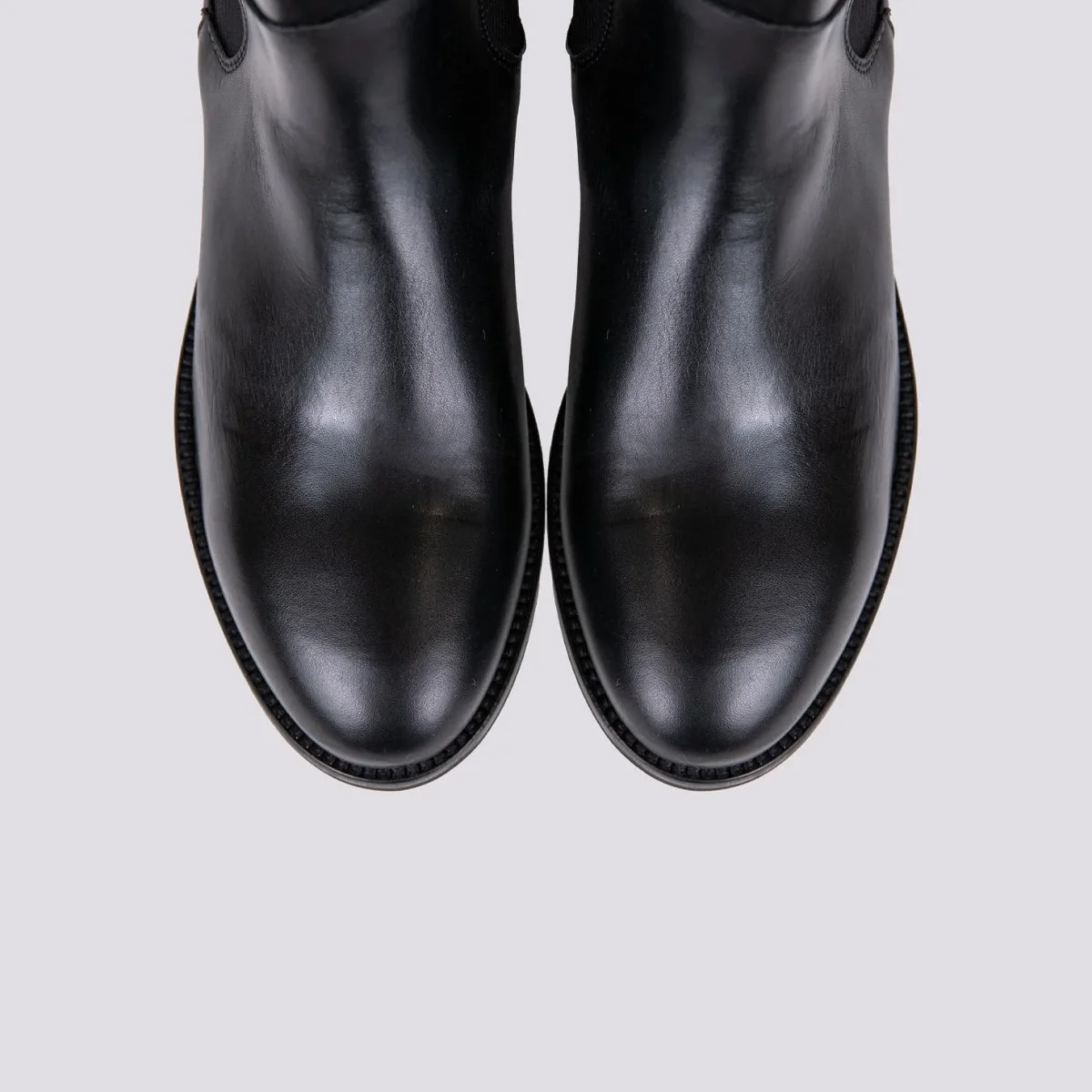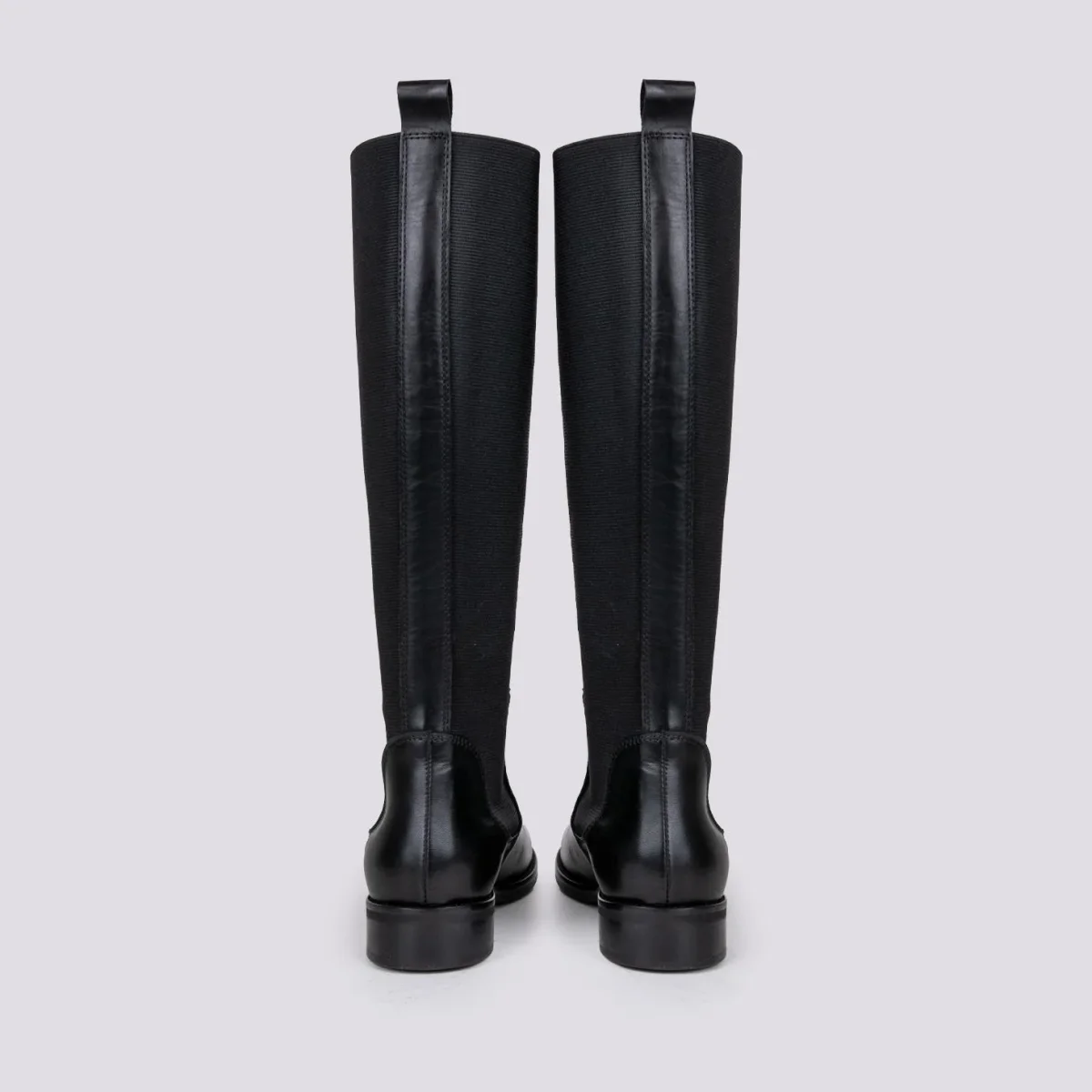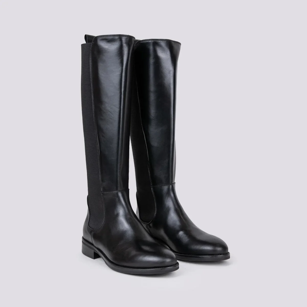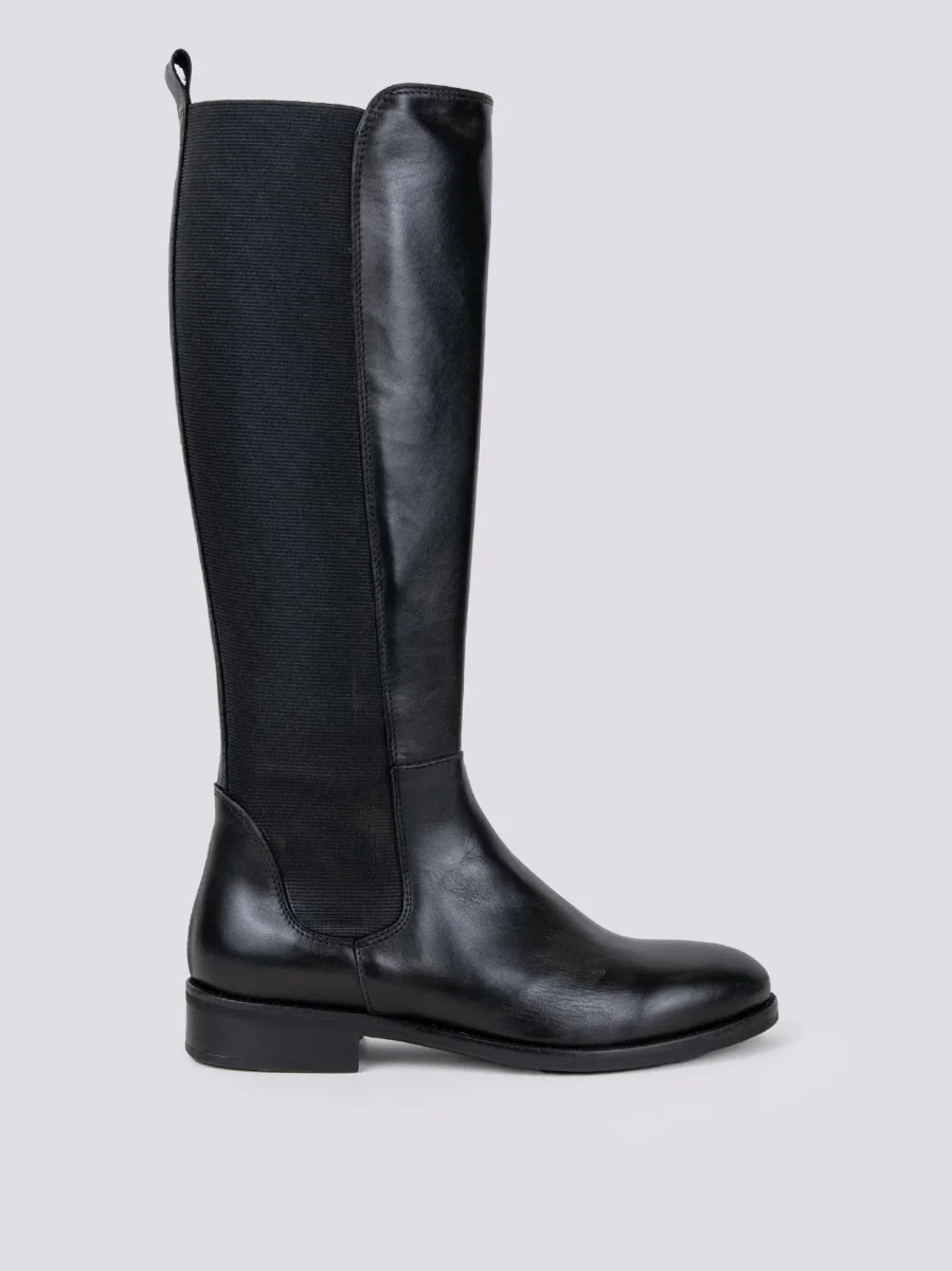 Stivale alto in pelle nero con maxi elastici laterali per facilitare la calzata della scarpa. Punta leggermente stondata. Tiretto in pelle in tonalità. Cuciture in rilievo. Altezza rialzo: 3 cm. Tomaia e fodera in vera pelle. Suola in gomma. Calzata leggermente abbondante.
