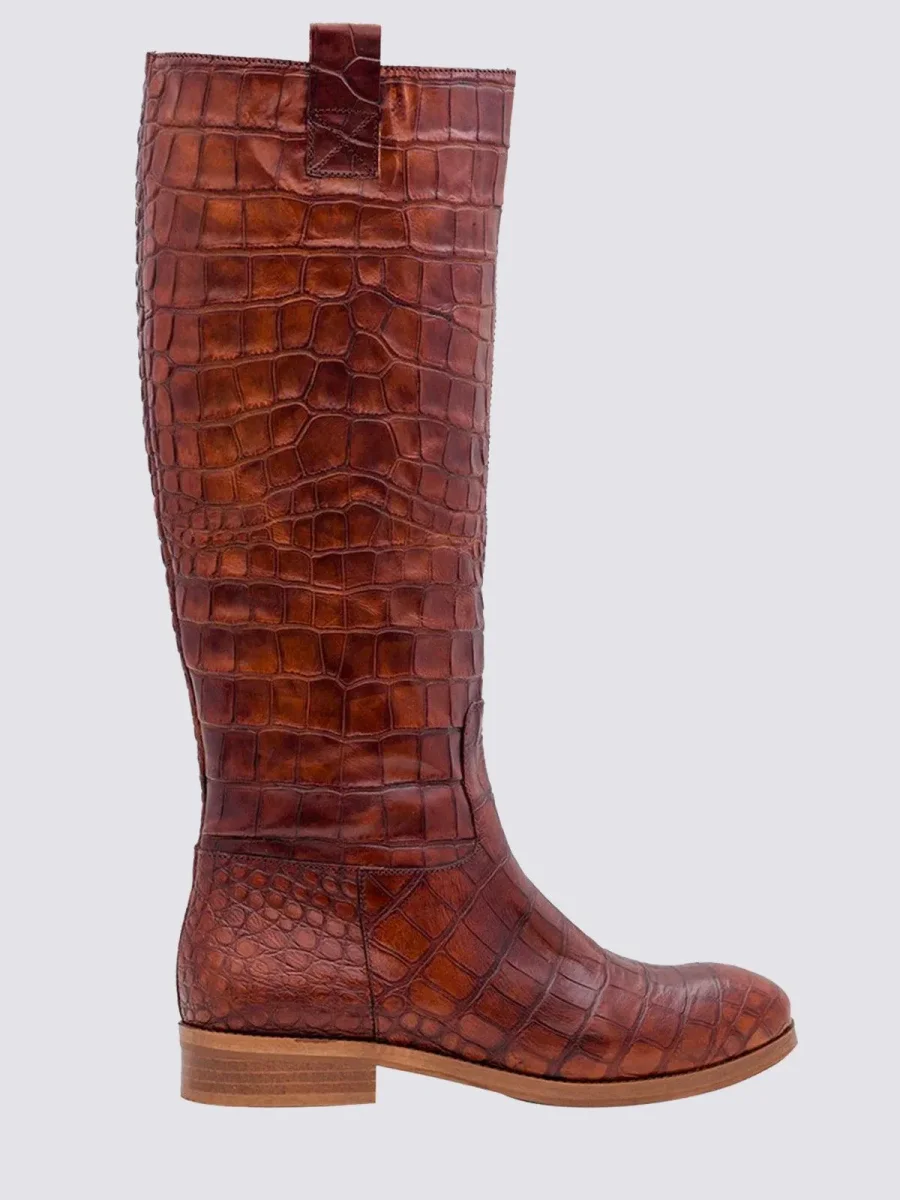 Stivale alto in camoscio nero con tacco spesso e plateau frontale. Zip laterale per facilitare la calzata della scarpa. Gambale rigido si erge fin sotto al polpaccio. Punta stondata. Altezza tacco: 8.5 cm. Altezza plateau: 2.5 cm. Tomaia e fodera in vera pelle. Suola in gomma. Calzata regolare.