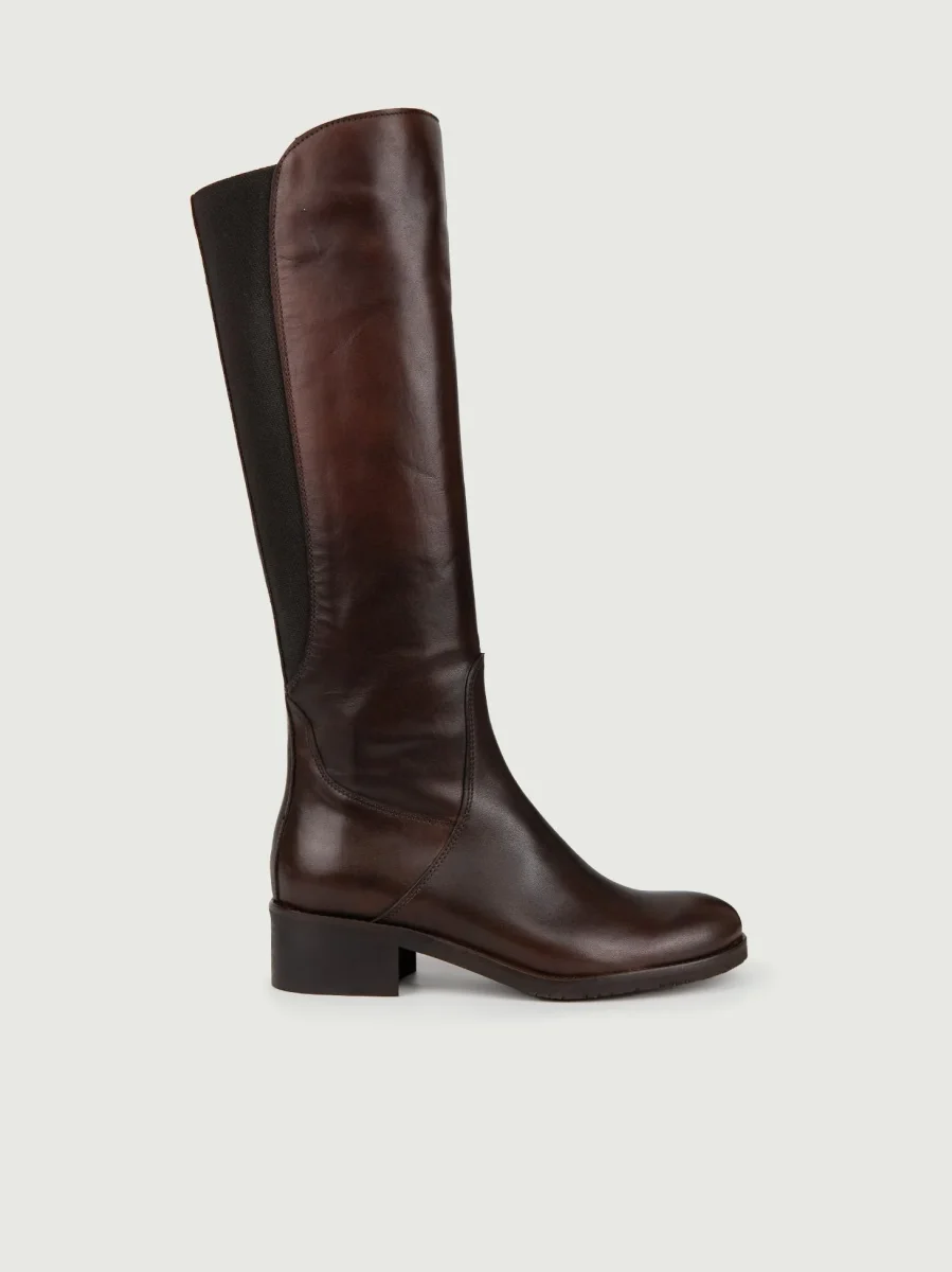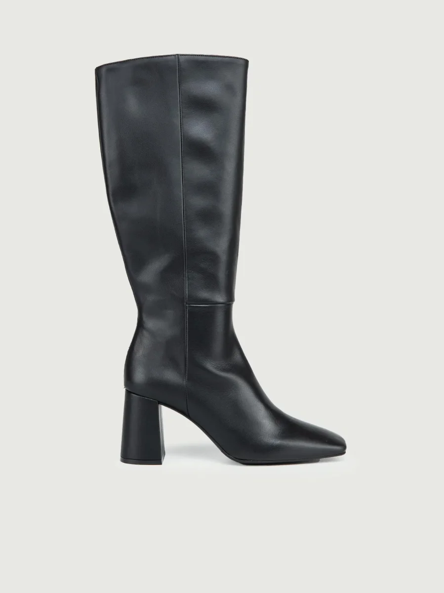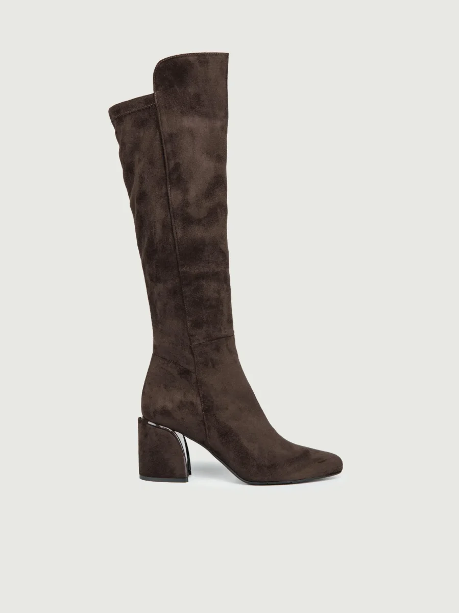 Stivale alto sopra il ginocchio in camoscio trattato. Punta stondata e suola in gomma. Altezza tacco 3 cm, altezza stivale: sotto al ginocchio. Dettaglio cuciture in tinta, modello realizzato in Vera pelle sia tomaia sia la fodera.