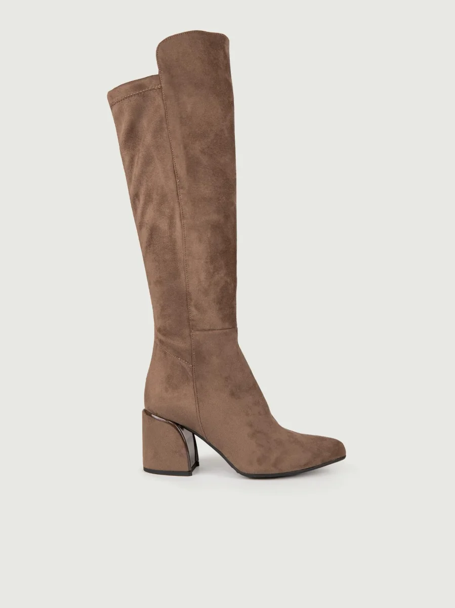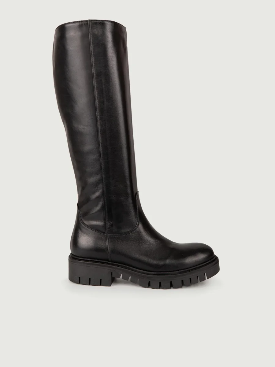 Stivale alto in pelle cuoio effetto naplak con tacco optical spesso, un must-have assoluto per le donne che amano questa tipologia di calzatura e sono alla ricerca di qualcosa di grintoso e diverso dal solito. Chiusura zip in metallo laterale per facilitare la calzata della scarpa. Punta leggermente stondata. Cuciture a vista in tonalità. Gambale rigido alto fin sotto al ginocchio. Altezza tacco: 7.5 cm. Calzata regolare. Tomaia e fodera in vera pelle. Suola in gomma.