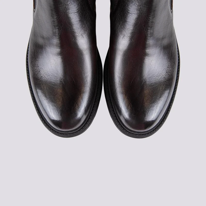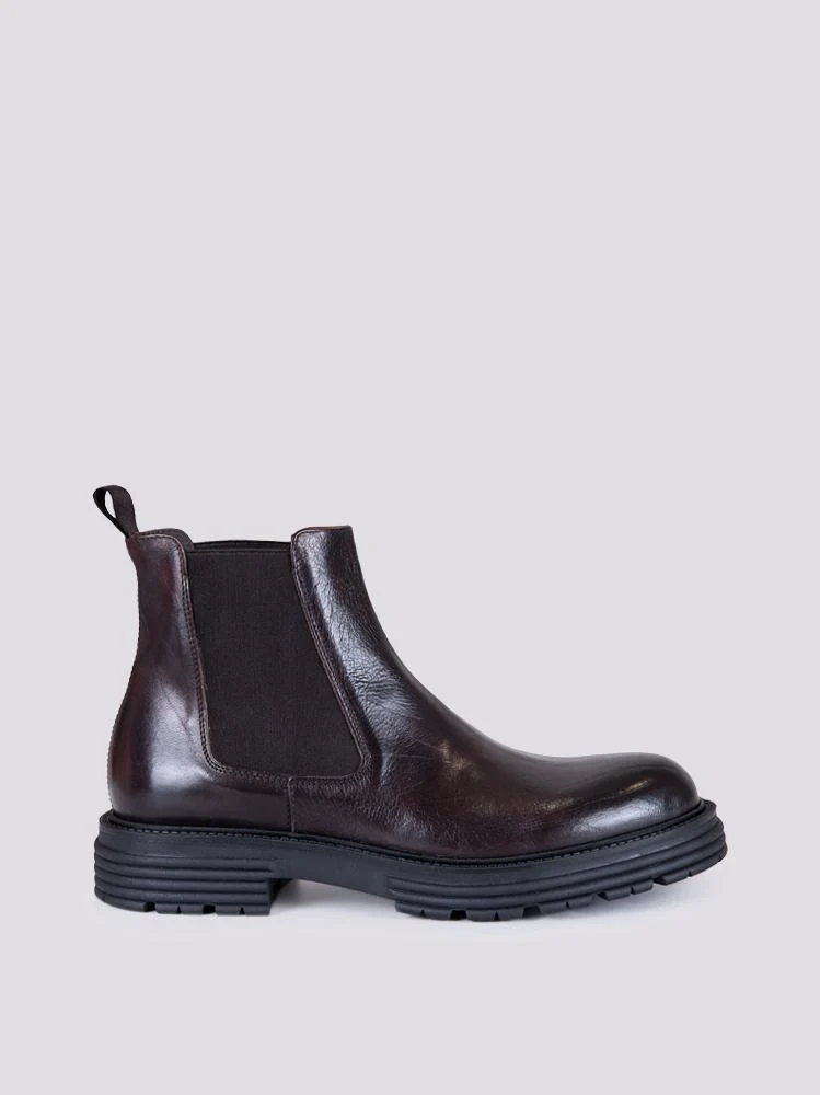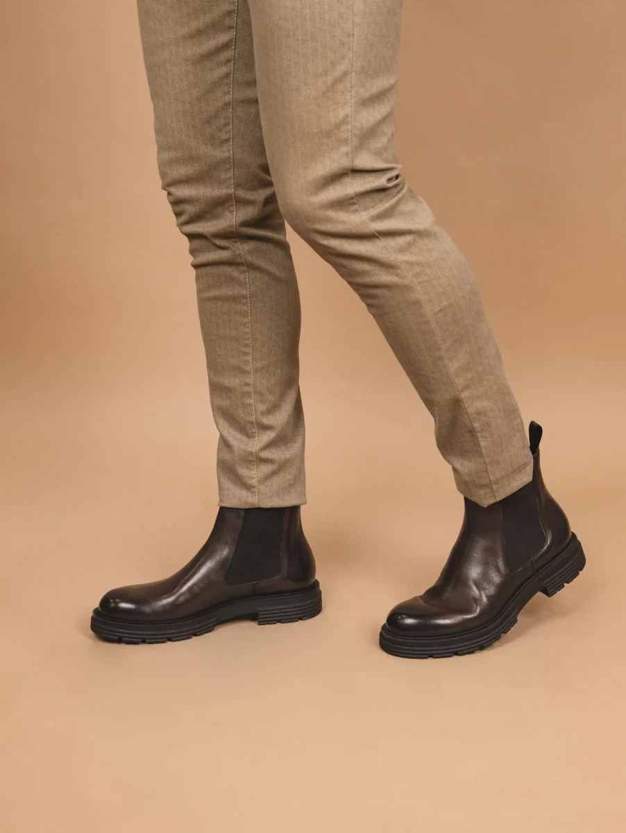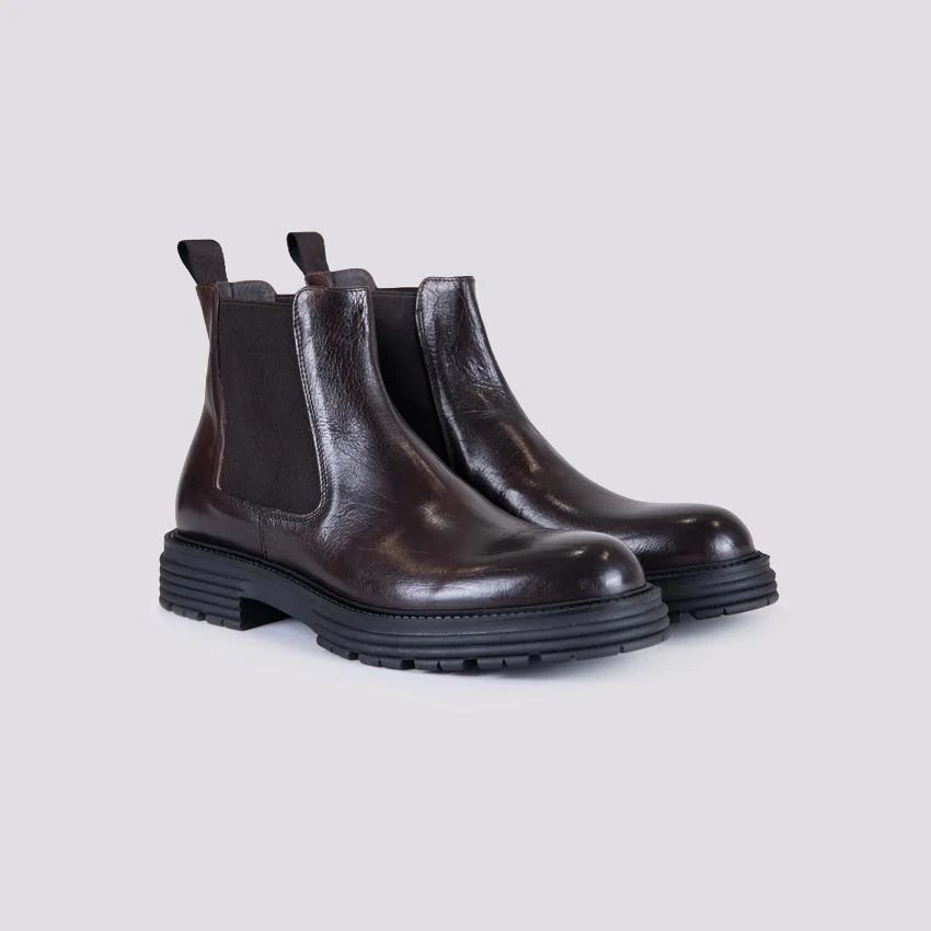 Stivaletto in pelle spazzolata testa moro con suola carro armato. La rivisitazione moderna di un classico senza tempo. Elastico in tessuto su entrambi i lati per facilitare la calzata della scarpa. Altezza para: 3 cm. Linguetta in tessuto in tonalità sulla parte posteriore della scarpa. Tomaia e fodera in vera pelle. Suola in gomma. Calzata abbondante, si consiglia l’acquisto di un numero in più.