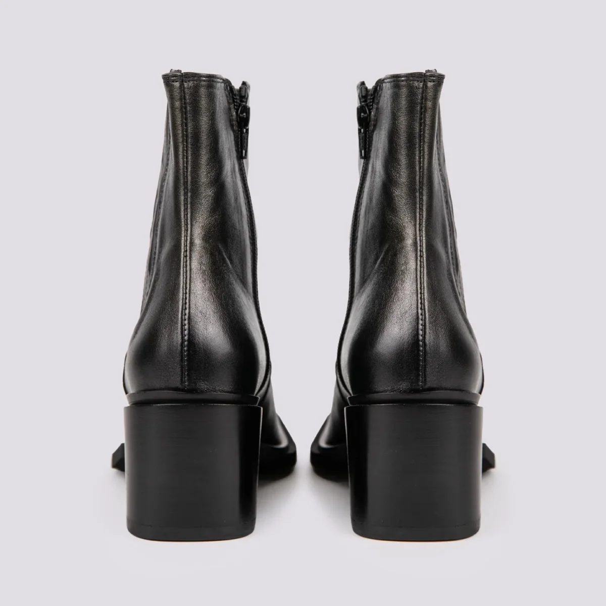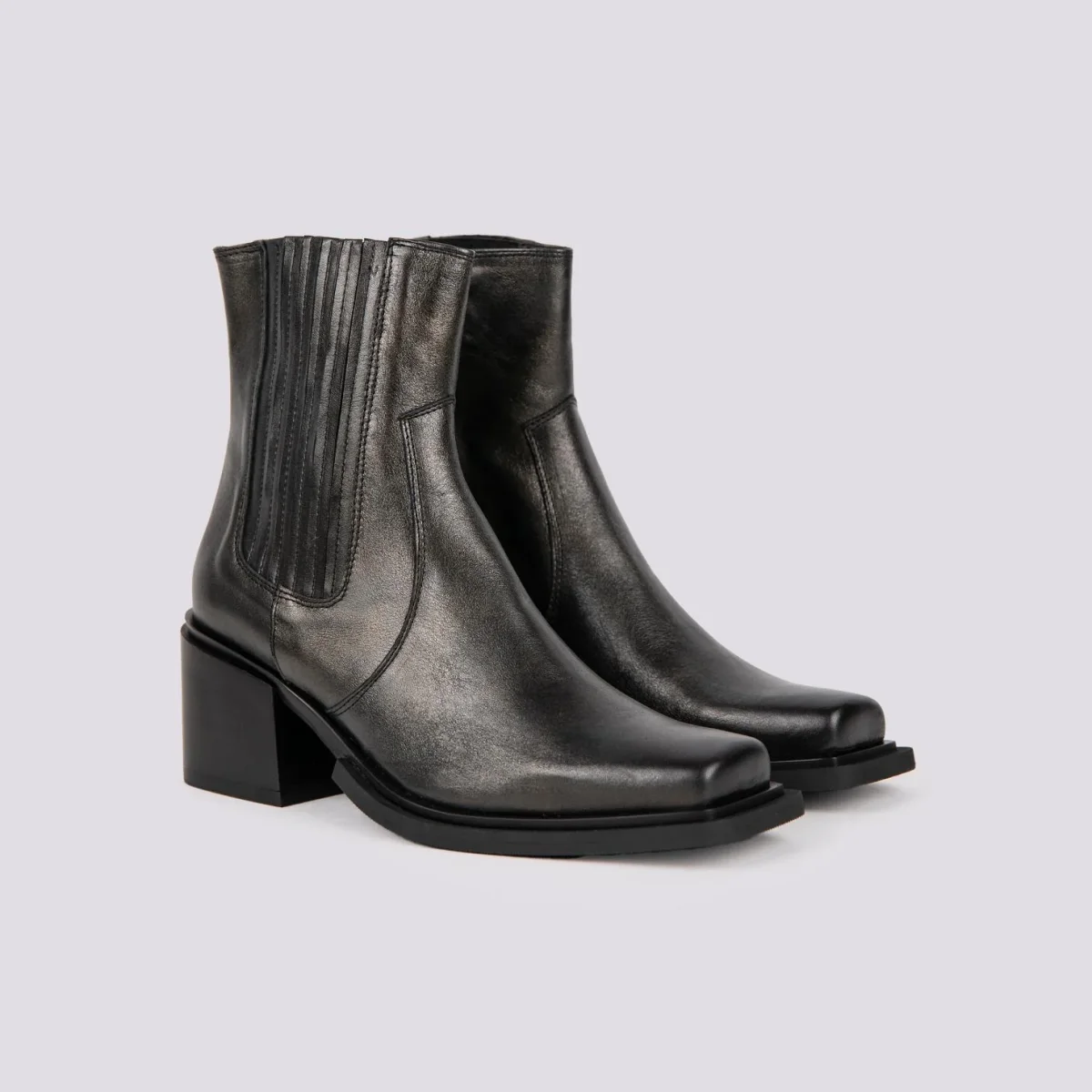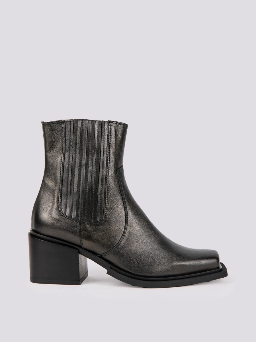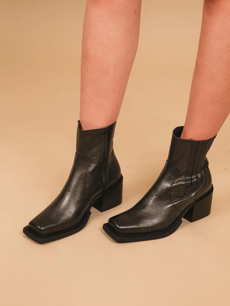 Stivaletto texano in pelle laminata nera. La punta quadrata di questa scarpa aggiunge un tocco di grinta in più. Chiusura zip in metallo laterale. Dettaglio cuciture a vita. Elastico sulla parte esterna della caviglia per rendere il gambale più confortevole. Altezza tacco: 7 cm. Tomaia e fodera in vera pelle. Suola in gomma. Calzata regolare.