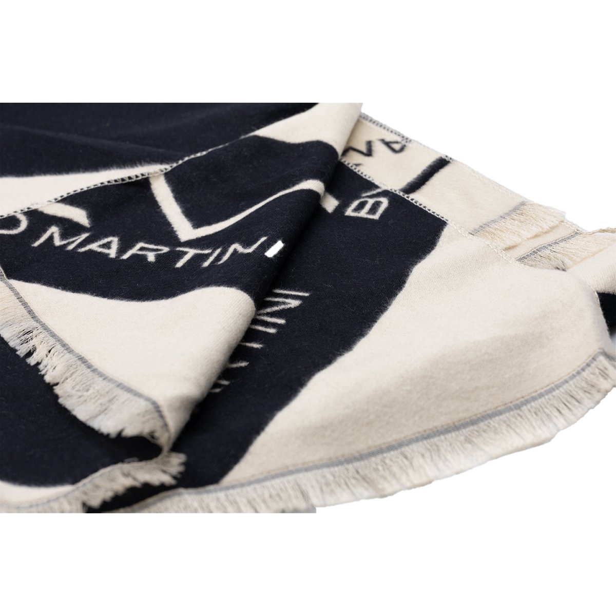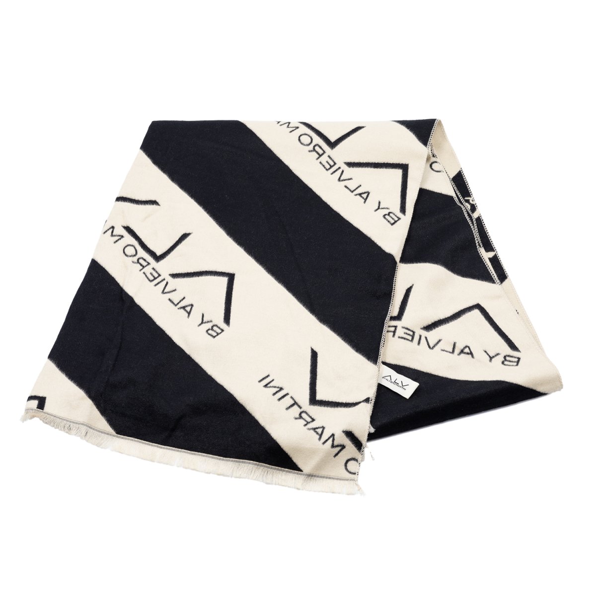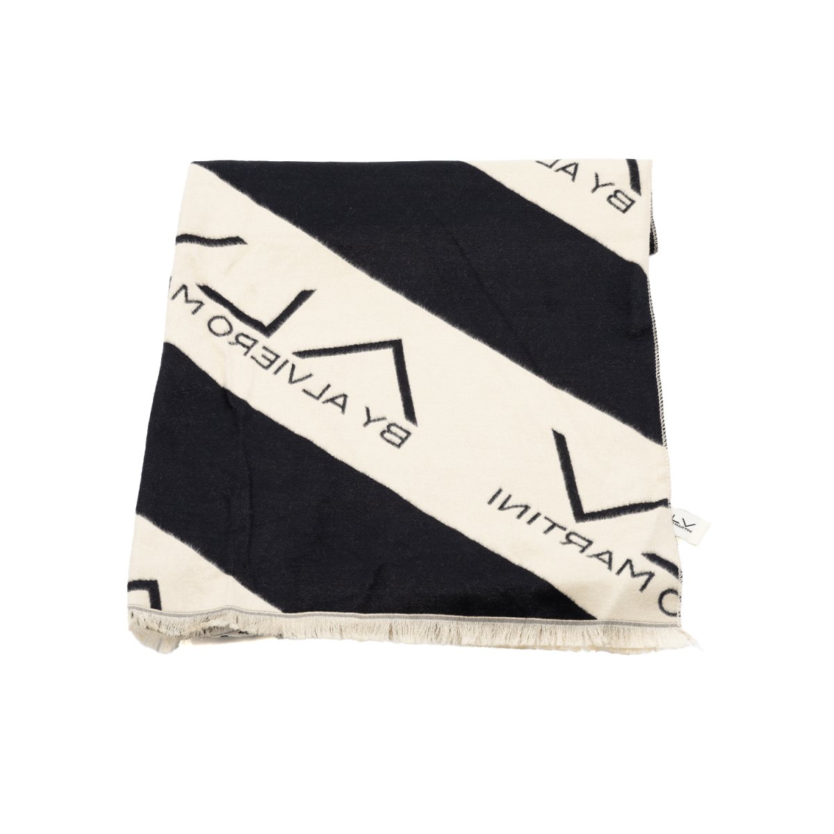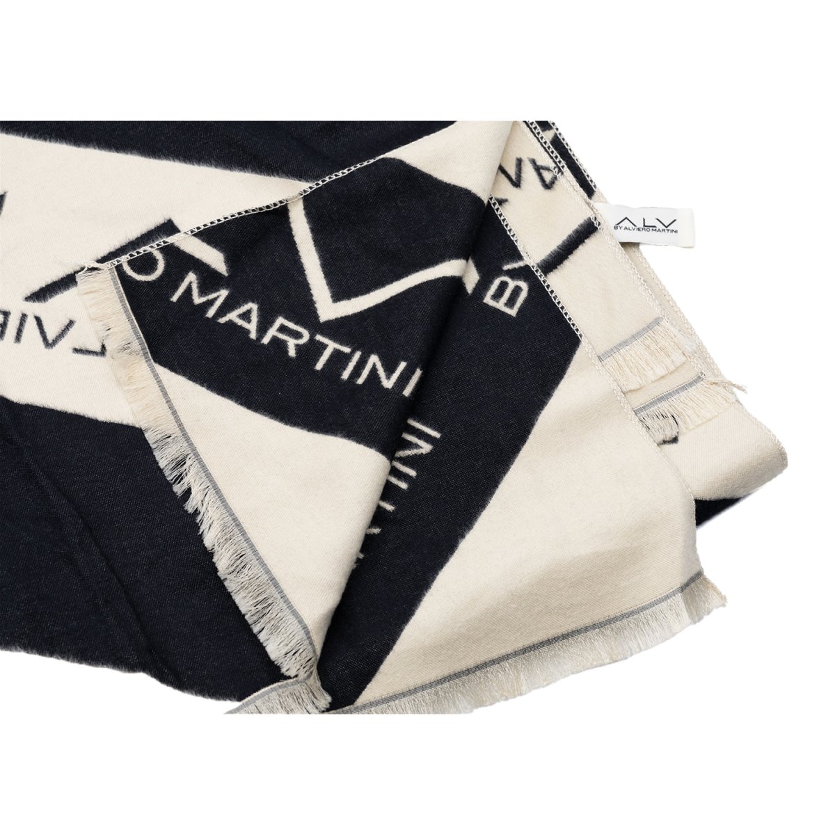 Foulard in tessuto firmato ALV by Alviero Martini, caratterizzato da un moderno motivo a bande diagonali con maxi logo a contrasto. Realizzato in materiale morbido e piacevole al tatto, dona comfort e un tocco di eleganza contemporanea a ogni look. Le frange sottili sul bordo completano il design, rendendolo un accessorio versatile ideale per ogni occasione.