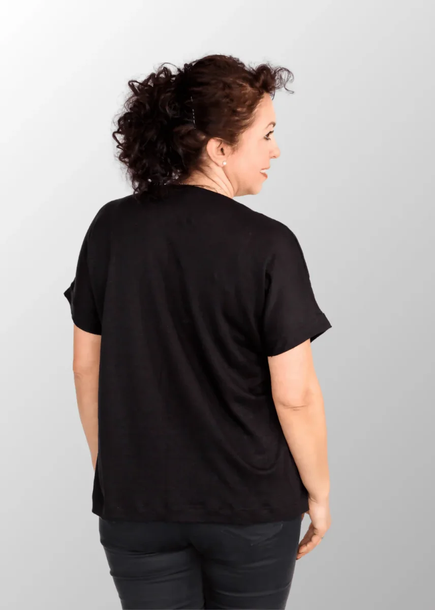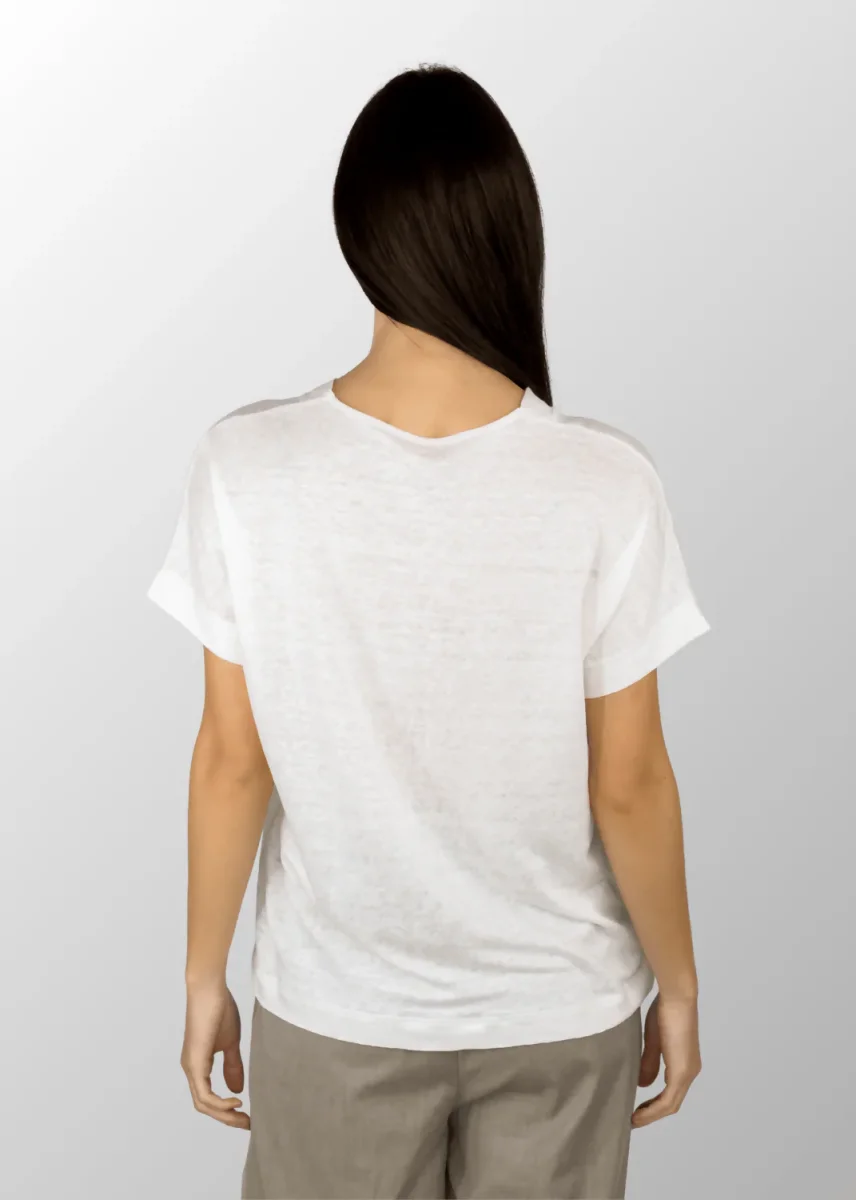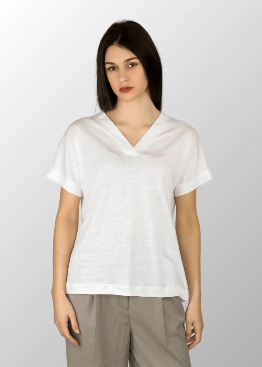 T-shirt da donna con scollo a V in Puro Lino, la scelta ideale per l’estate. La sua leggerezza e traspirabilità ti garantiscono freschezza e comfort in ogni occasione. Il design minimalista la rende facilmente abbinabile a qualsiasi outfit, mentre lo scollo a V aggiunge un tocco di femminilità ed eleganza. Perfetta con pantaloni a sigaretta e sandali, per un look casual ma raffinato.