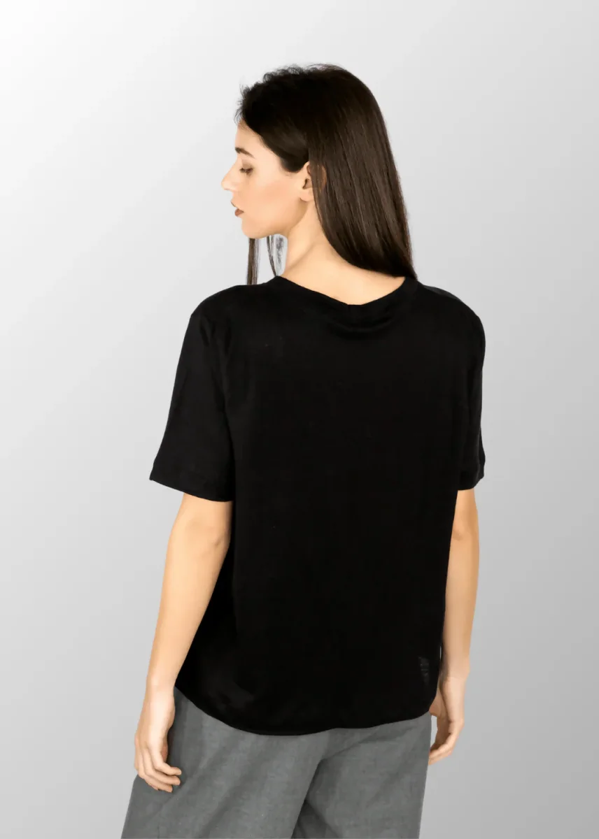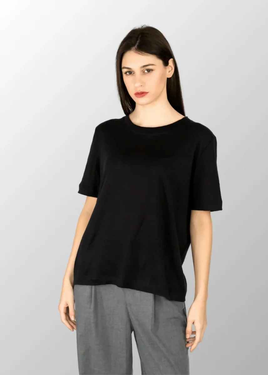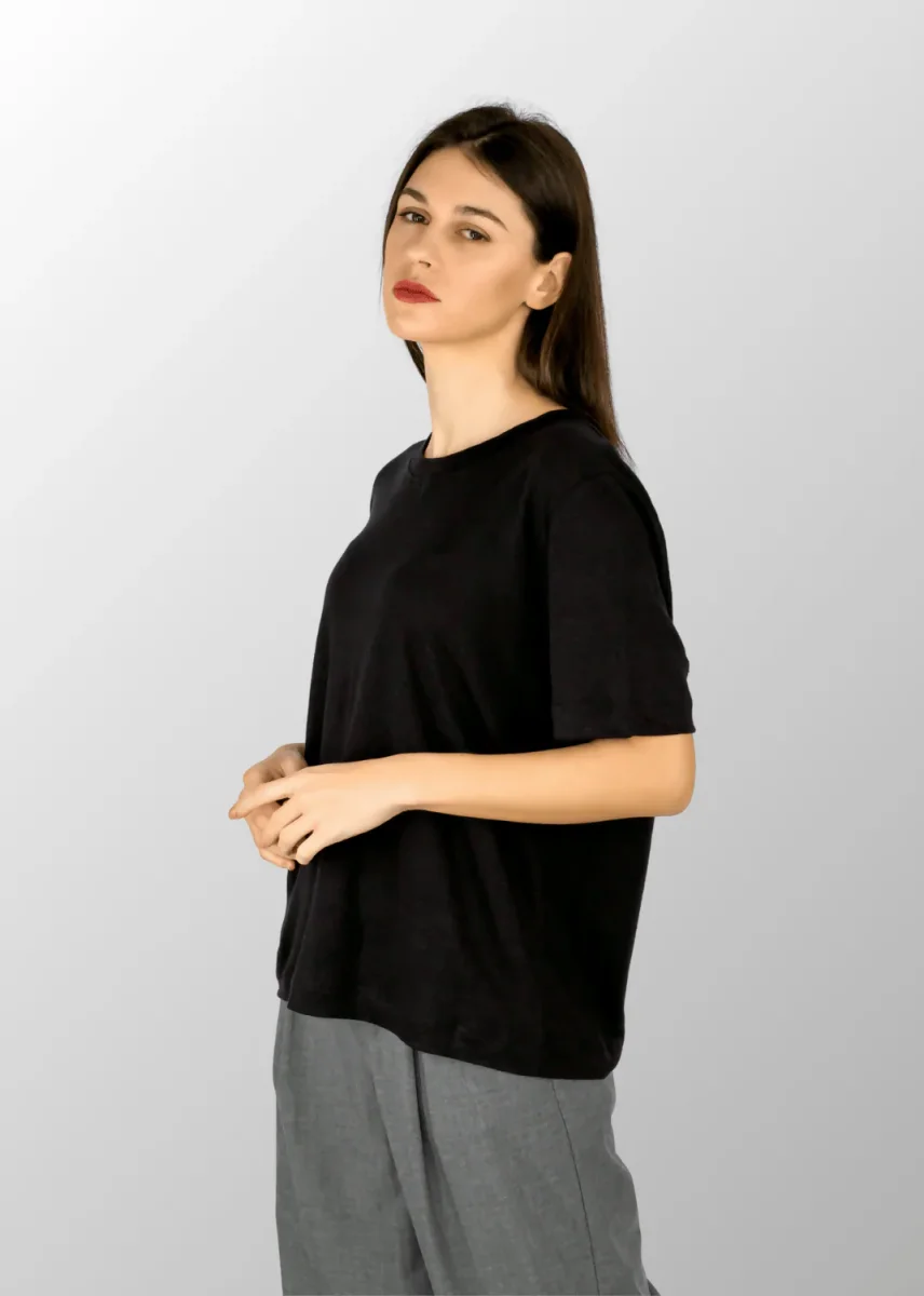 T-shirt larga da donna in Puro Lino, dal taglio morbido e leggero, perfetta per garantire freschezza e comfort nelle giornate estive. Il lino, fibra naturale di origine vegetale, dona traspirabilità e con le sue irregolarità uniche, esalta la bellezza autentica di ogni capo. Versatile e raffinata, questa maglia si abbina facilmente a pantaloni, shorts o gonne, aggiungendo classe naturale al tuo look quotidiano.