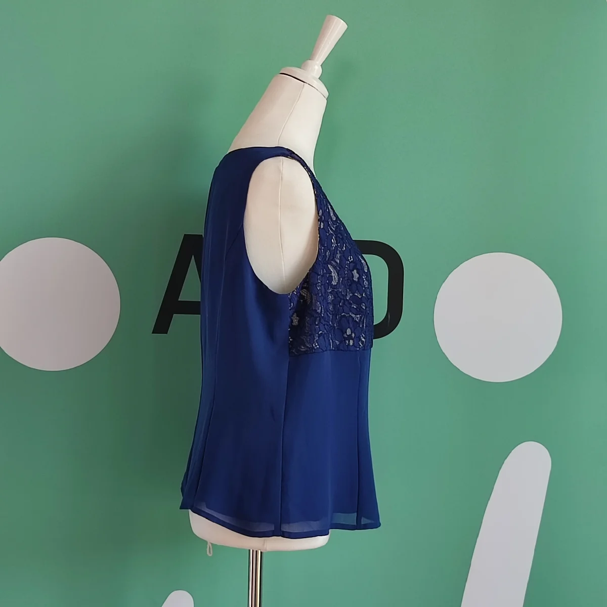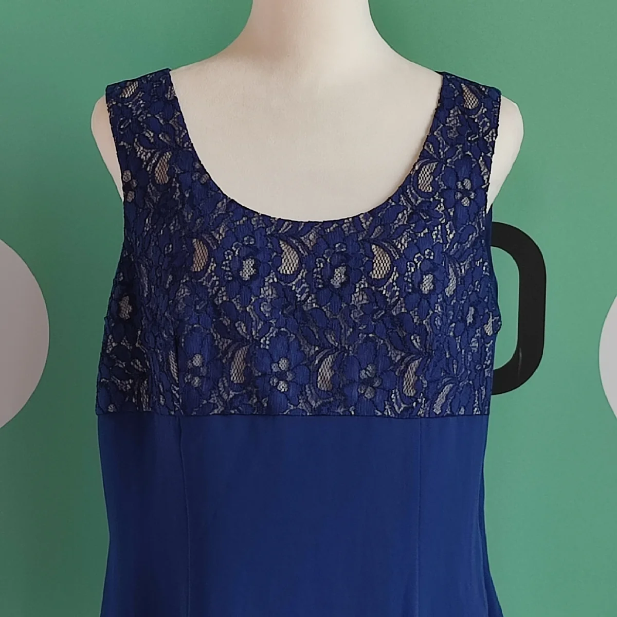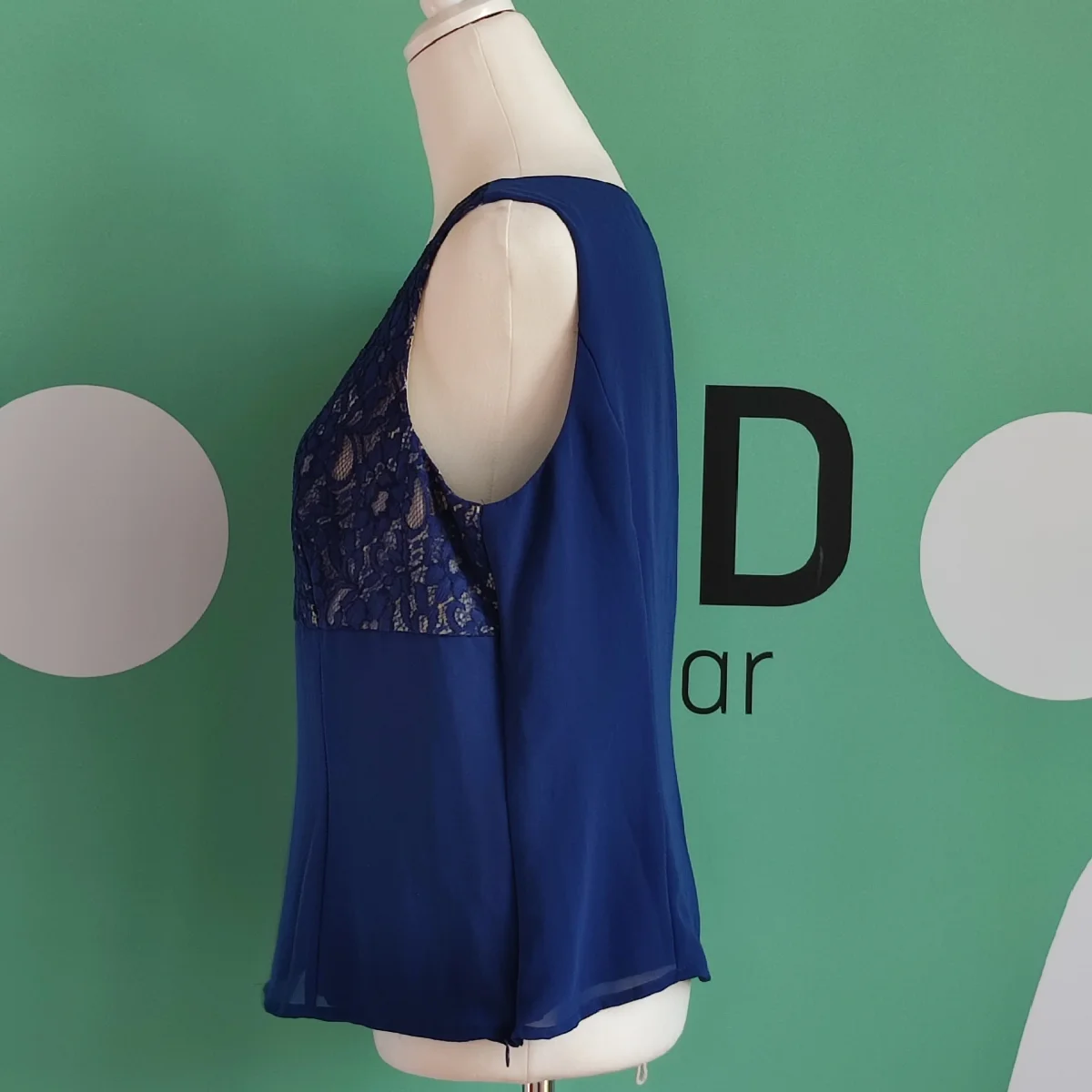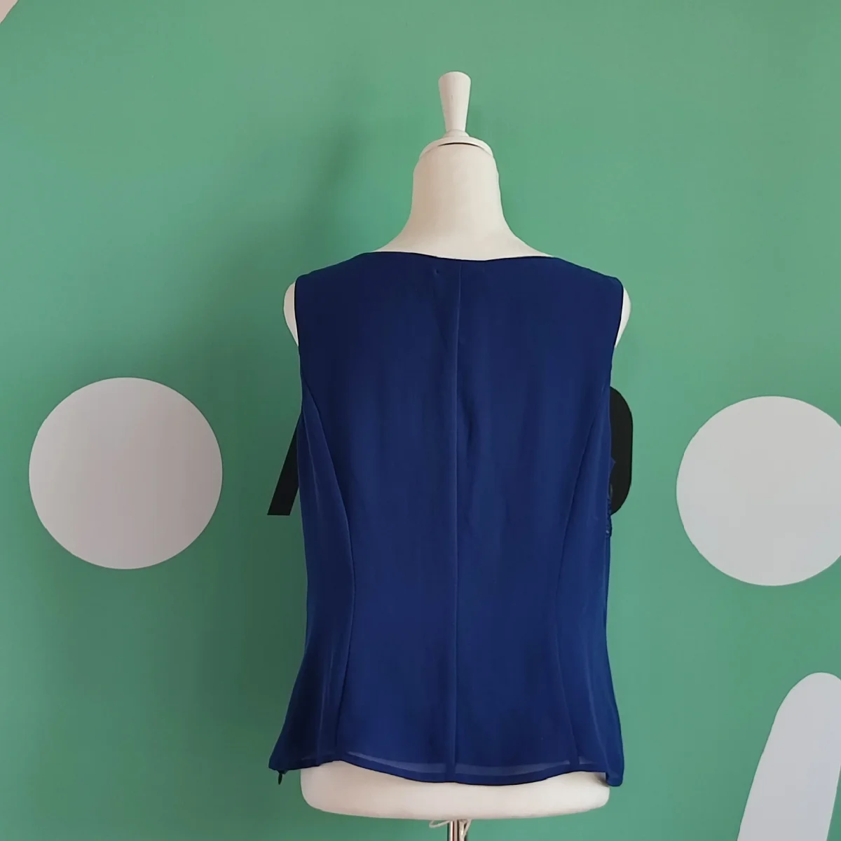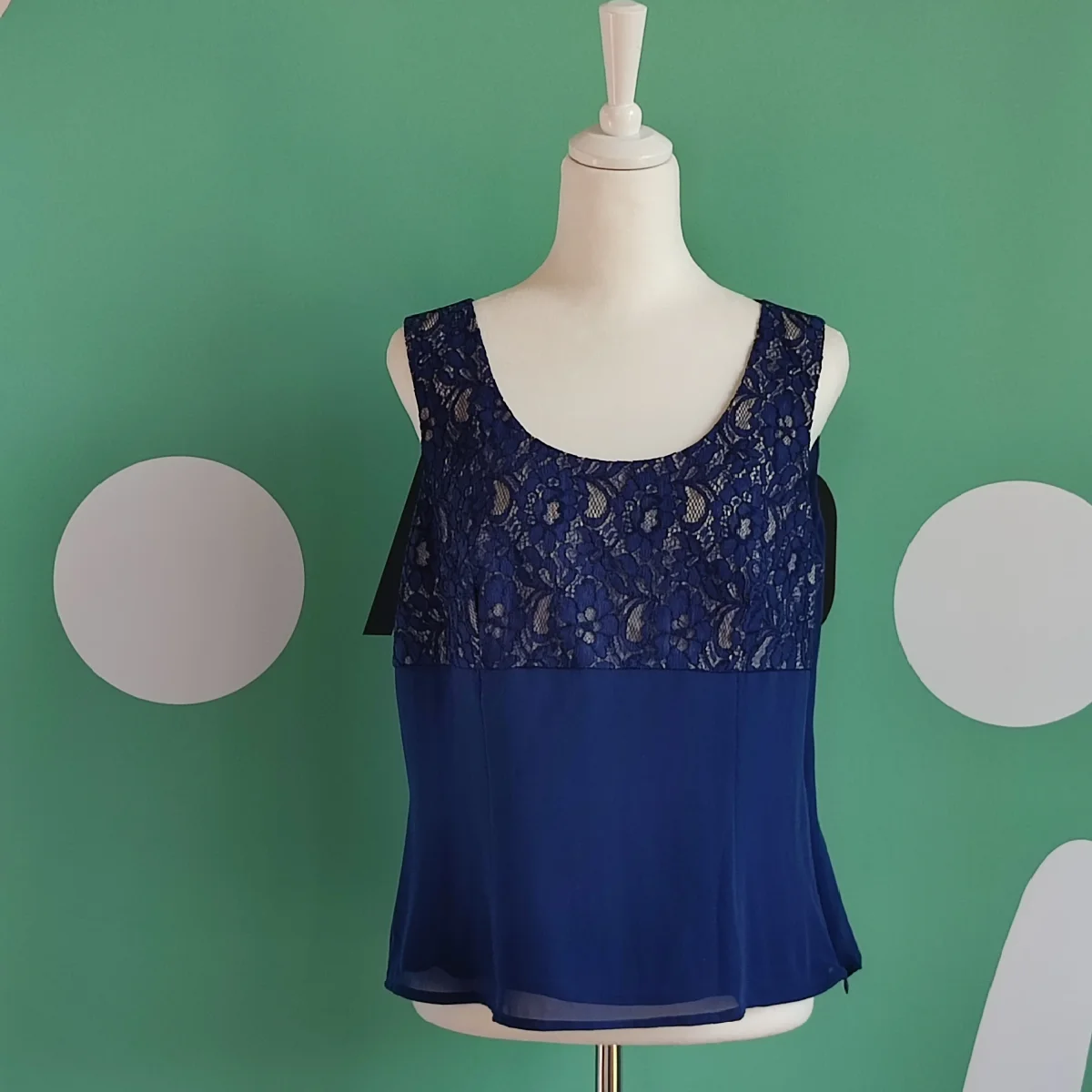 Top Blu con ricami in pizzo in alto dallo stile Floreale. Pizzo blu. Corte dei Gonzaga. Taglia 48, XL. Tessuto in 100% Poliestere. Foderato in 100% Acetato. In ottime Condizioni