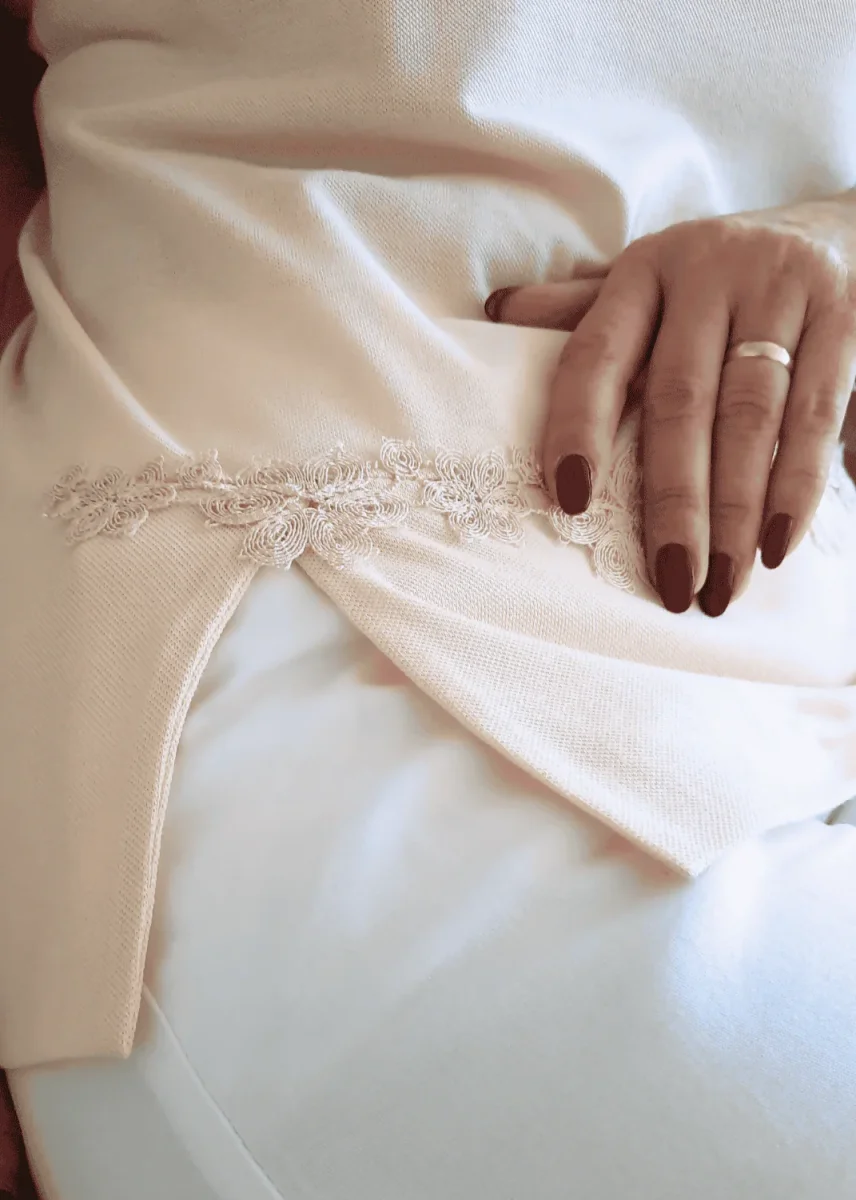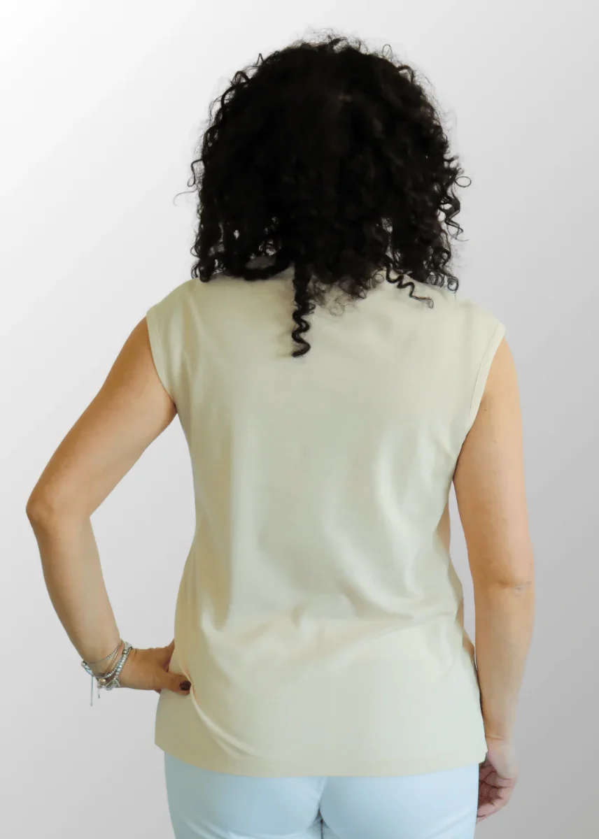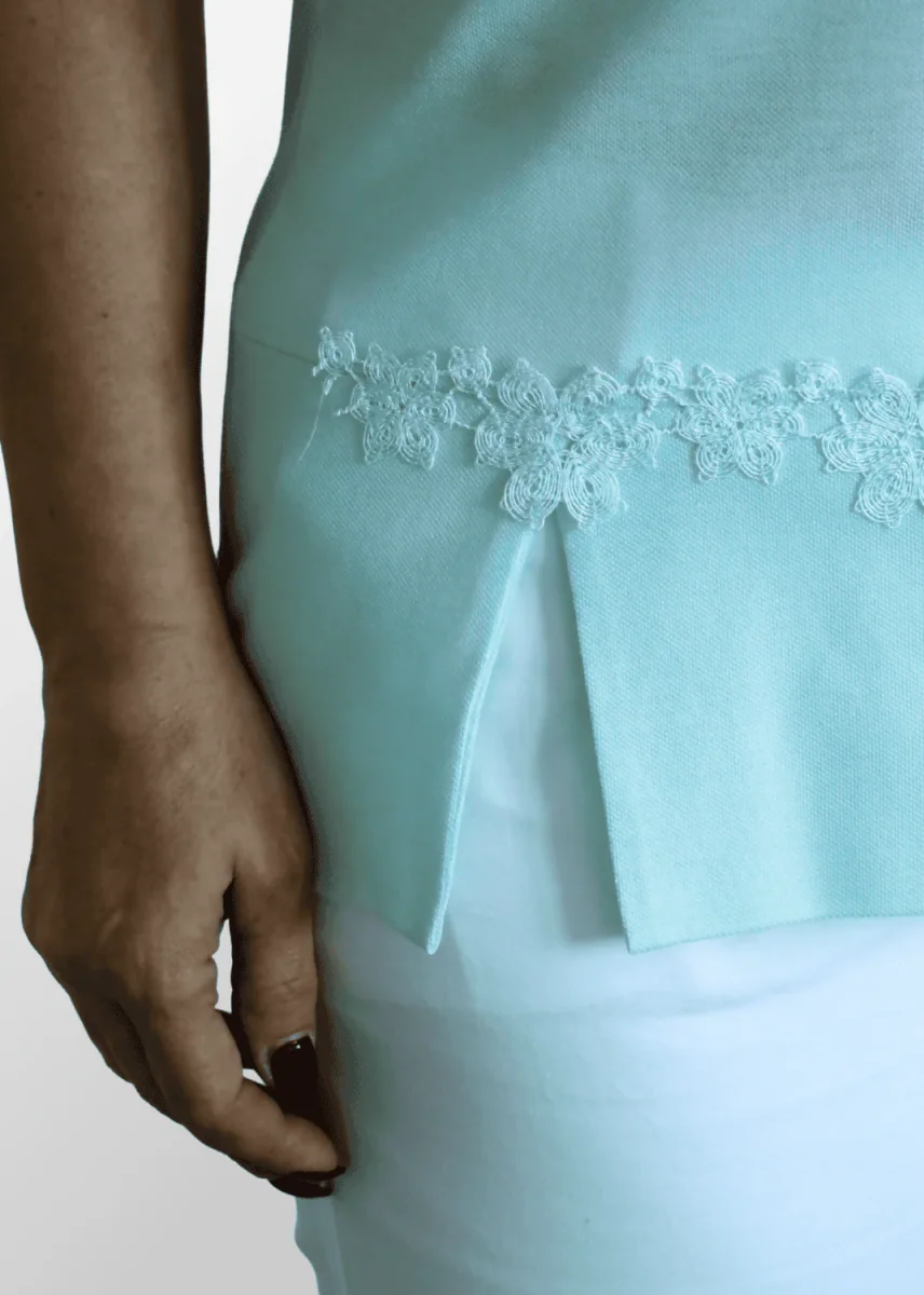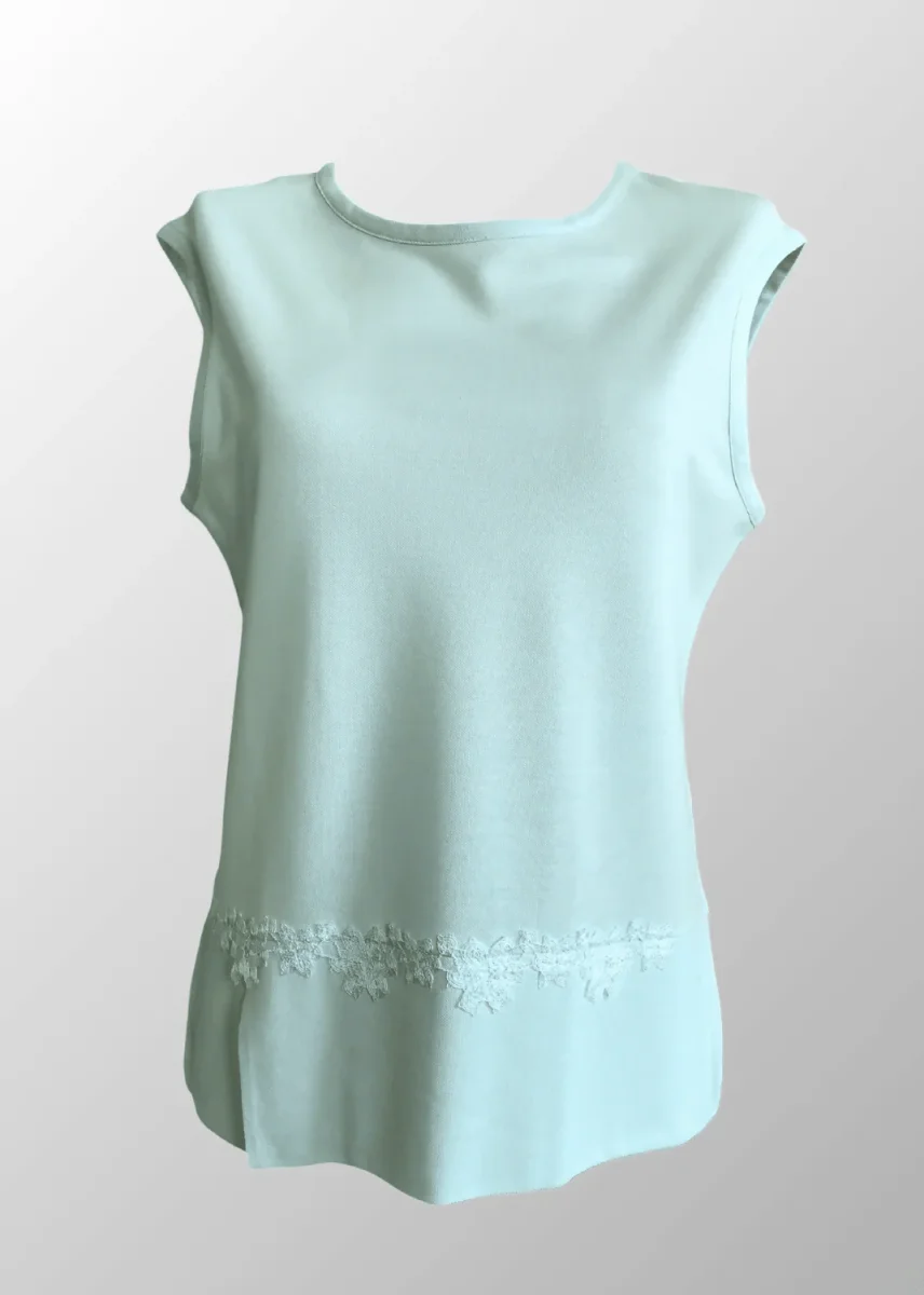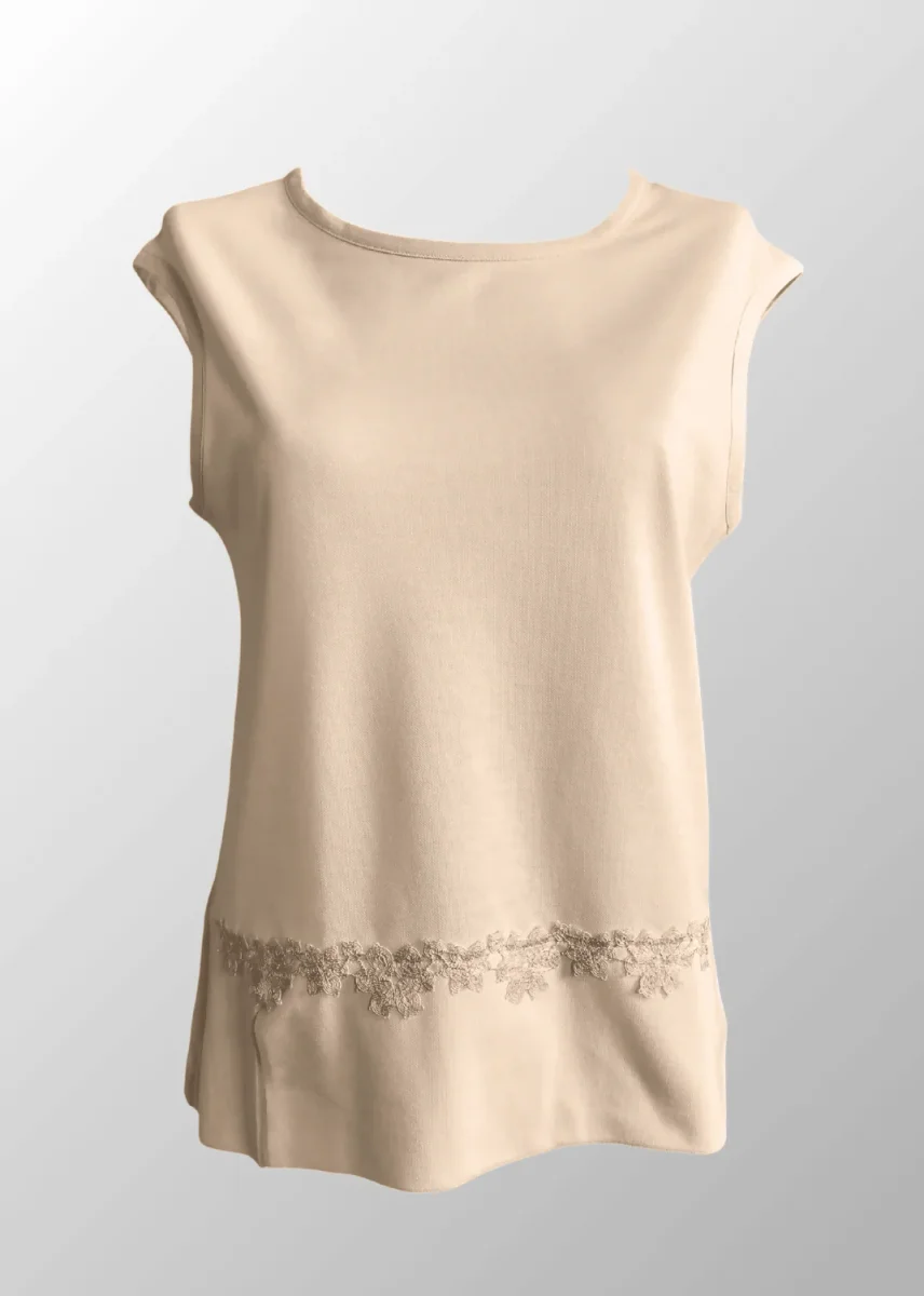 Top smanicato da donna in Cotone Seta. Presenta un dettaglio in pizzo macramé sul busto e degli spacchi laterali che slanciano la figura. Il tessuto è realizzato in piquet, una particolare trama a “nido d’ape” nota per la sua resistenza e traspirabilità. Si tratta di un capo molto indicato per la stagione estiva che mantiene inalterate forma e lucentezza anche dopo numerosi lavaggi. Look sia casual che elegante per ogni occasione.