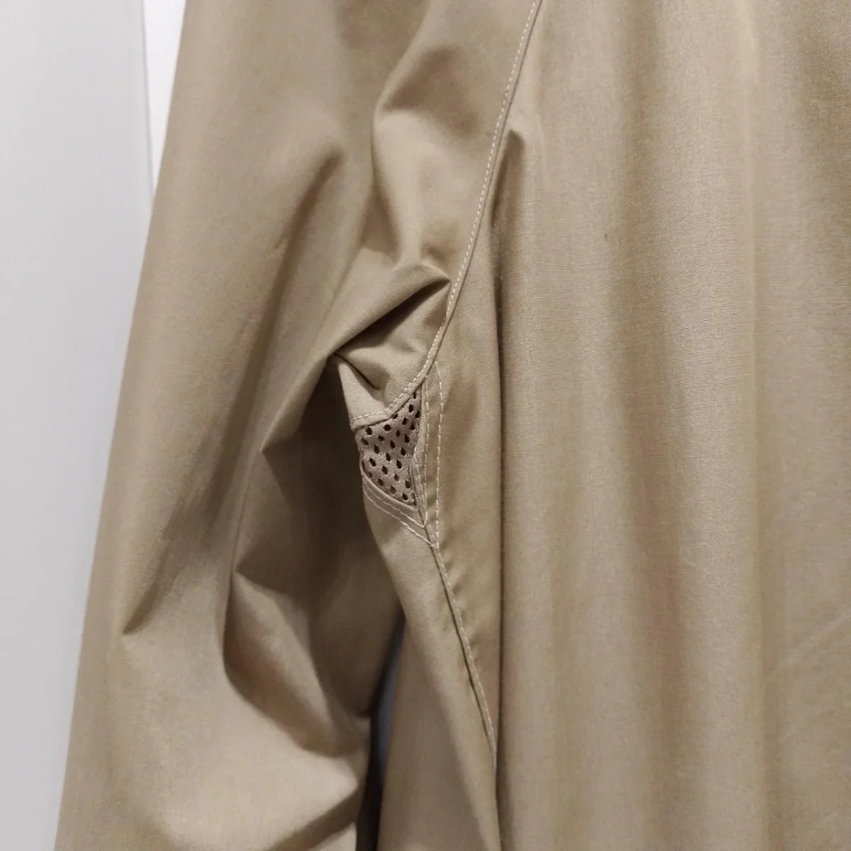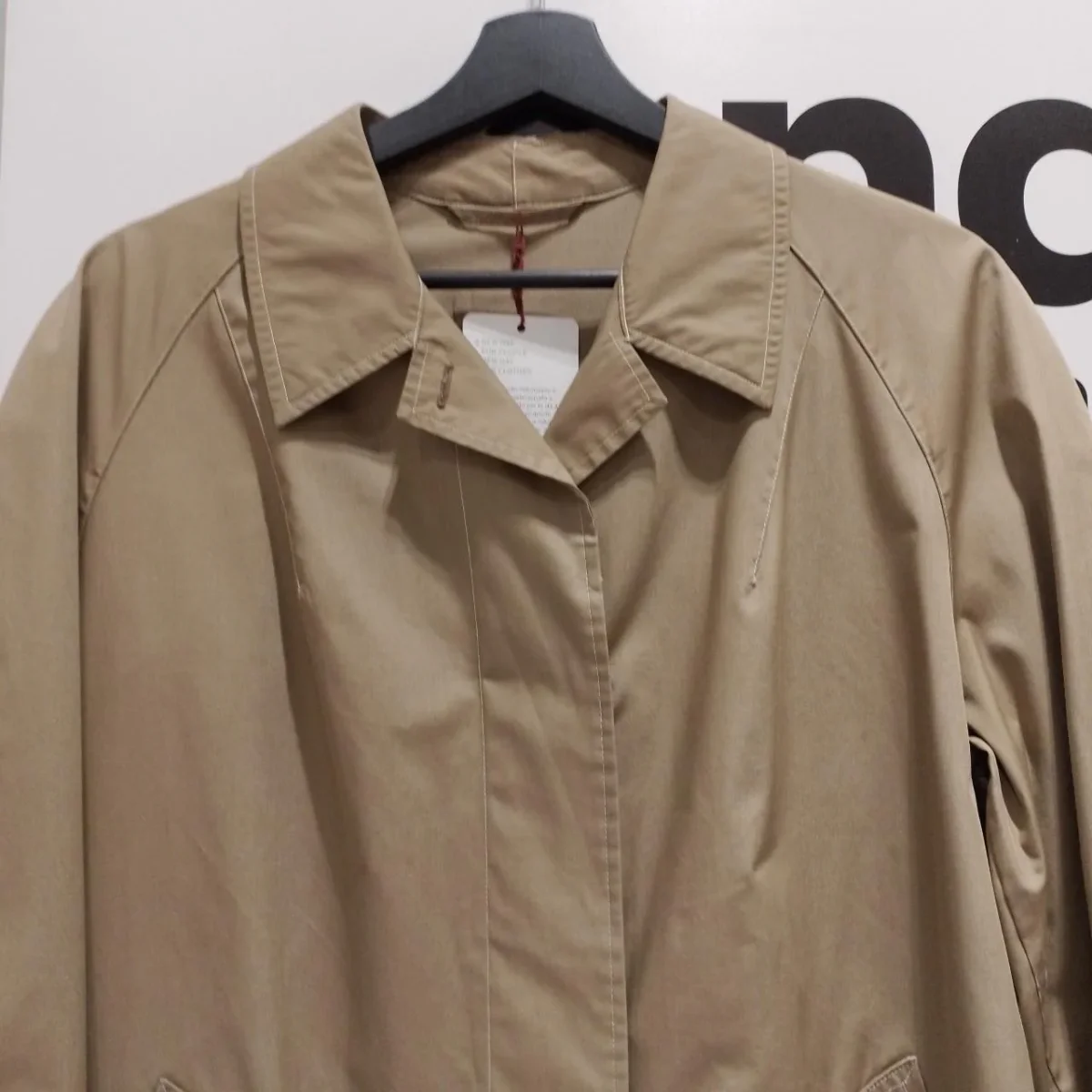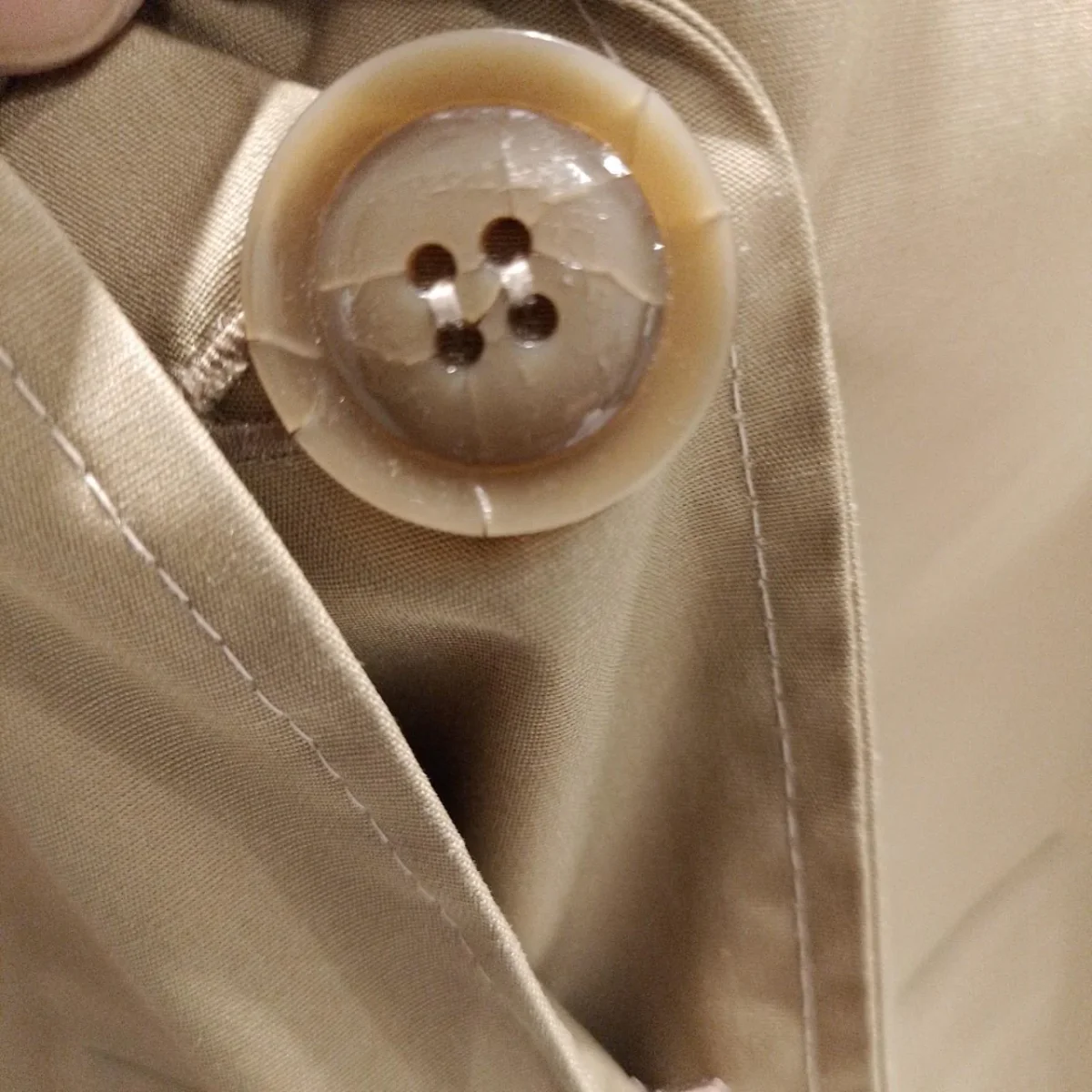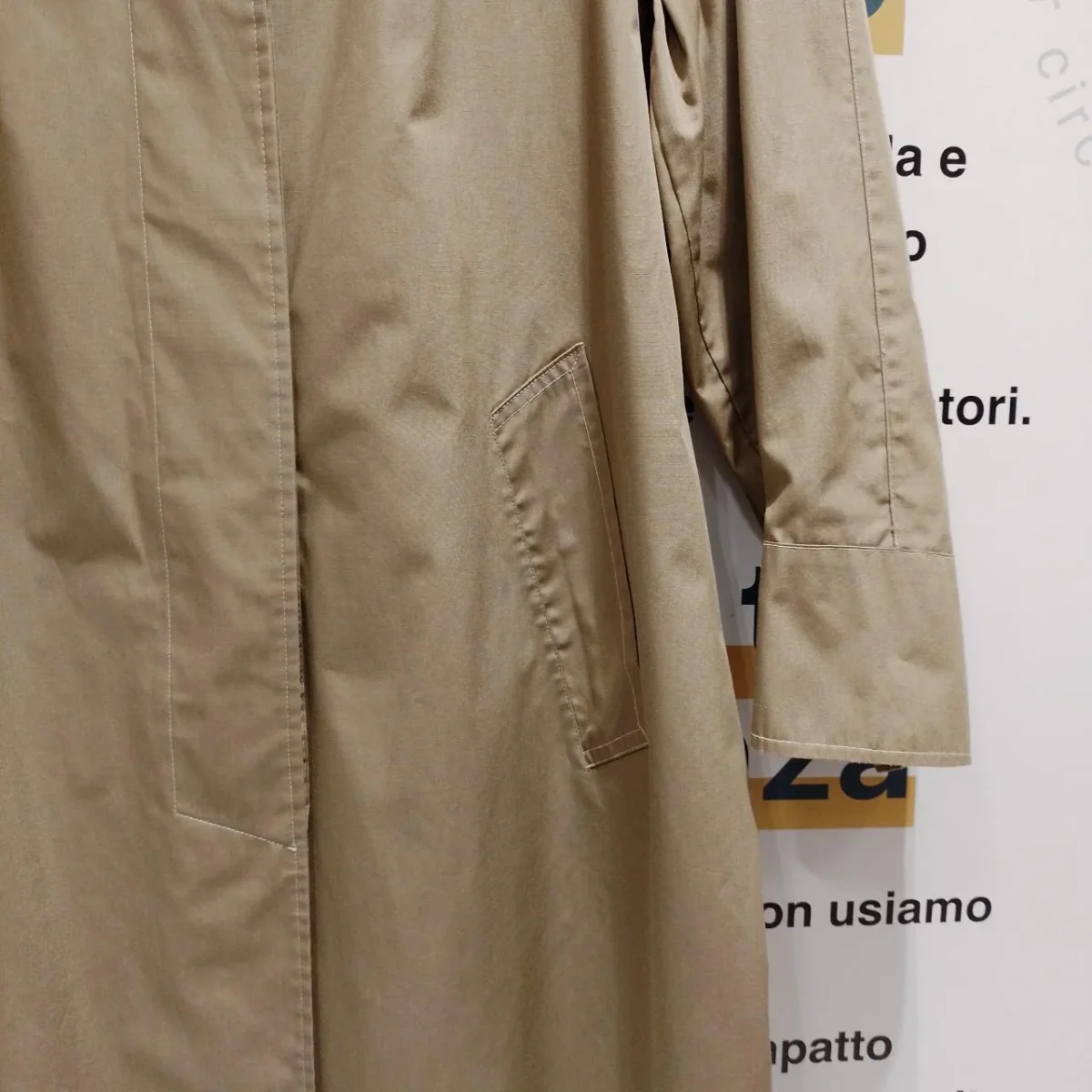Trench Vintage. Marca Nino Sepic. Taglia non presente ma a vista una L. La particolare composizione del tessuto che è 67% Diolen (fibra in poliestere) e 33% Cotone fà sì che il tessuto sia molto resstente ed inalterabile nel tempo. Colore Verde Armi chiaro. Il collo è classico con il rever piccolo e chiudibile, eventualmente, da un bottone sotto al bavero. Le maniche raglan regalano un confortevole indosso, inoltre, sotto le ascelle due piccoli triangoli di tessuto retinato aiutano la traspirazione. I quattro bottoni frontali in tonalità di colore e la finta che, una volta allacciato il capo, li cela. Due profonde tasche a filetto diagonale ed evidenziate dalla pattina. Nel retro uno spacco sormontato di cm. 27 agevola nella seduta e nel passo. I bottoni presentano delle piccole setolature, come da foto. Buone condizioni.